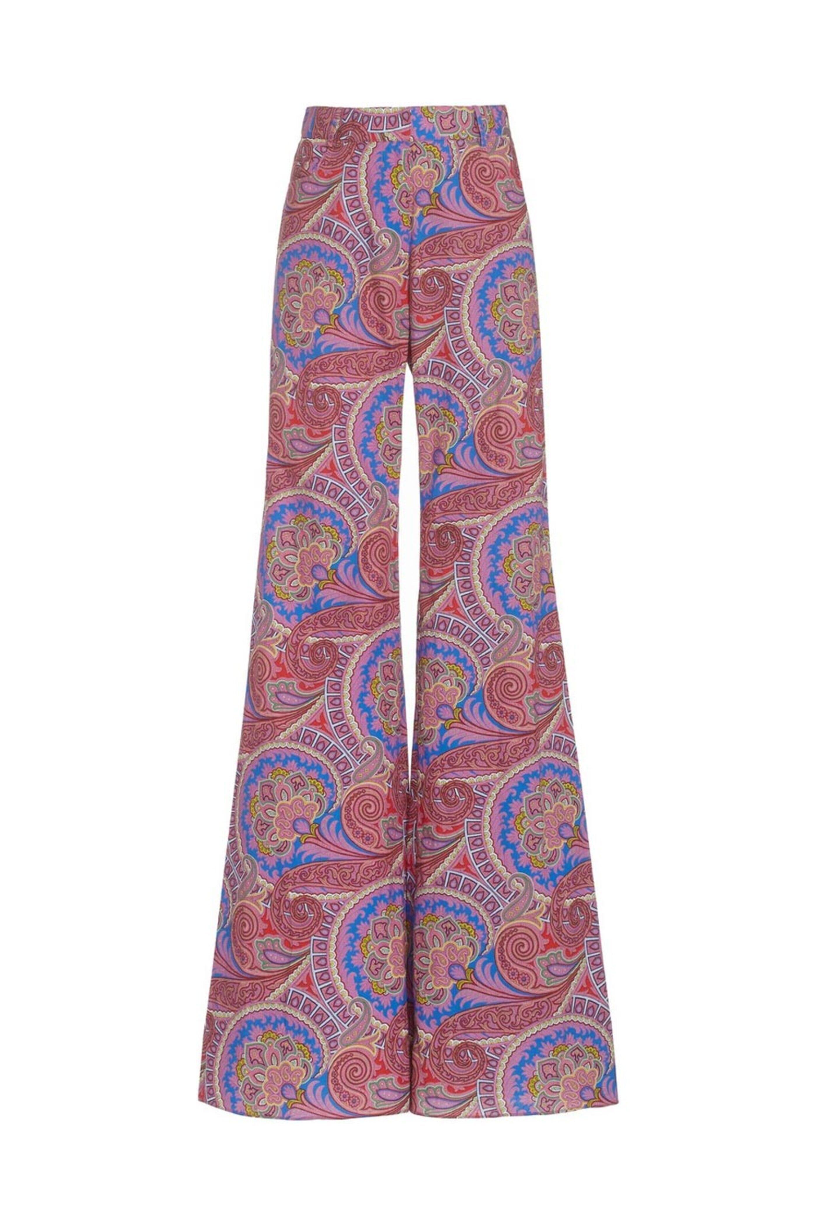 Alexis Berry Paisley Salima Pant. Flat waistband. Hook and eye closure. Zip fly. Belt loops. Wide leg; flared hem. Full length. Lined. 100% cotton outer, 100% charmeuse lining.