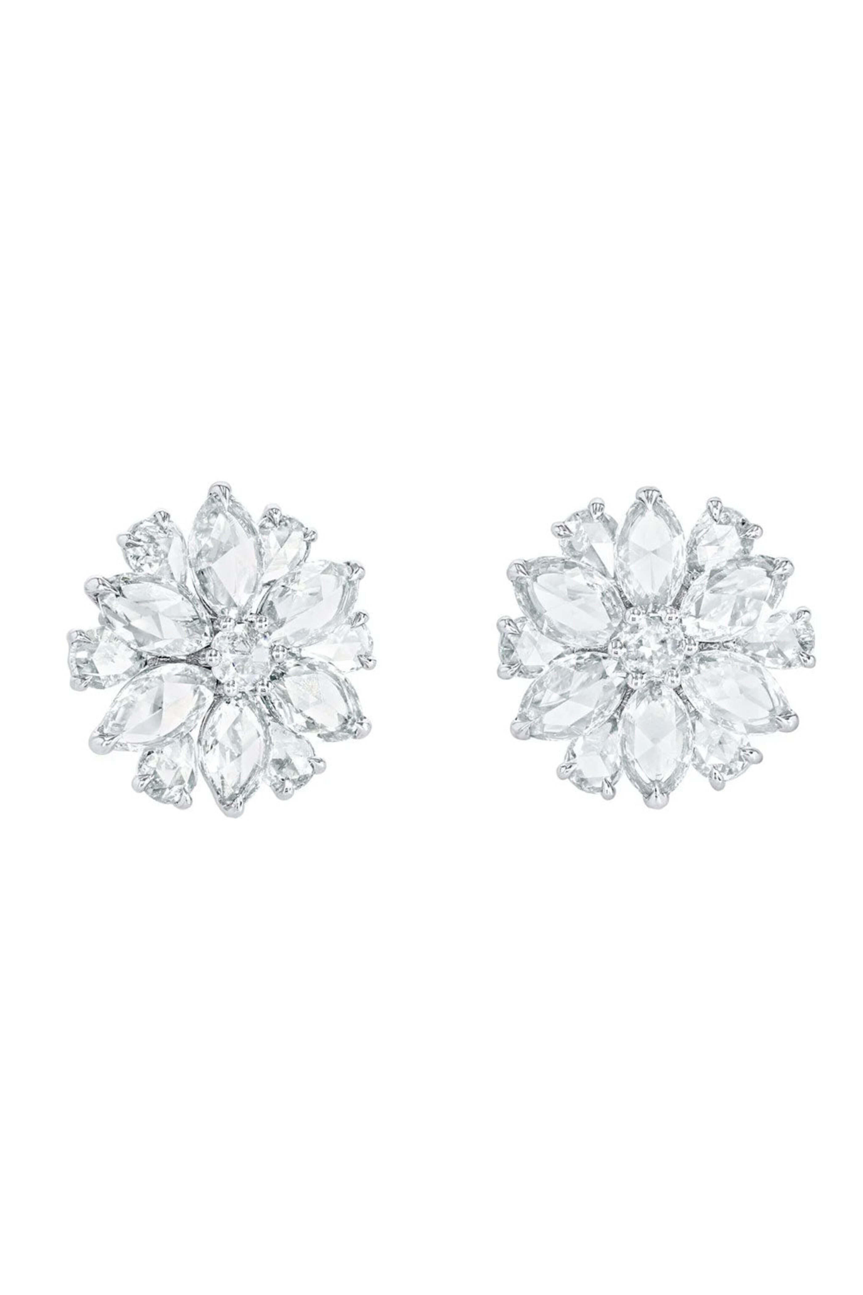 64 Facets Eclat Diamond Explosion Stud Earrings. 18k white gold . Diamond 1.75 total carat weight. Round, marquise, and pear shaped rose cut diamonds. Flower blooming design. 0.47 D. Post back.