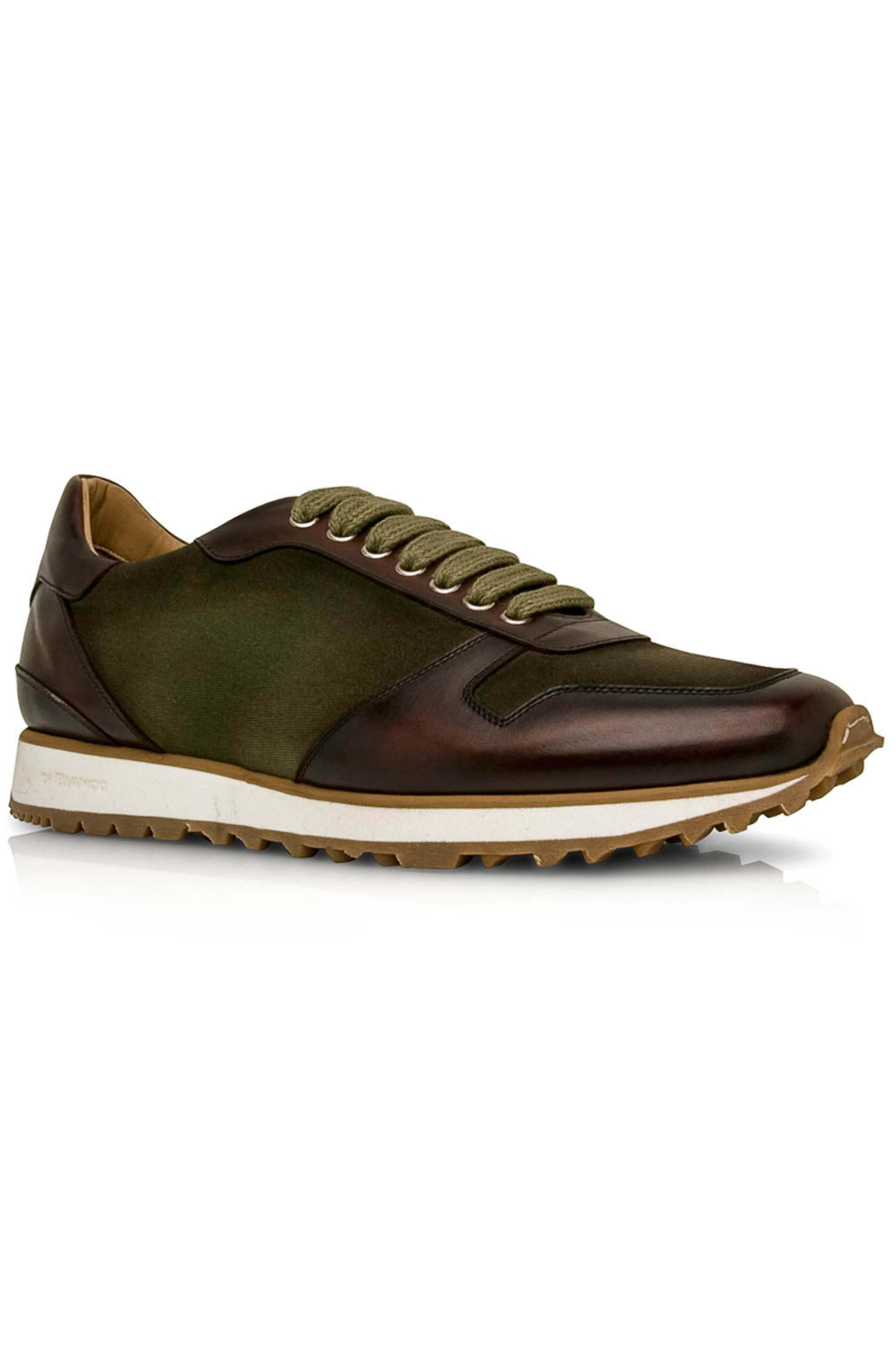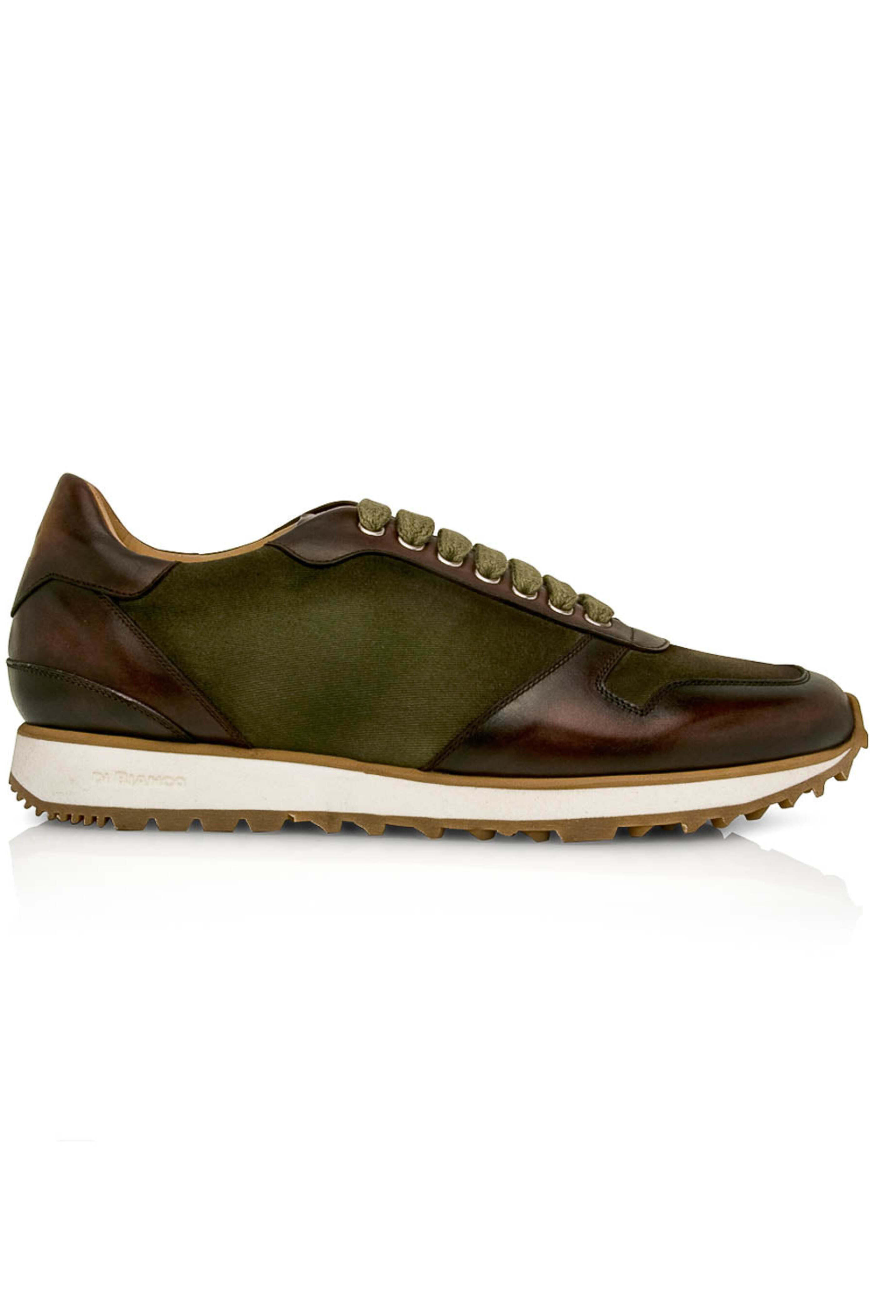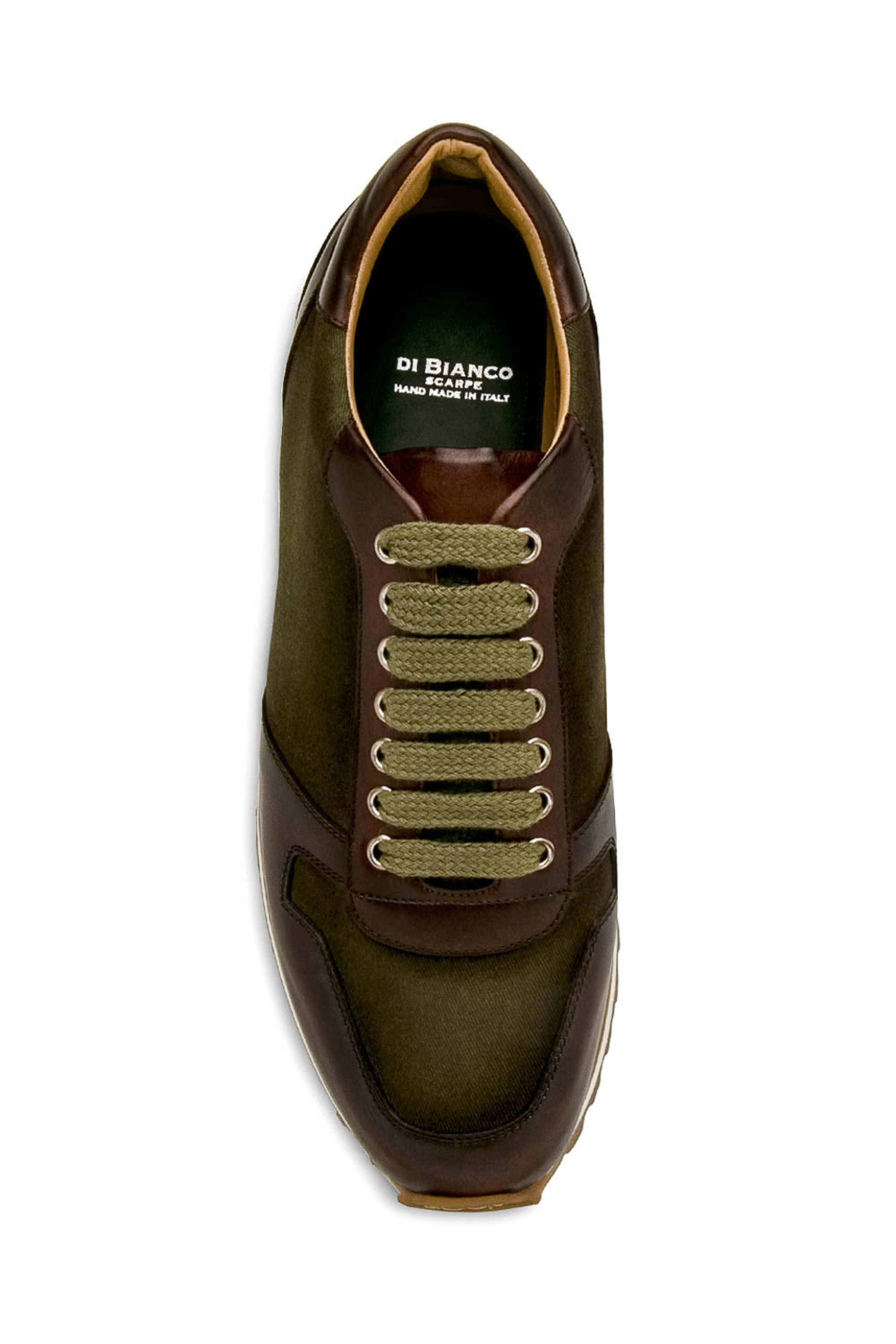 - Di Bianco Verde and Reverse Sombrero Lace Up Sneaker Leather and gabardine upper Hand burnished Lace up front Metal eyelets Flat cotton laces Rounded toe Padded tongue and collar Tonal stitching Leather lining and insole Cushioned footbed Rubber sole Made in Italy