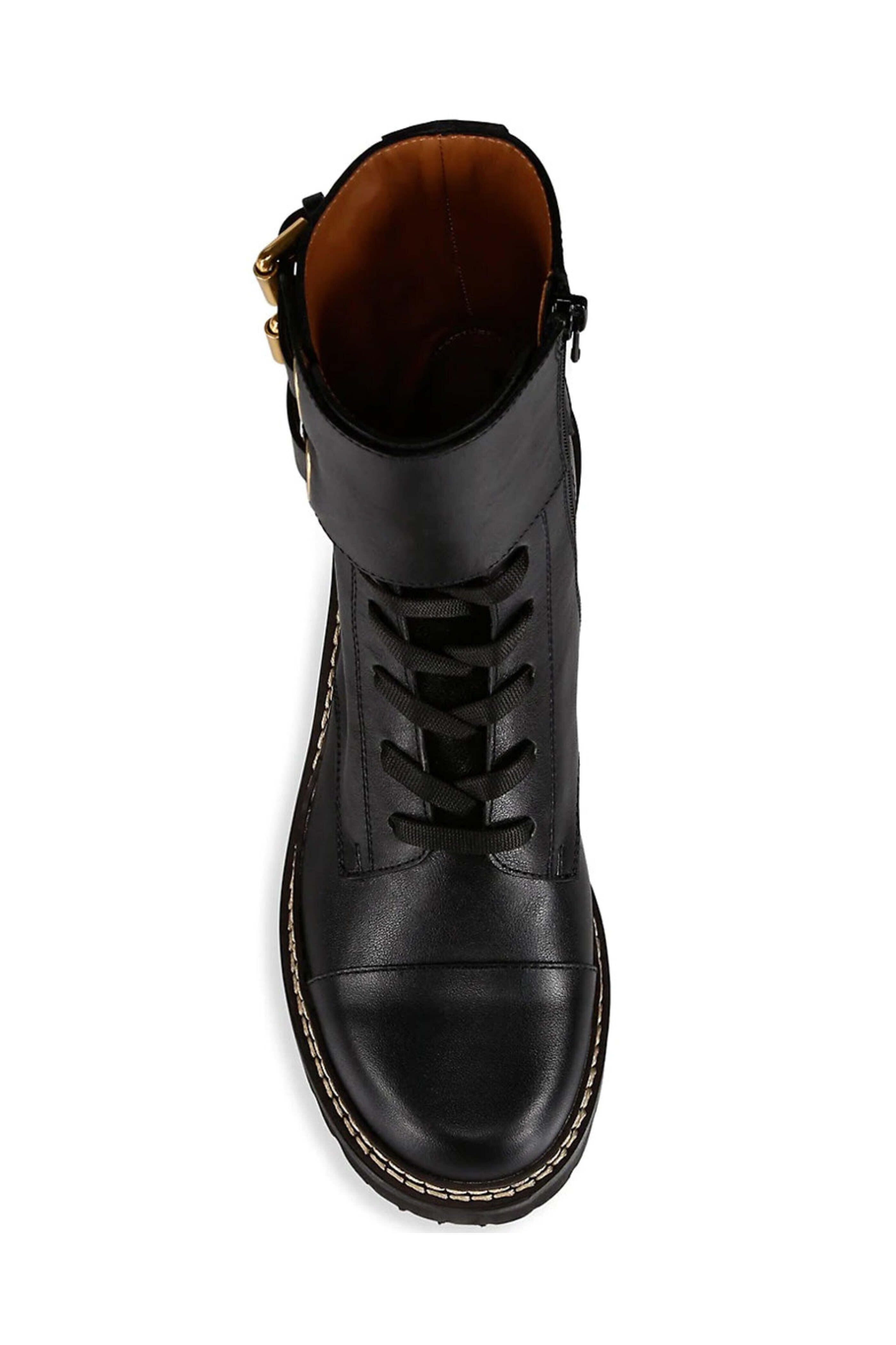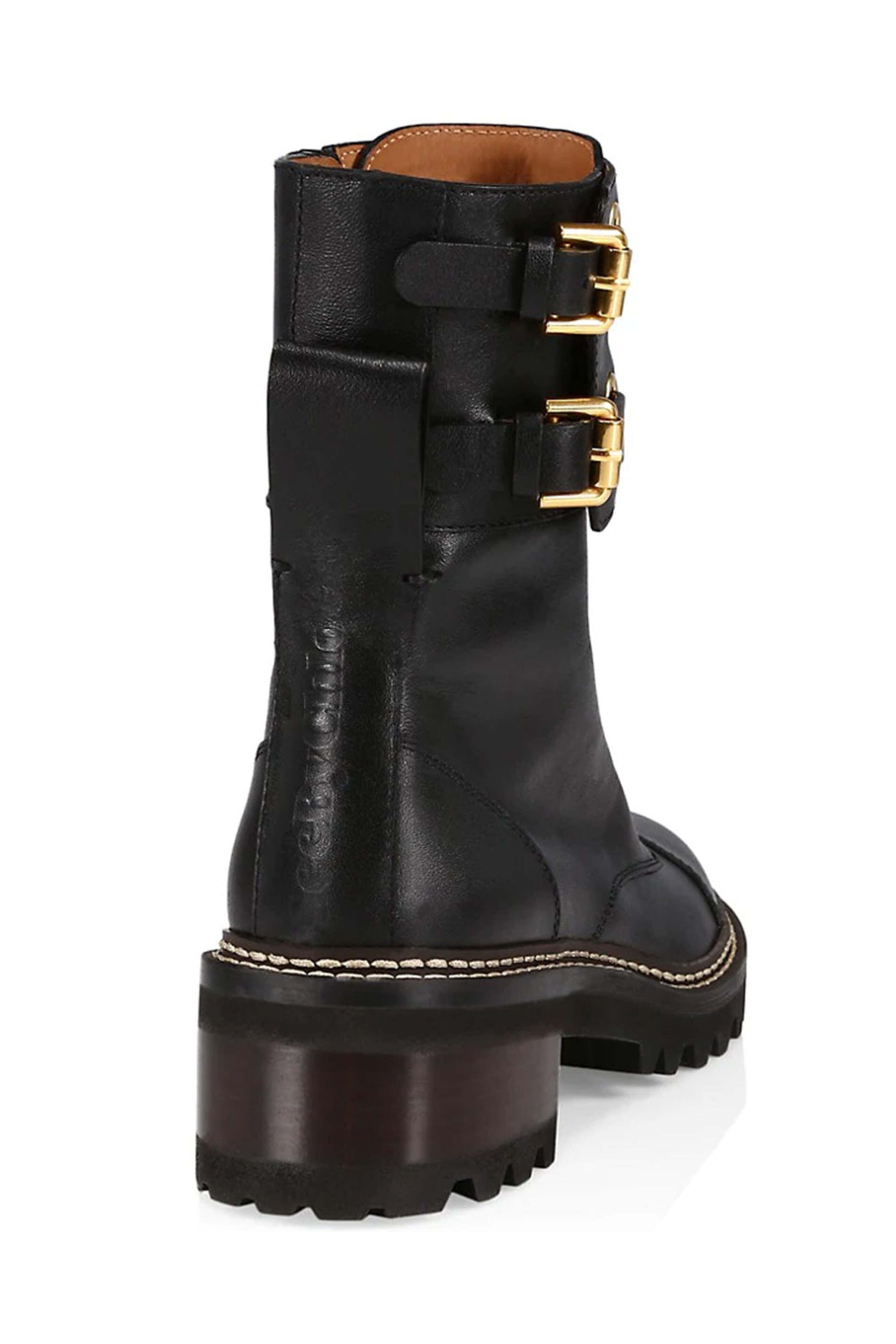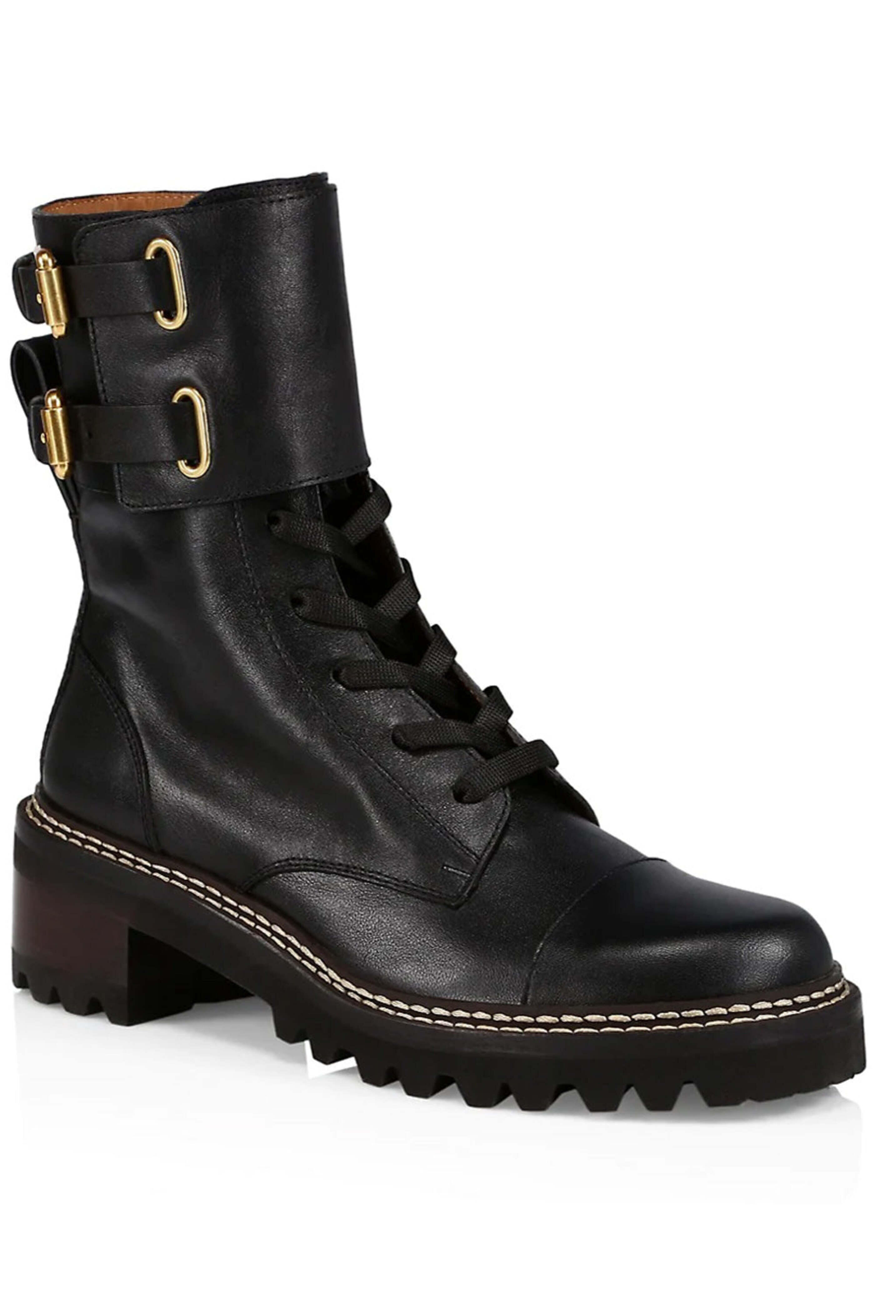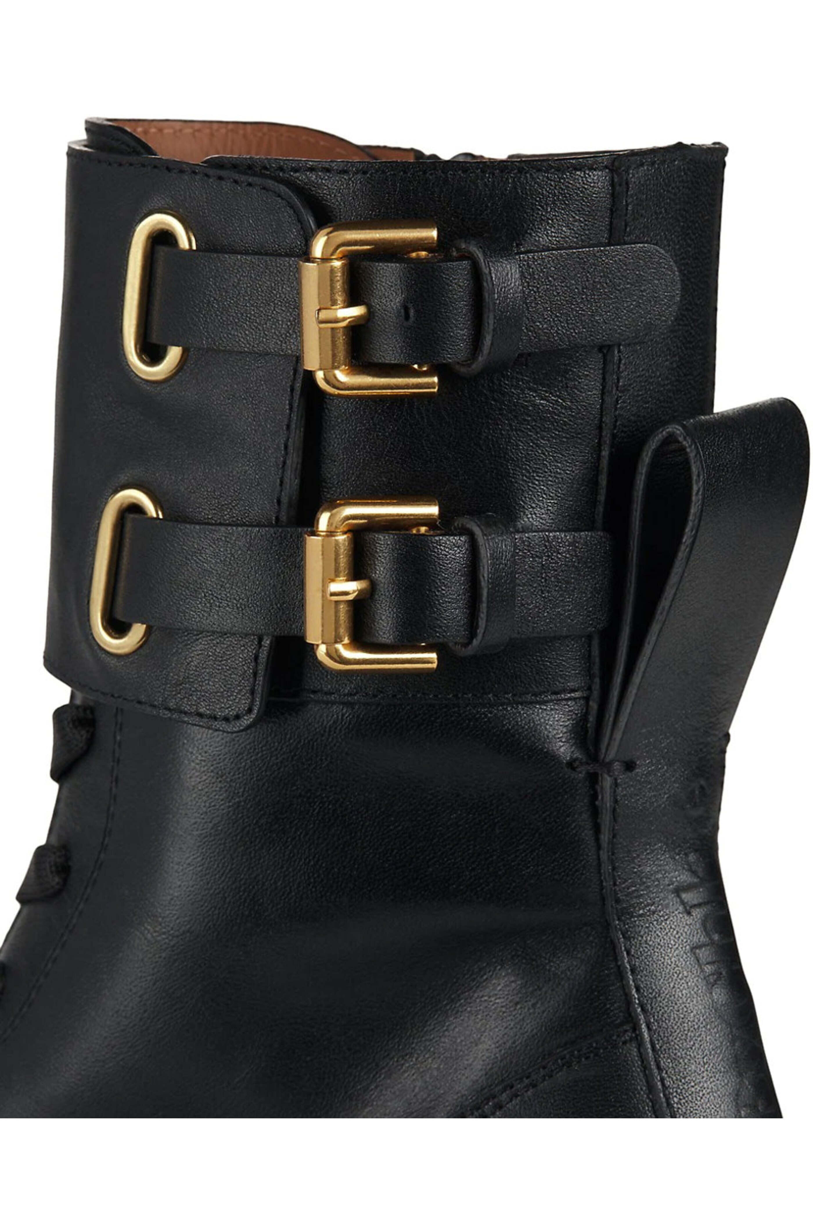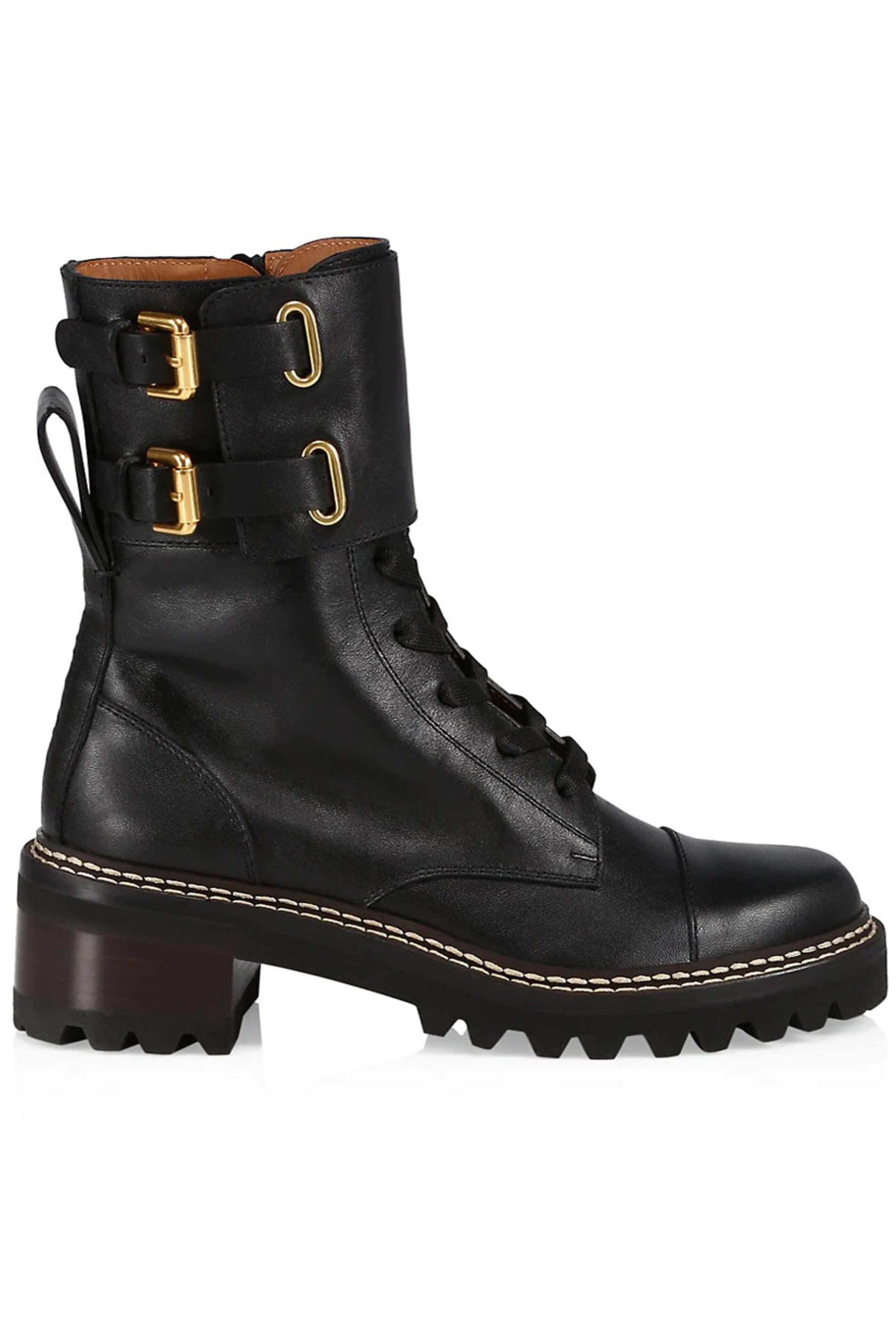 See By Chloe Black Mallory Lace Up Platform Combat Bootie. Round toe. Lace up front; side zip closure. Double buckle tab fastening. Pull tab at heel. 40mm heel height. 100% leather outer and lining. 100% rubber sole.