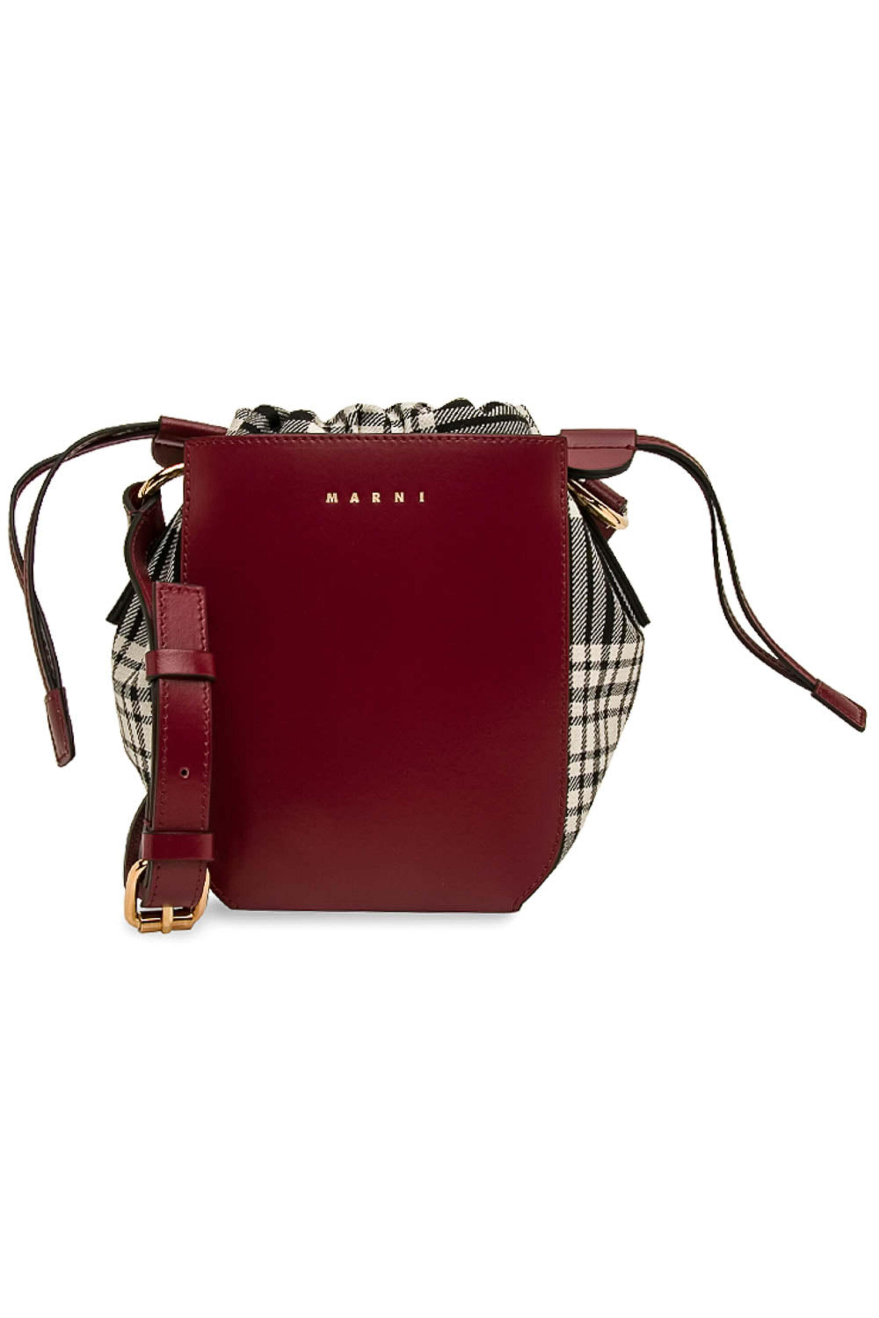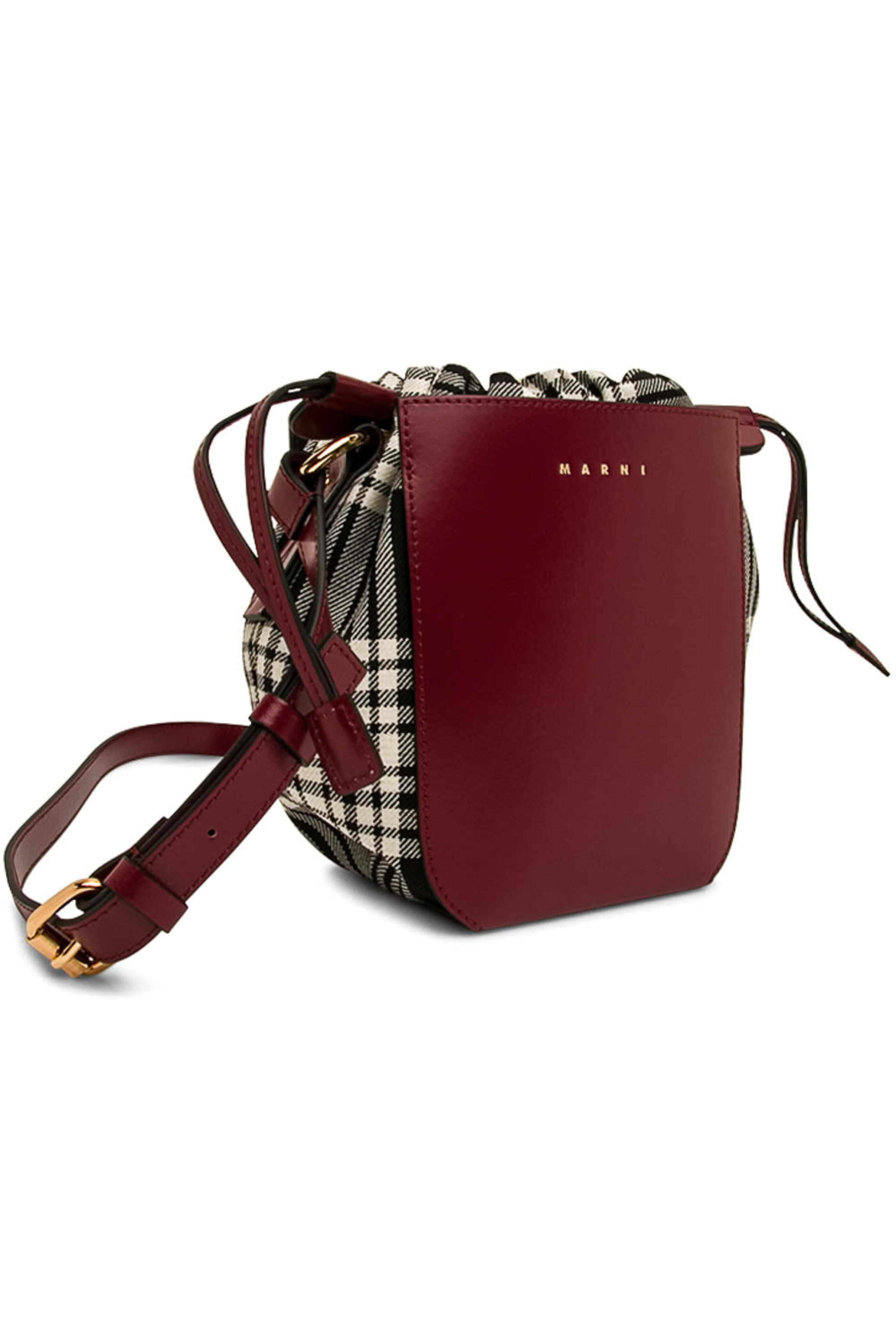 - Marni Gusset Bag in Cherry/Plaid Fabric and calfskin leather gusset bag Open top with drawstring pulls Adjustable shoulder strap Two exterior pockets Fabric lined interior One flat pocket 9 W X 8.5 T X 4.25 D Made in Italy