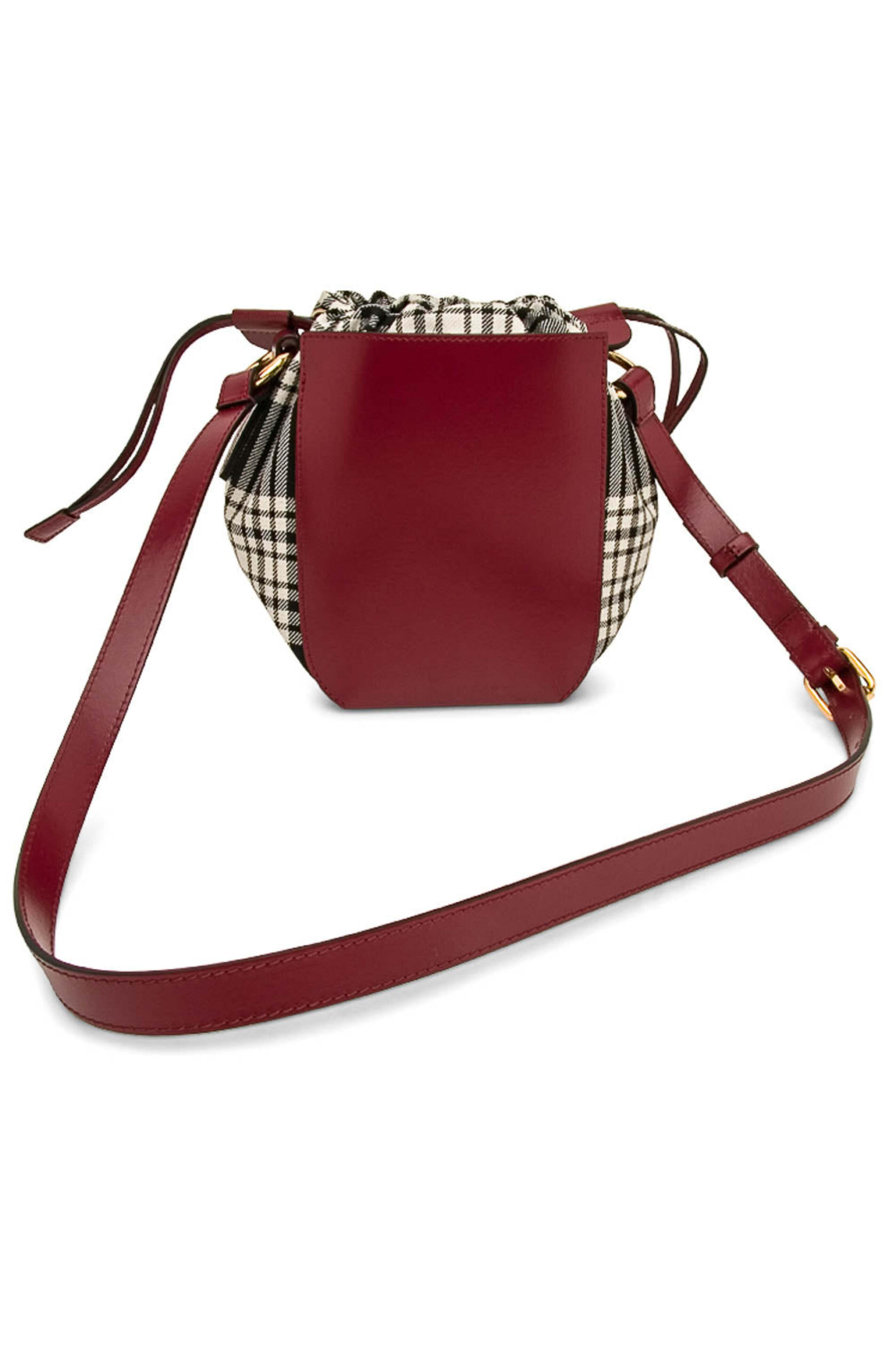 Marni Gusset Bag in Cherry/Plaid Fabric and calfskin leather gusset bag Open top with drawstring pulls Adjustable shoulder strap Two exterior pockets Fabric lined interior One flat pocket 9 W X 8.5 T X 4.25 D Made in Italy.
