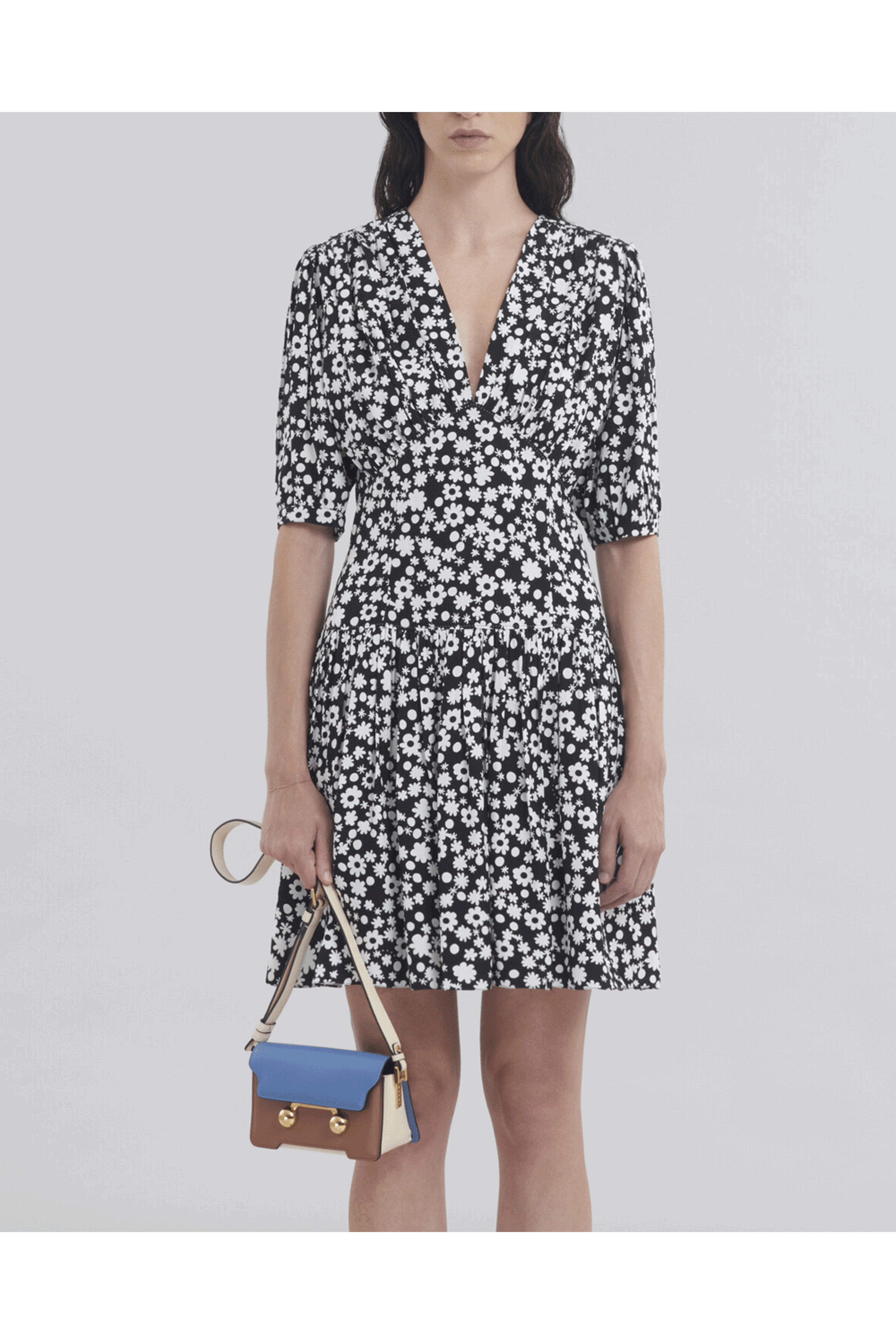Calfskin leather outer. Front flap with magnetic closure. Detachable and adjustable buckle shoulder strap. Color block design. Embellished oversized studs. Interior slip pocket. Nappa leather lining. Made in Italy. 6.7 W x 4.3 H x 3.5 D. 39 strap drop.