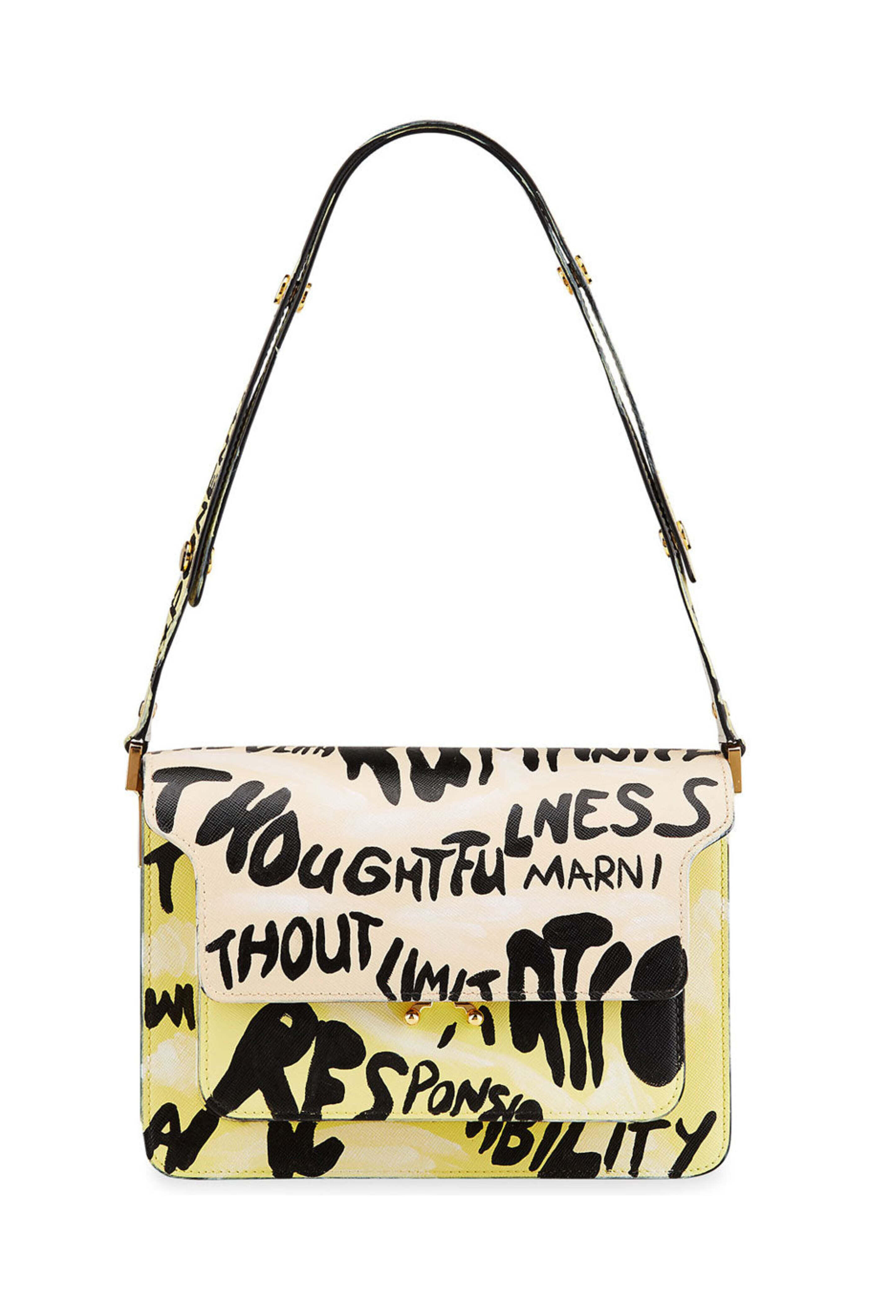 - Marni Thoughtfulness Painted Graphic Shoulder Bag Flap front with press-lock closure Four compartments Two top zip pockets Fabric lined interior Adjustable shoulder strap Exterior flat back pocket 9 W X 6.5 T X 4 D Made in Italy