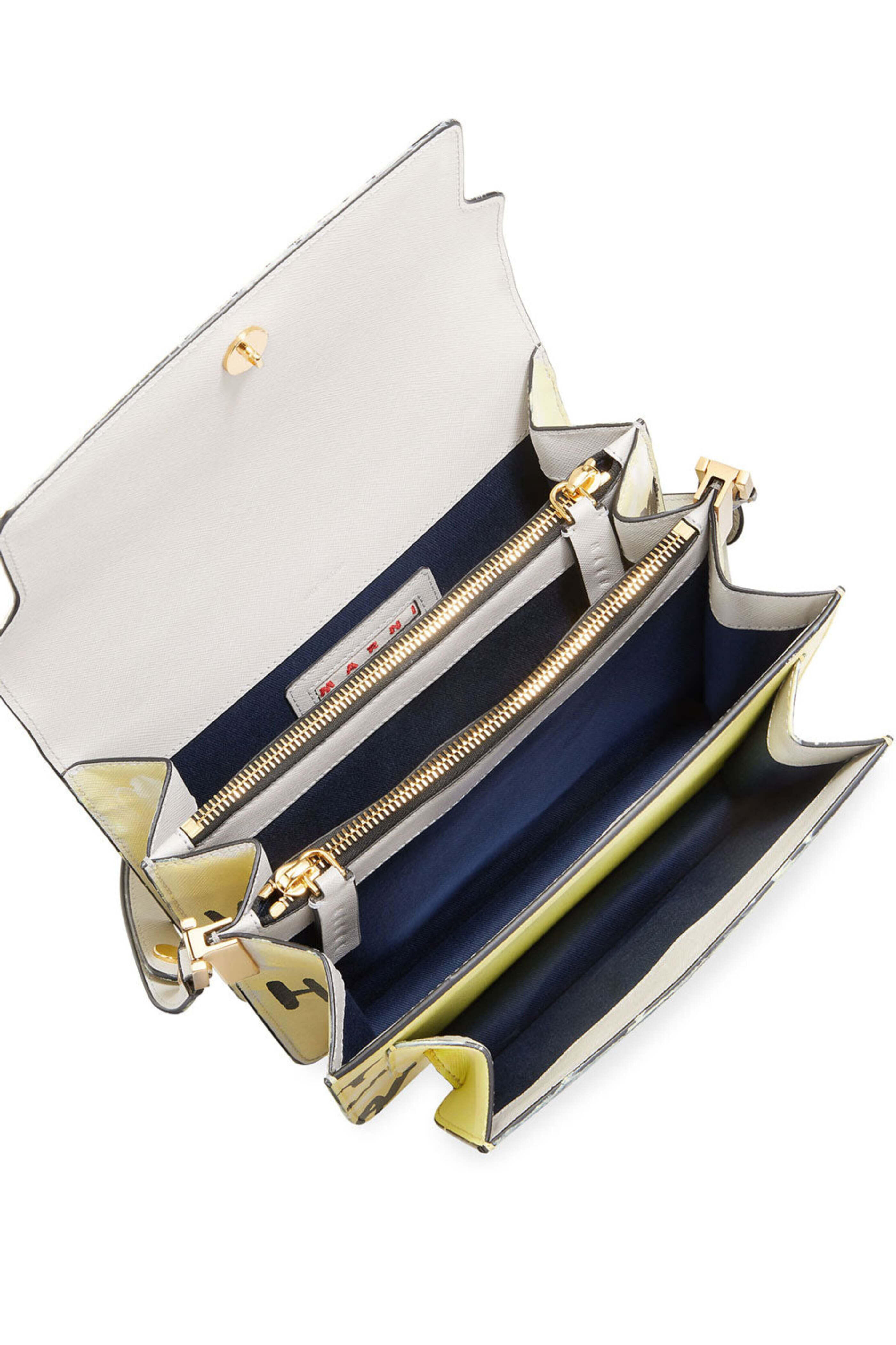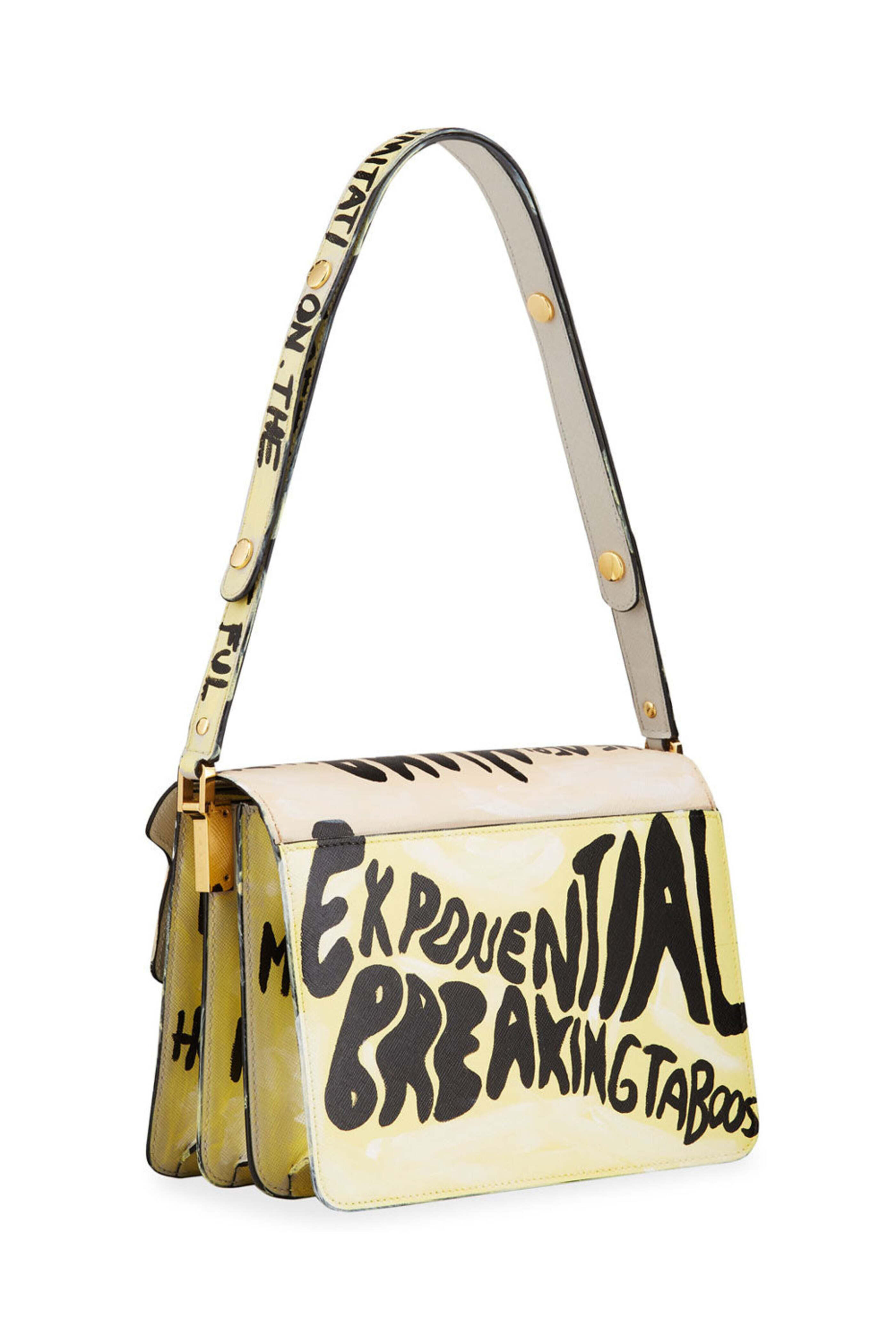 Marni Thoughtfulness Painted Graphic Shoulder Bag Flap front with press-lock closure Four compartments Two top zip pockets Fabric lined interior Adjustable shoulder strap Exterior flat back pocket 9 W X 6.5 T X 4 D Made in Italy.