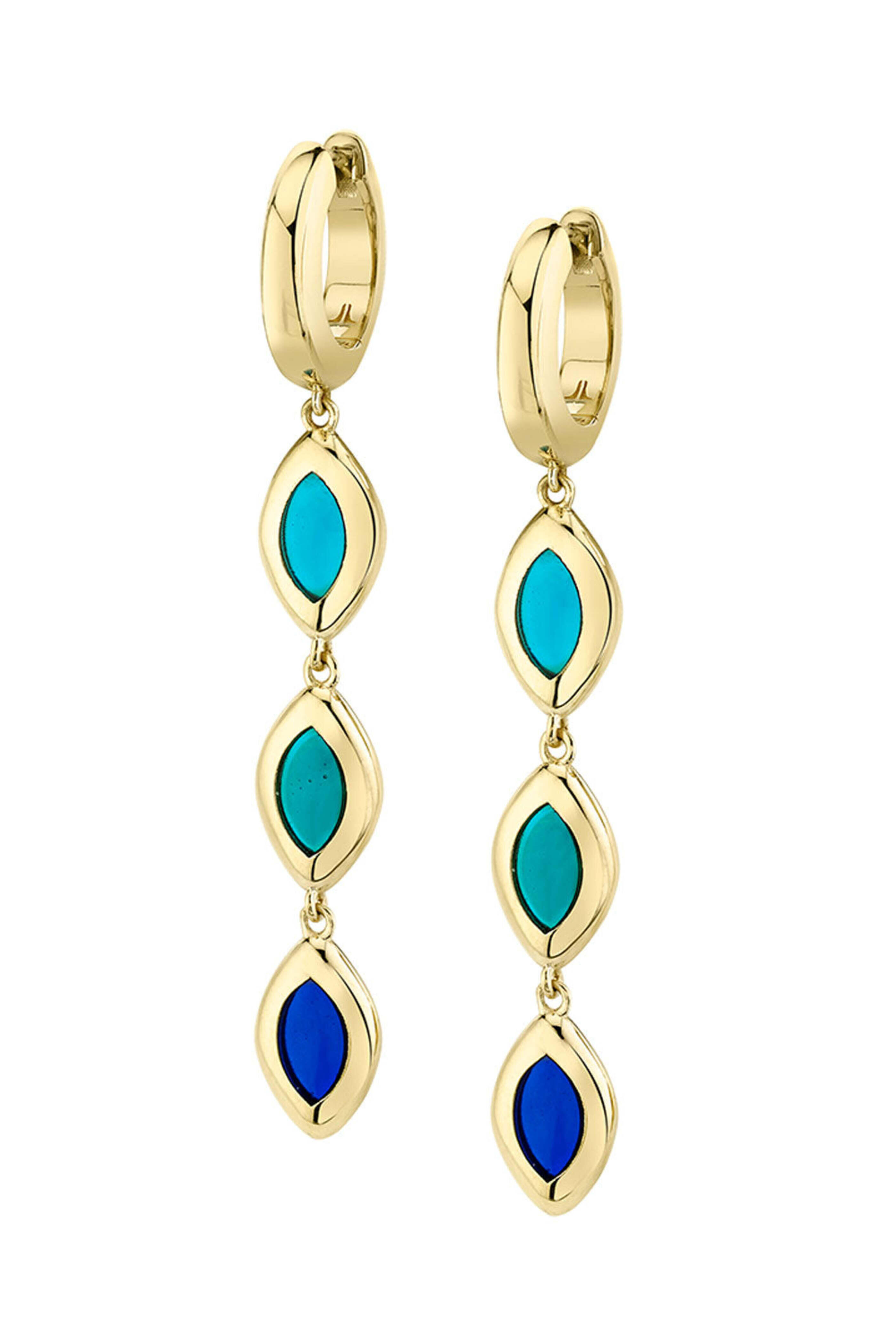 - Andy Lif Shades of Blue Enamel Huggie Hoop Drop Earrings 18k yellow gold Light and dark blue plique-a-jour enamel Translucent enamel windows Huggie hoop top Triple drop design Chain link connections Drop length: 1.57 Post backs with push latch closure Speed of Color Remastered Collection Handmade in Los Angeles