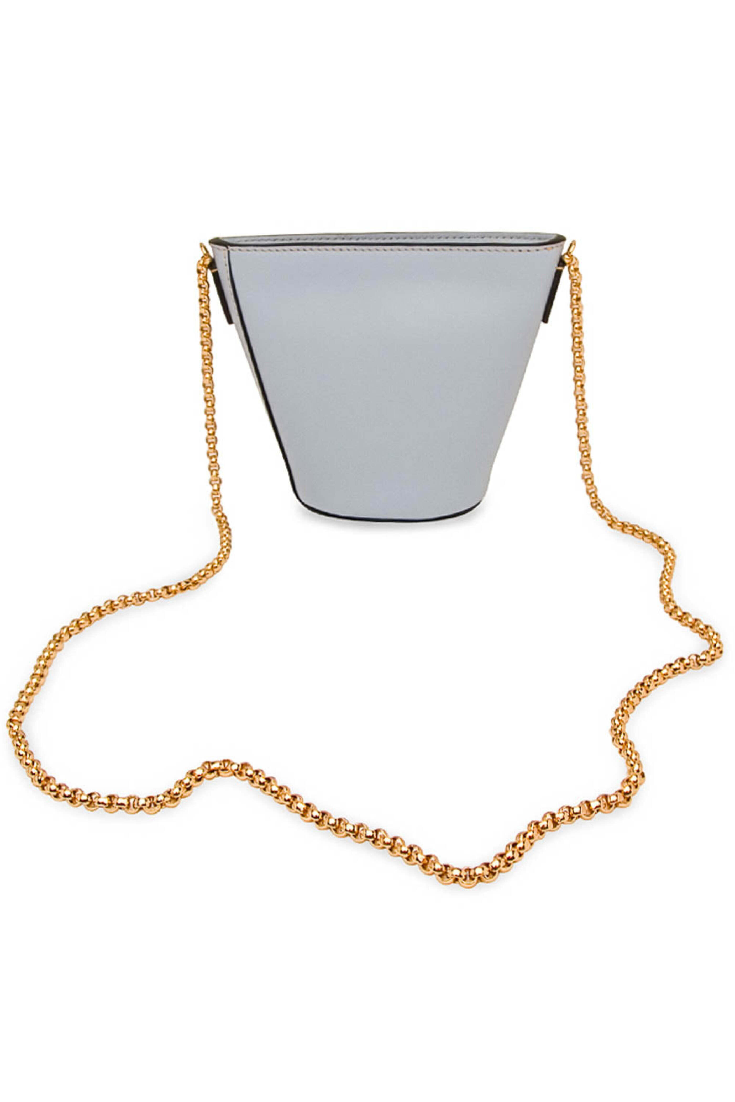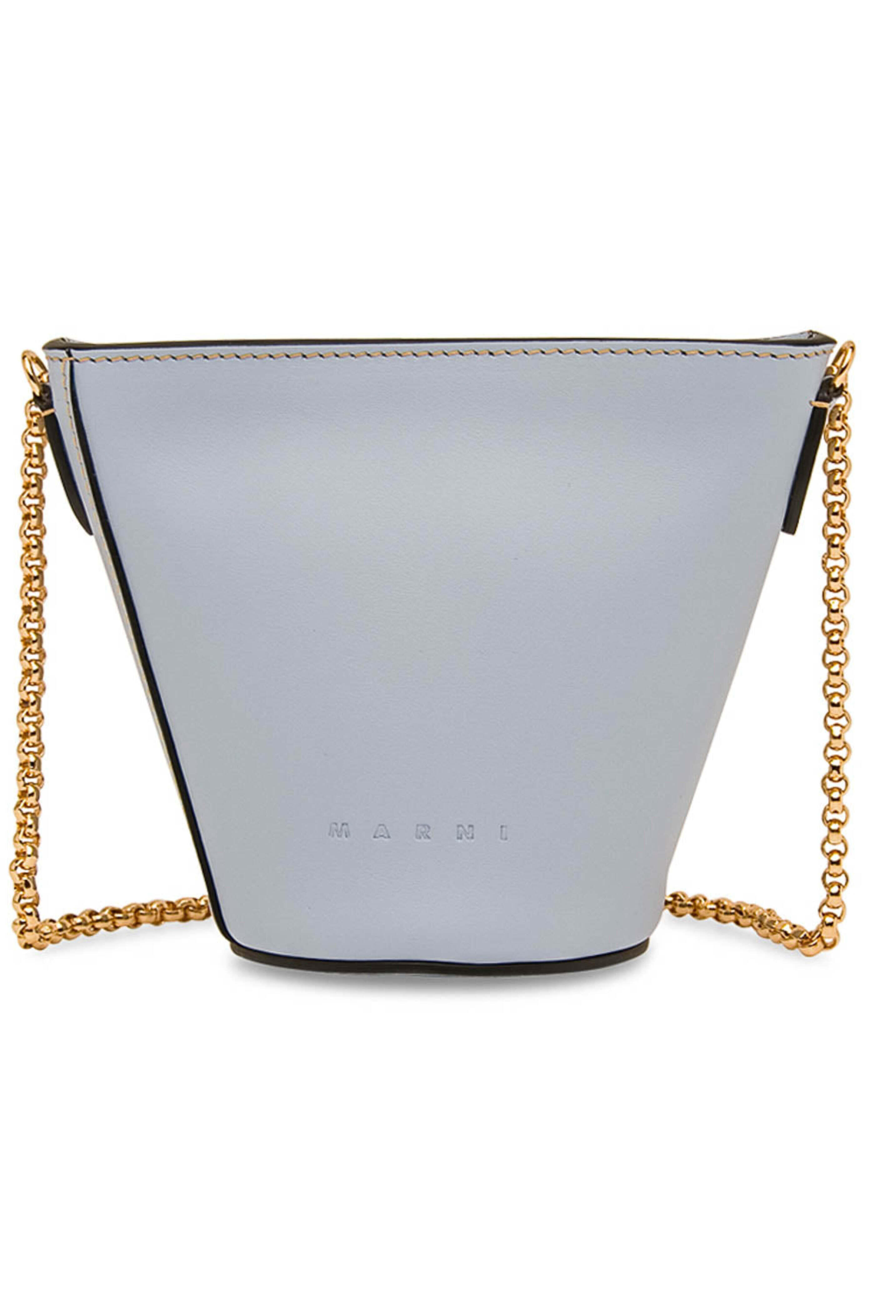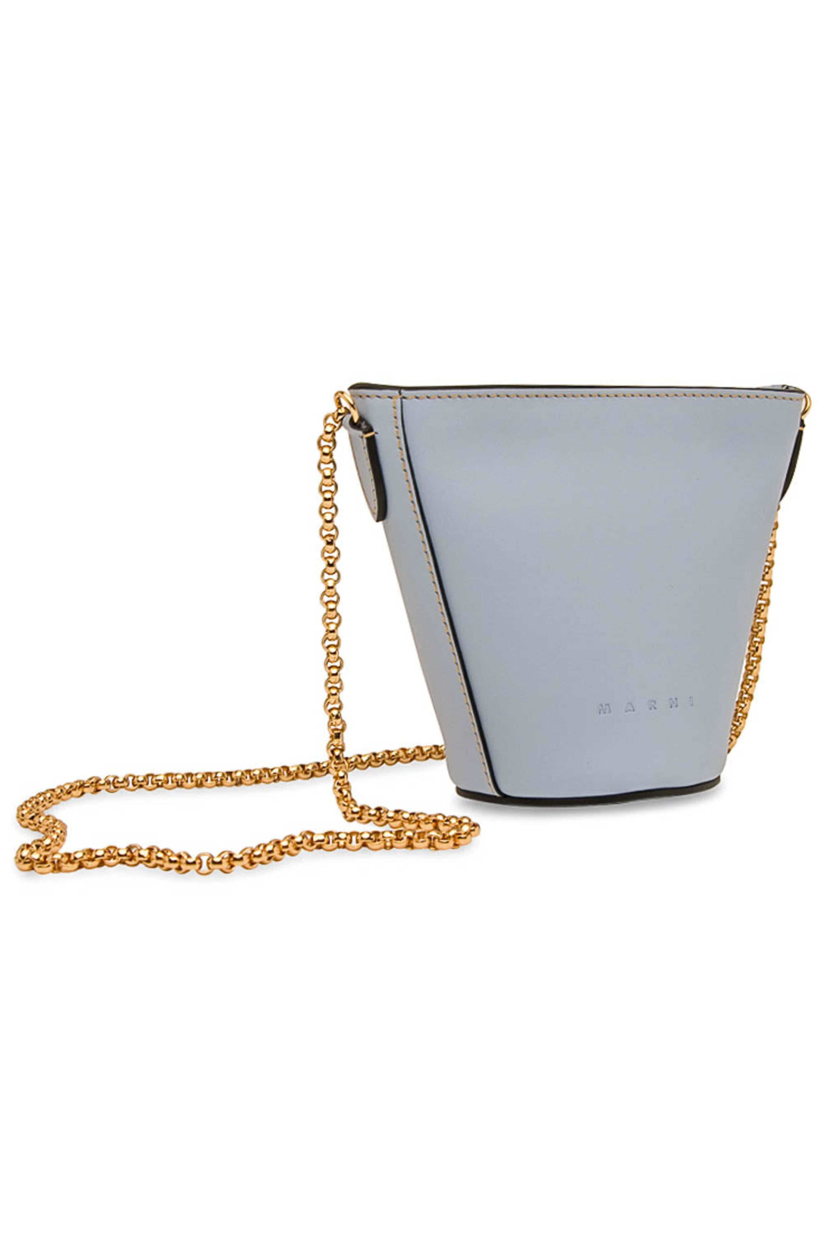 Marni Depot Nano Crossbody in Light Blue Leather crossbody bag Top zip closure Chain strap Fabric lined interior Tonal stitching 6 W X 5 T X 3 D Made in Italy.