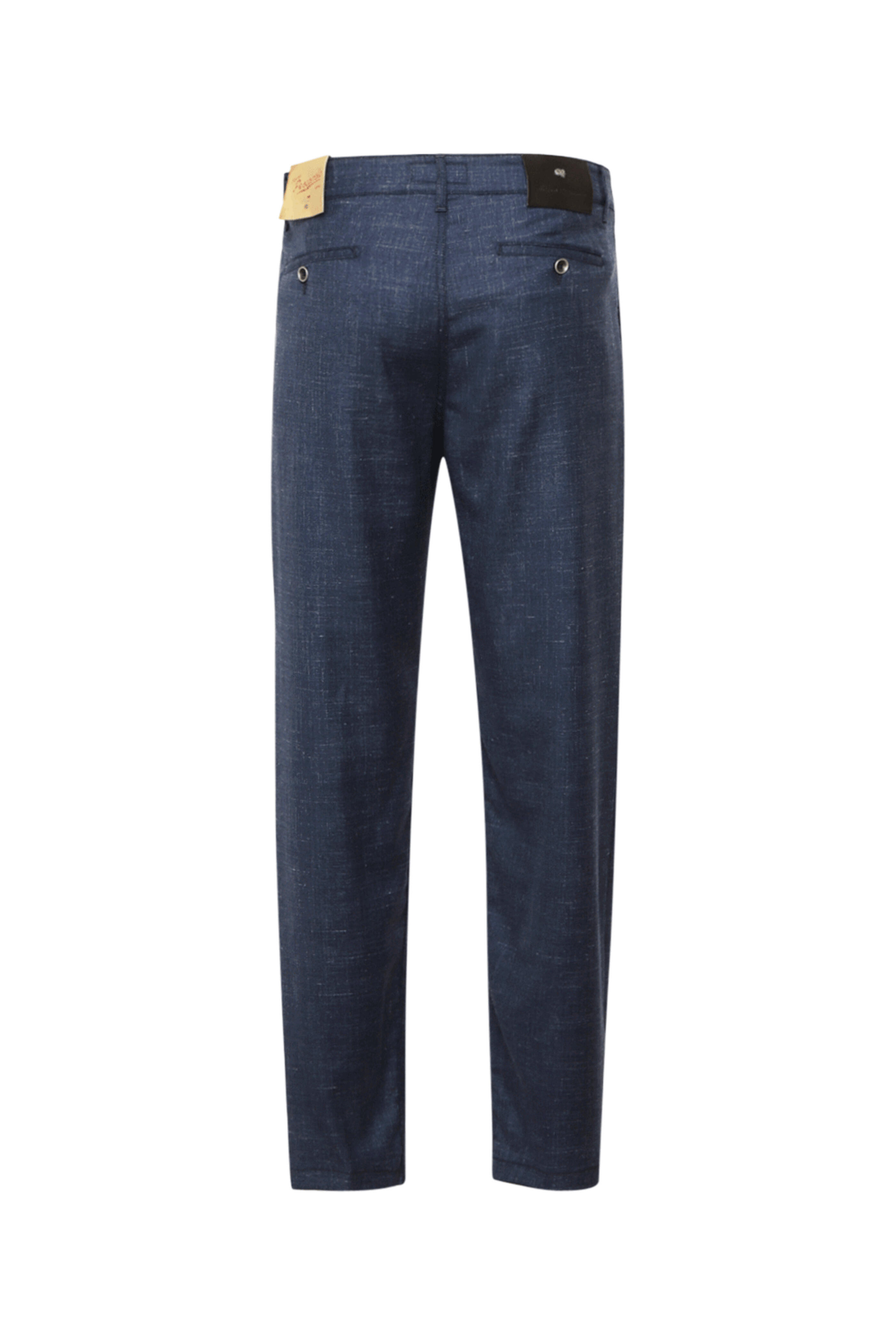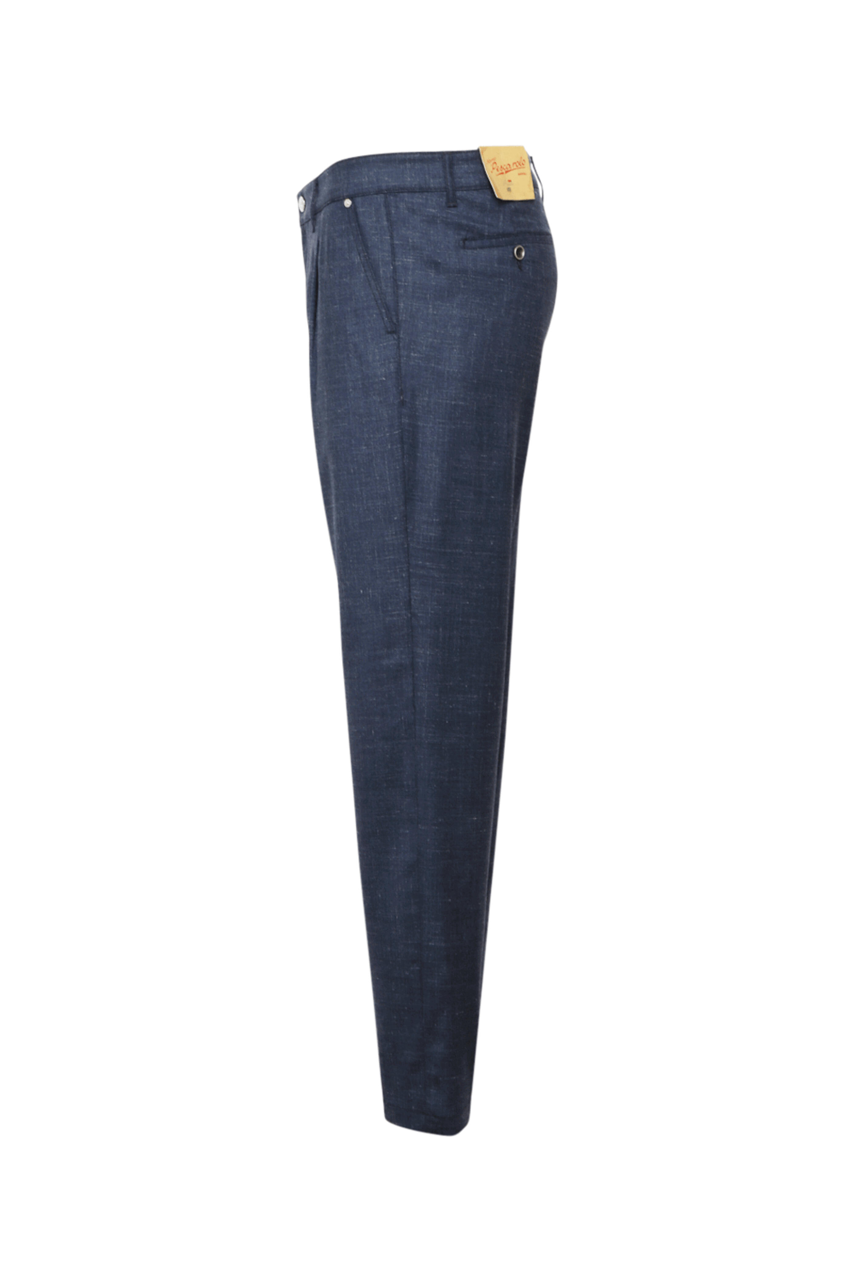 Marco Pescarolo Navy Blue Wool Dress Pant. Single pleat front. Zip fly¯ . Single button closure¯ . Belt loops. Side pockets. Back welt pockets with button. Logo patch on back. Finished hem . Fully lined . Cotton lined. Made in Italy . 71% wool, 17% silk, 11% linen, 1% elastane.