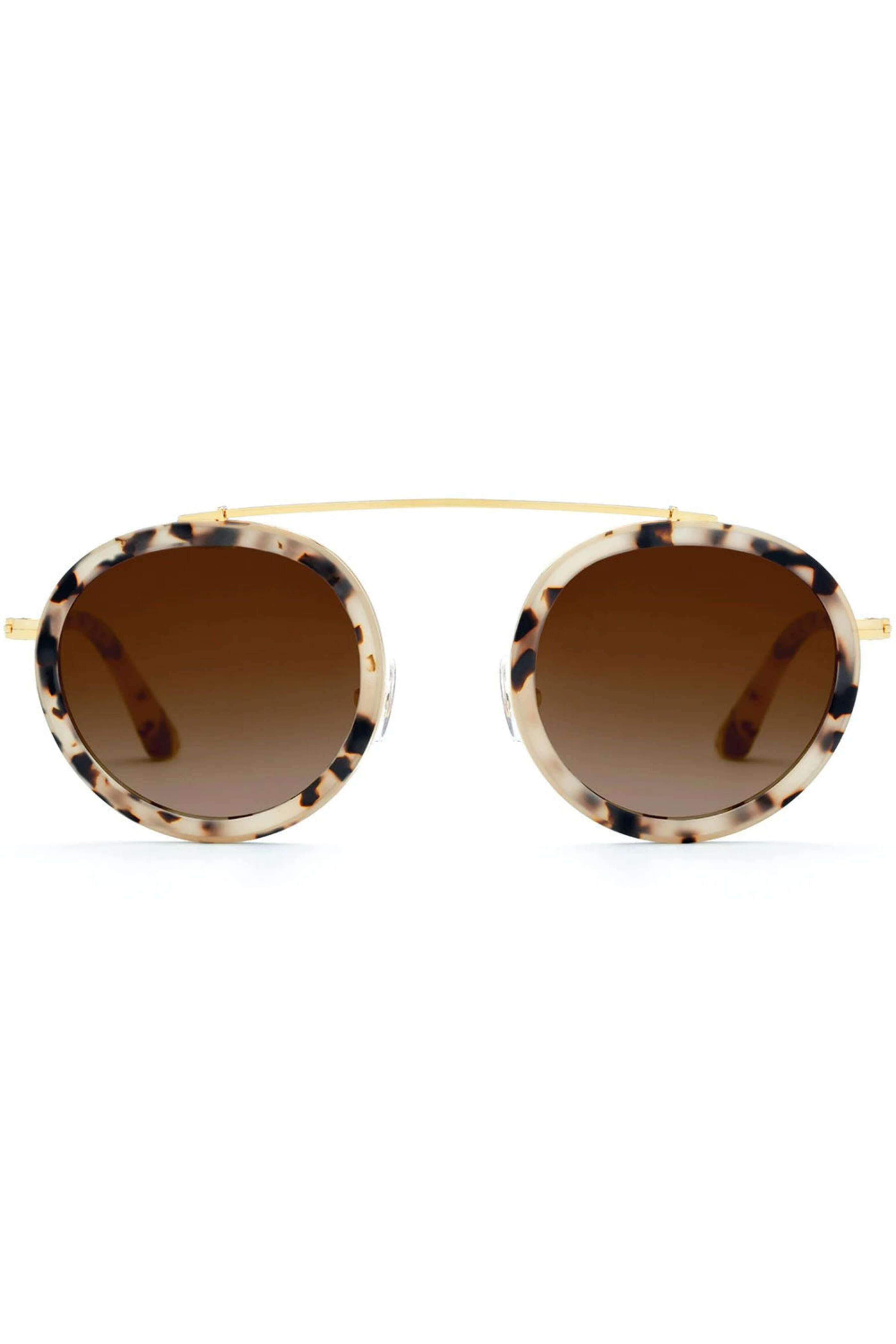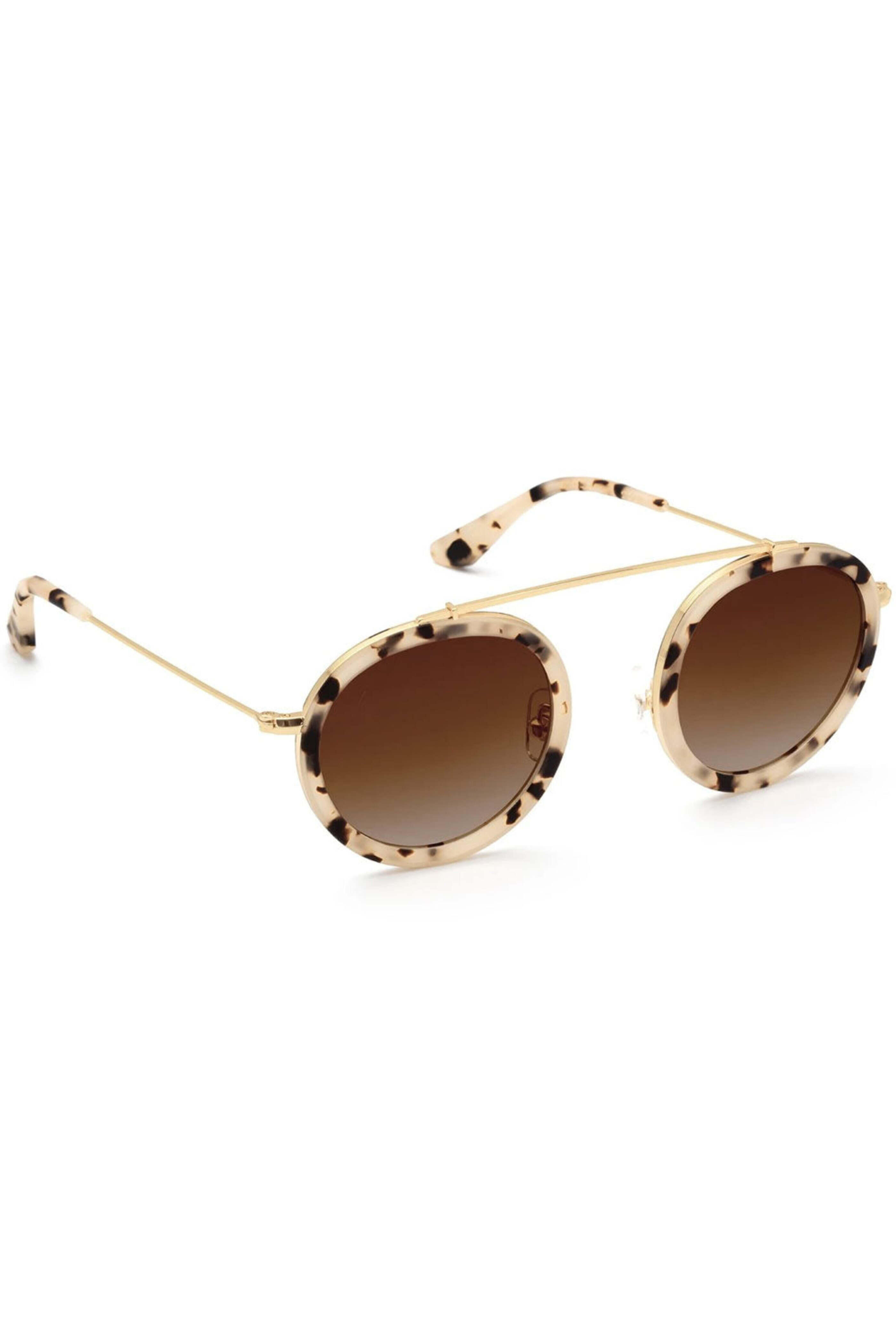 KREWE Conti Sunglasses in Matte Oyster. Rounded bridge with brow bridge. Amber gradient lens. 24K gold plated stainless steel hardware. Handcrafted acetate frames. Size: 47-24-145 mm. 100% UVA/UVB protection.