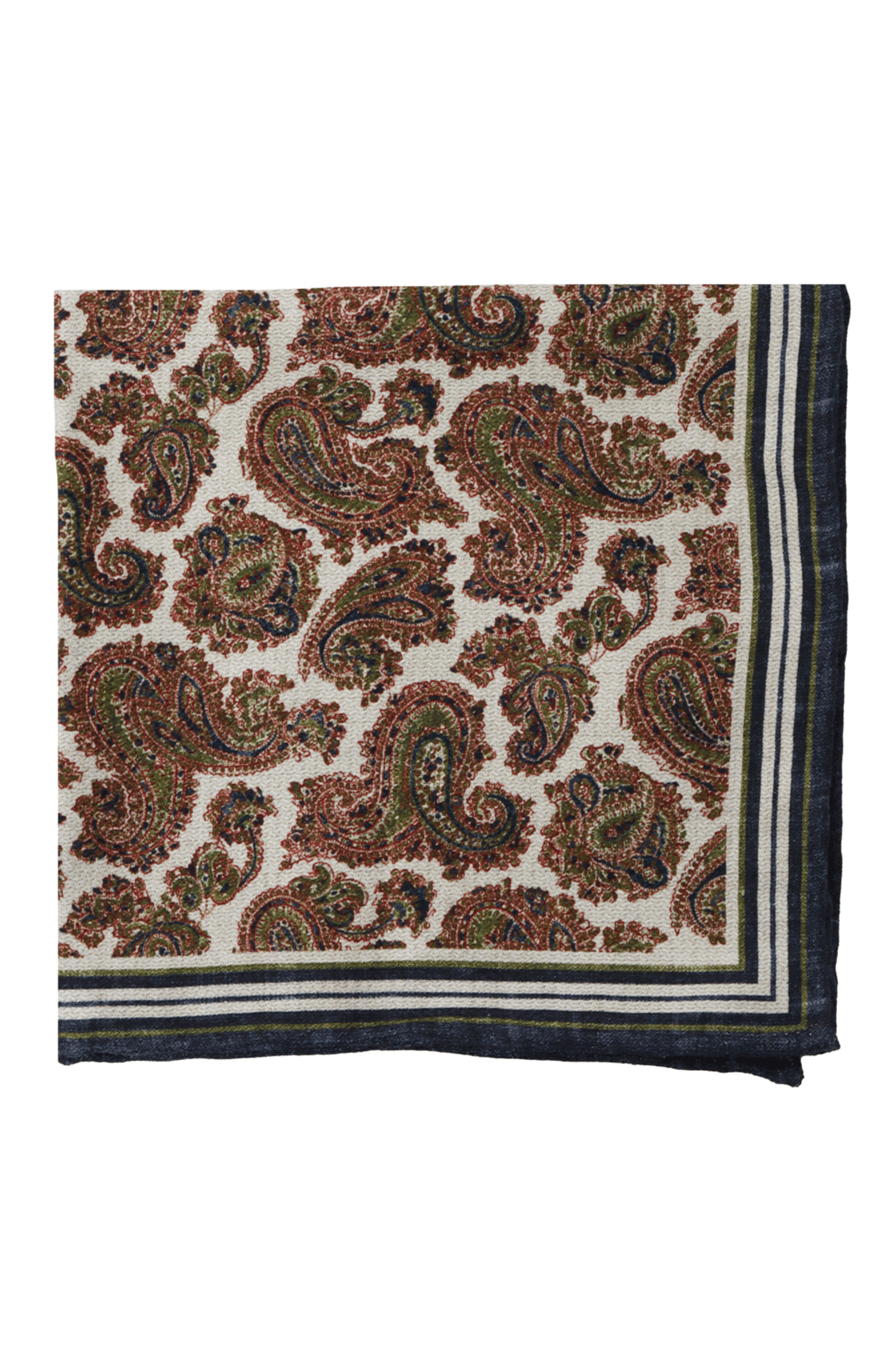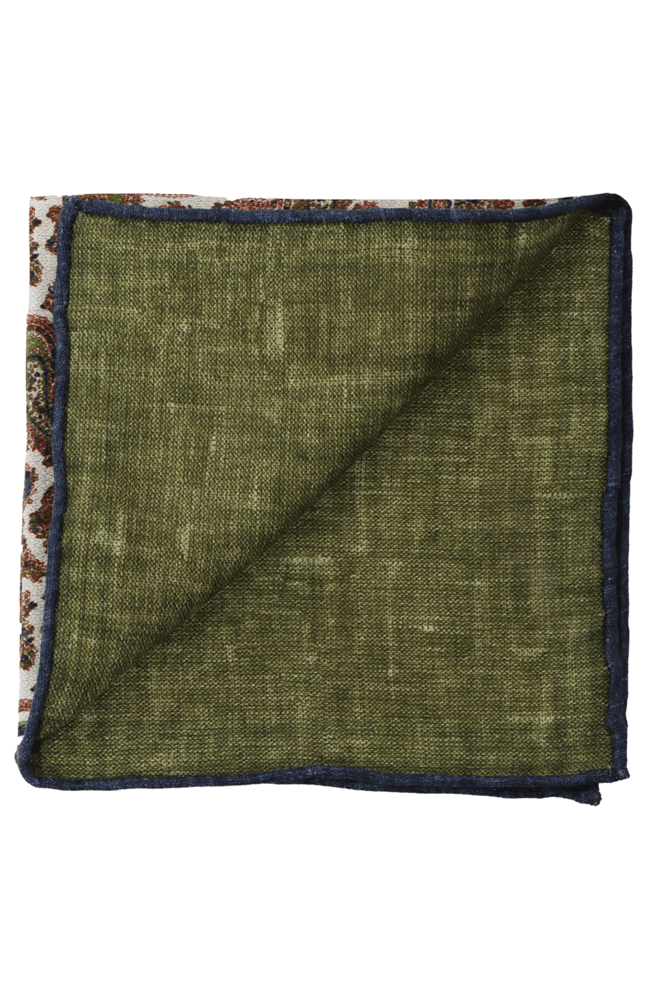 Edward Armah Green and Cream Paisley Pocket Square. 12 W x 12 L. Reversible. Made in Italy. 100% Silk.