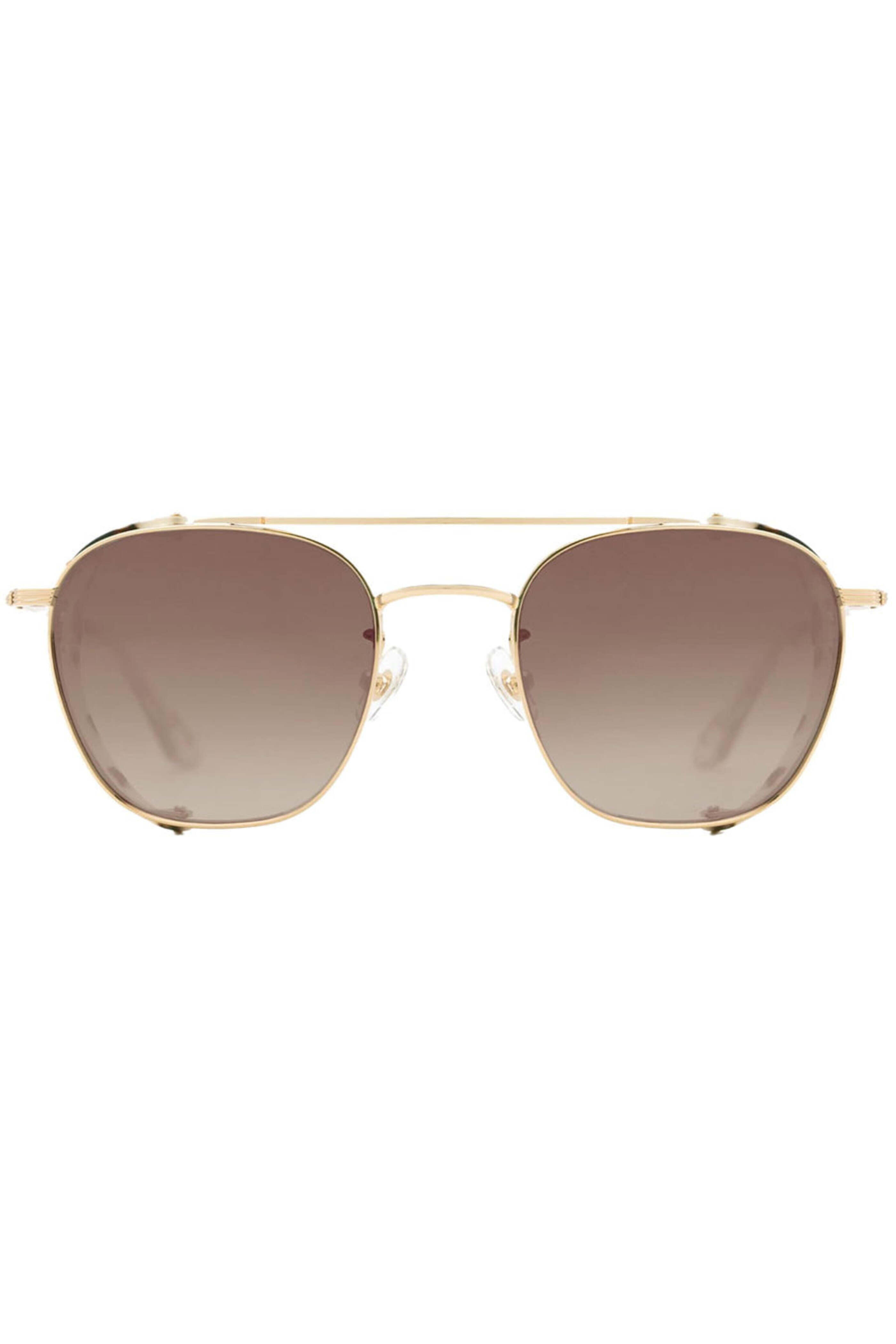 KREWE Earhart Blinker Sunglasses in Matte Oyster and Petal. Amber silver gradient mirrored lens. 24K gold plated stainless steel hardware. Handcrafted, luxury stainless steel sunglasses. Premium hard case. Microfiber cleaning cloth. Size: 53-21-145. 100% UVA / UVB protection.