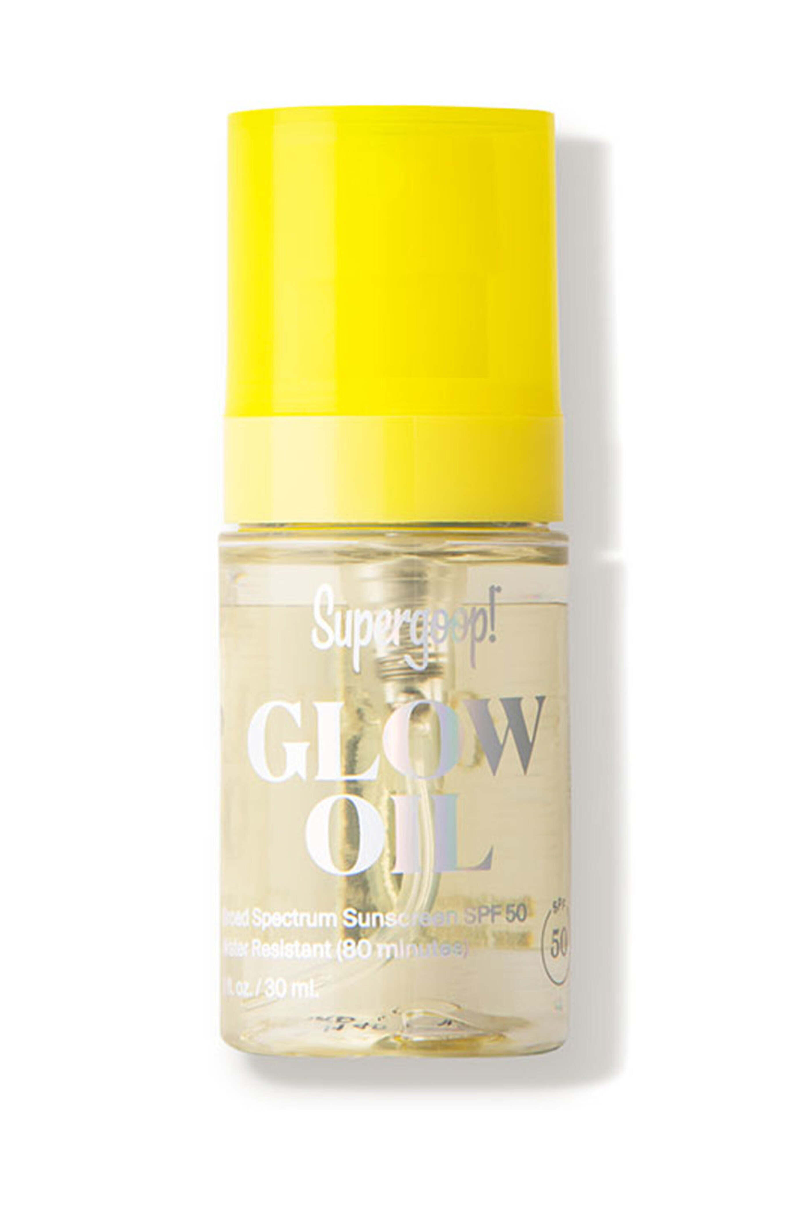 - Supergoop! Glow Oil SPF 50 Water-resistant lightweight oil Diminishes signs of UV damage Includes meadowfoam seed oil~ marigold extract and grape seed oil Sulfate~ gluten~ fragrance~ and cruelty free 1 fl oz