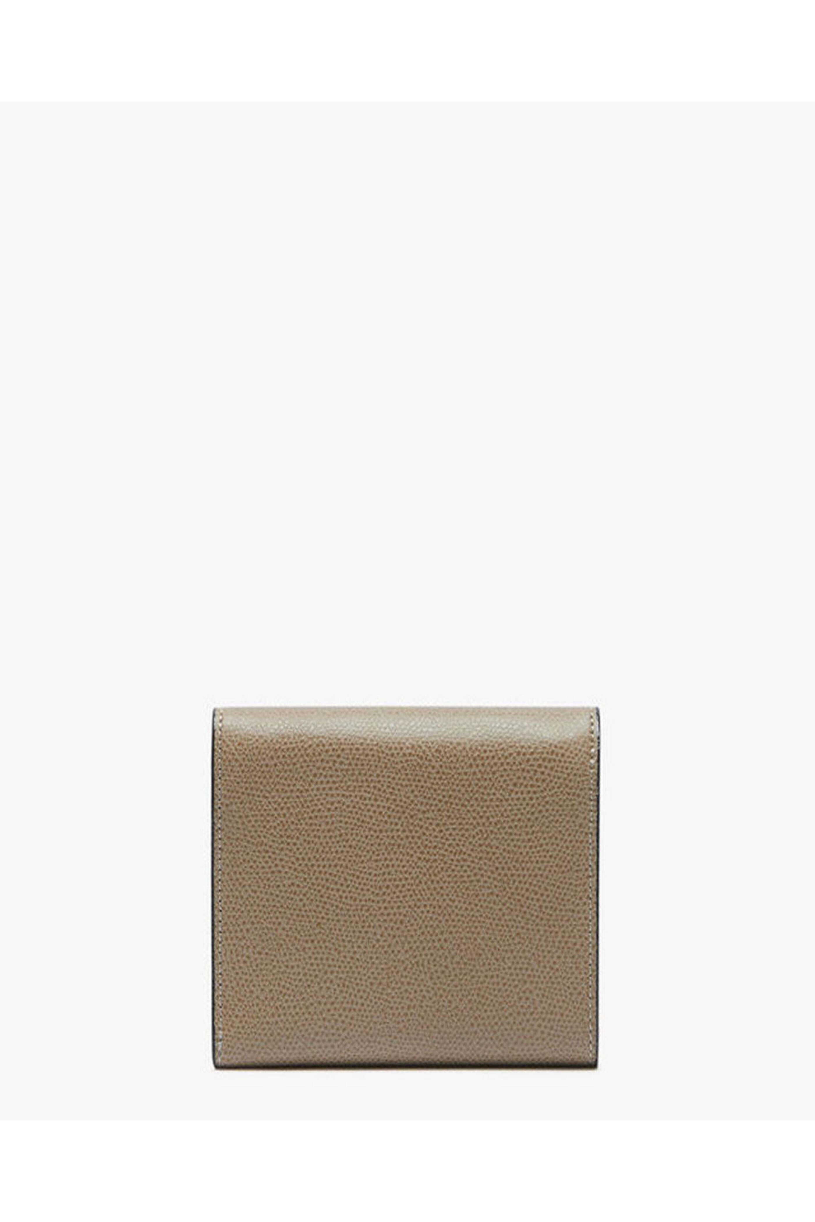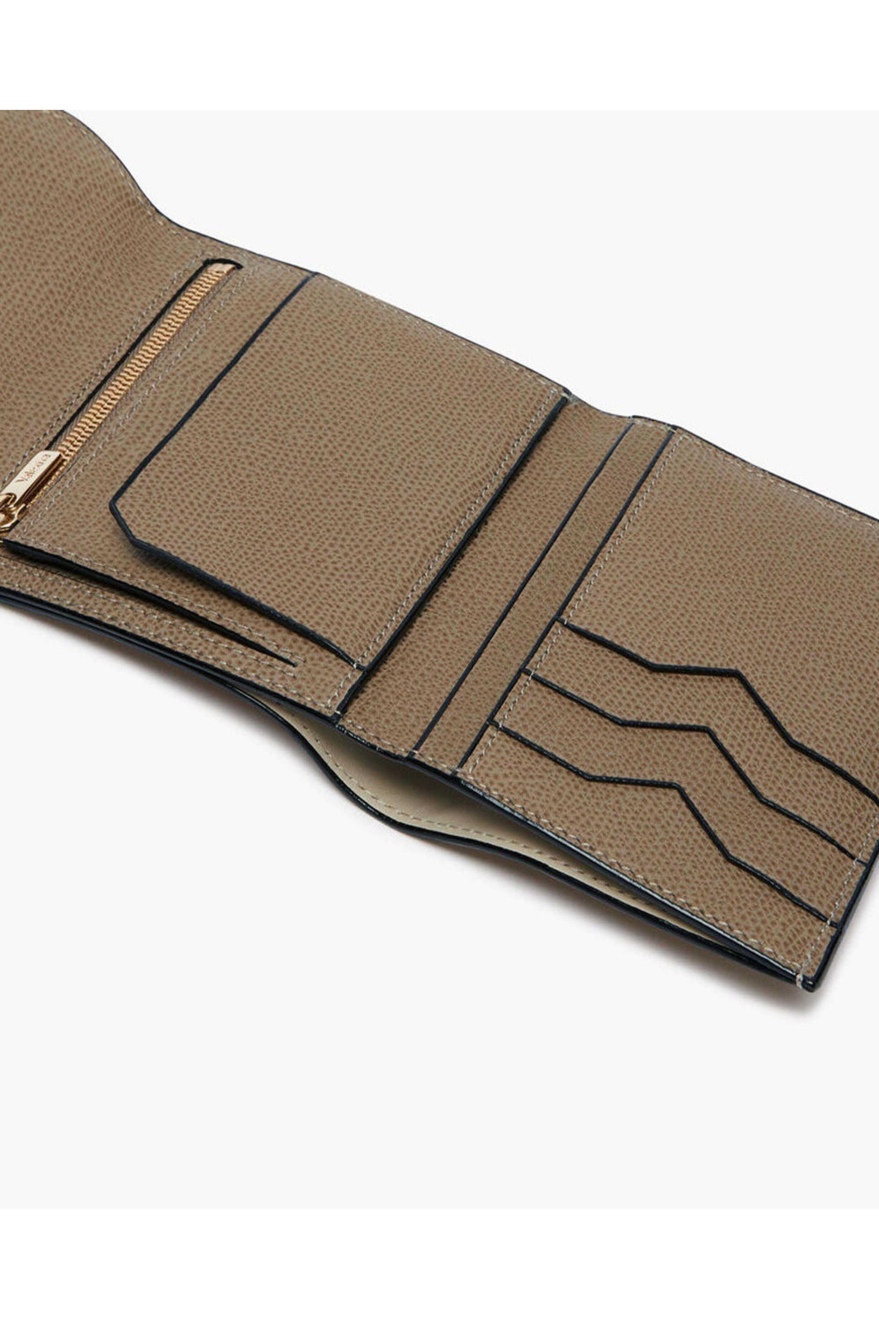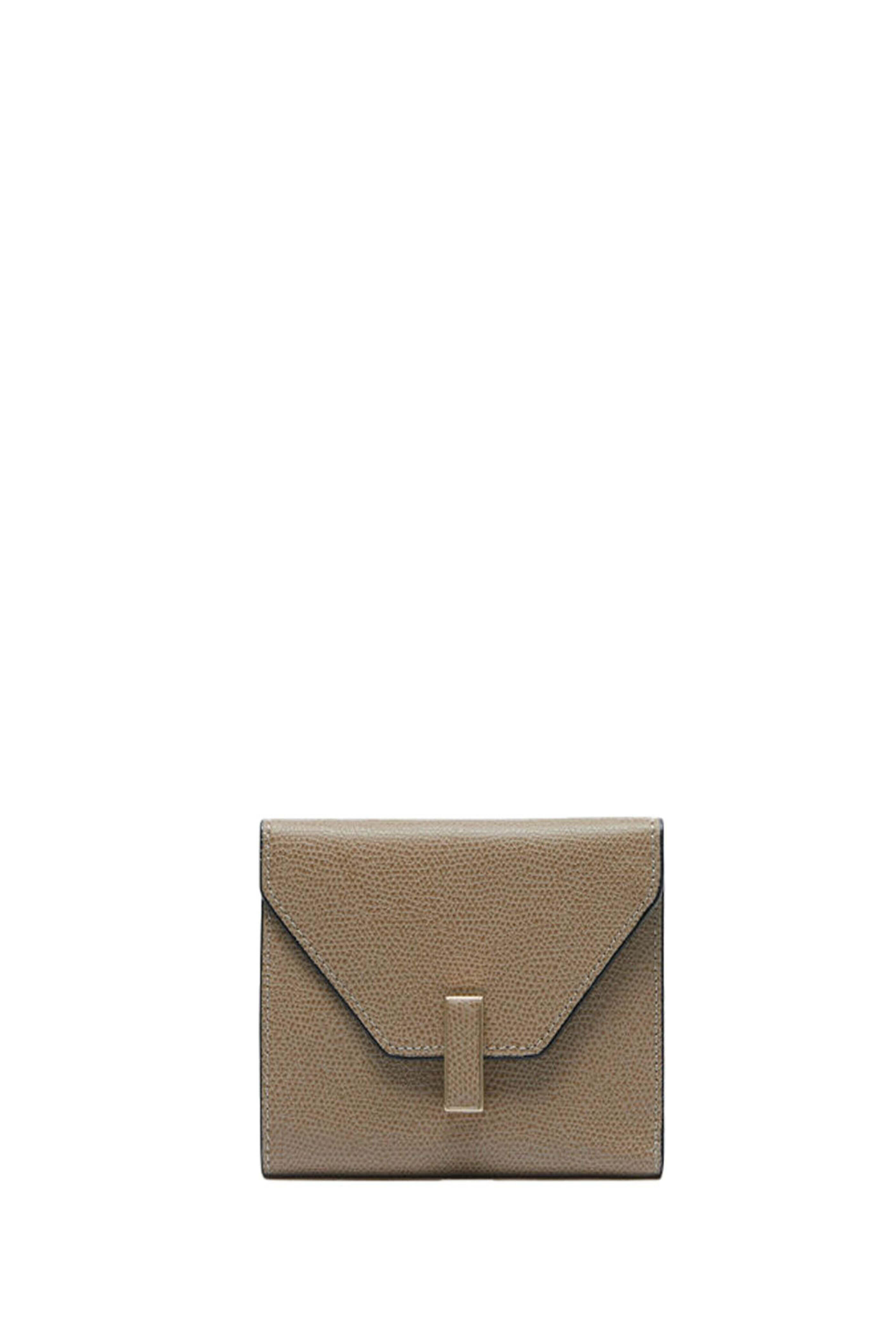 Valextra Iside Fold Wallet in Oyster Brown. Twist-lock closure. 3 card slots. Zip-fastening coin pouch. Leather outer and lining. 4.7W x 3.5H x .8D. Made in Italy.