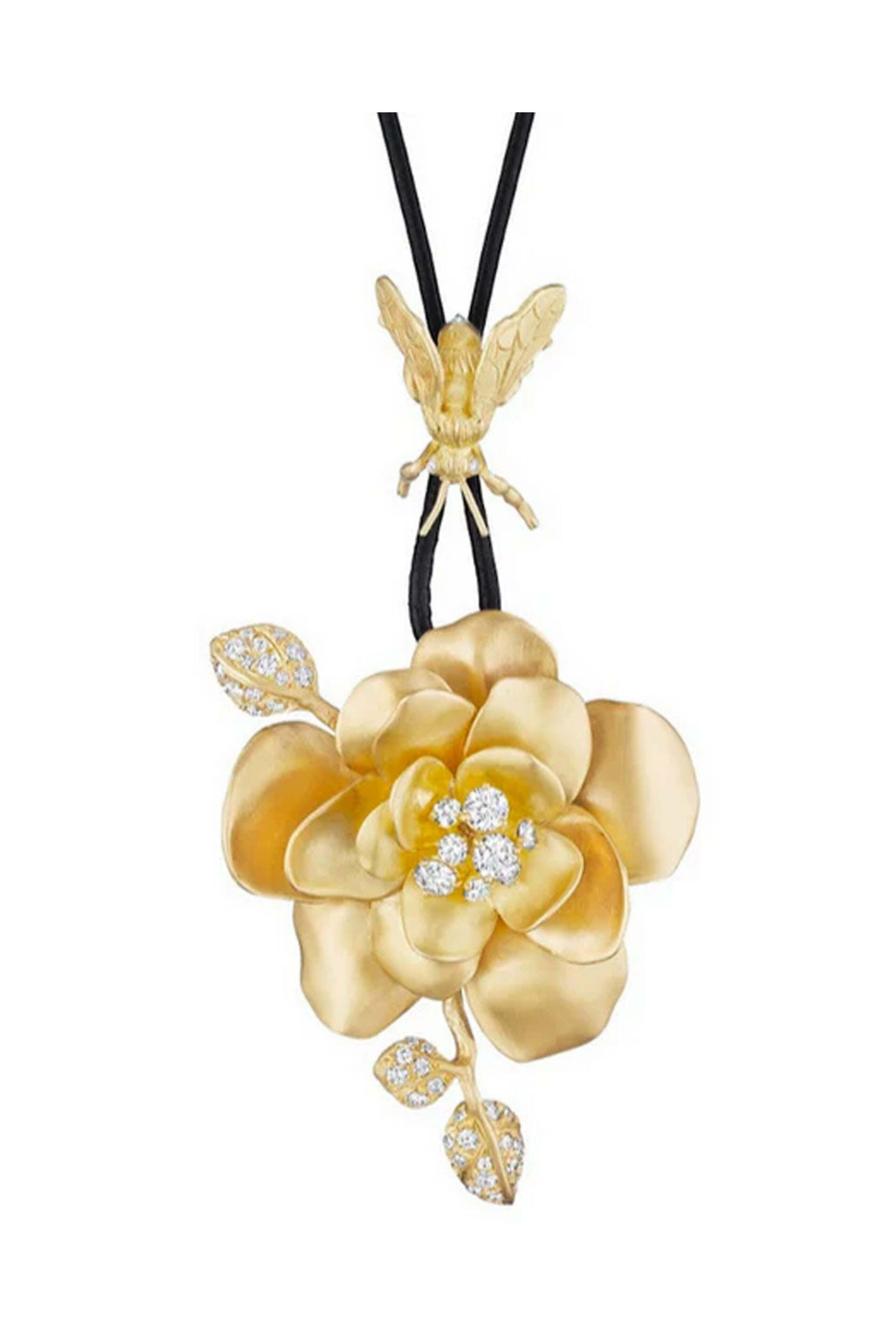 Susan Gordon Rose and Bee Pendant Necklace. 22k gold. Diamond 2.35 total carat weight. Rose design. Multi diamond center with diamond leaves. Bee charm. Black leather cord. One of a kind. Handmade.