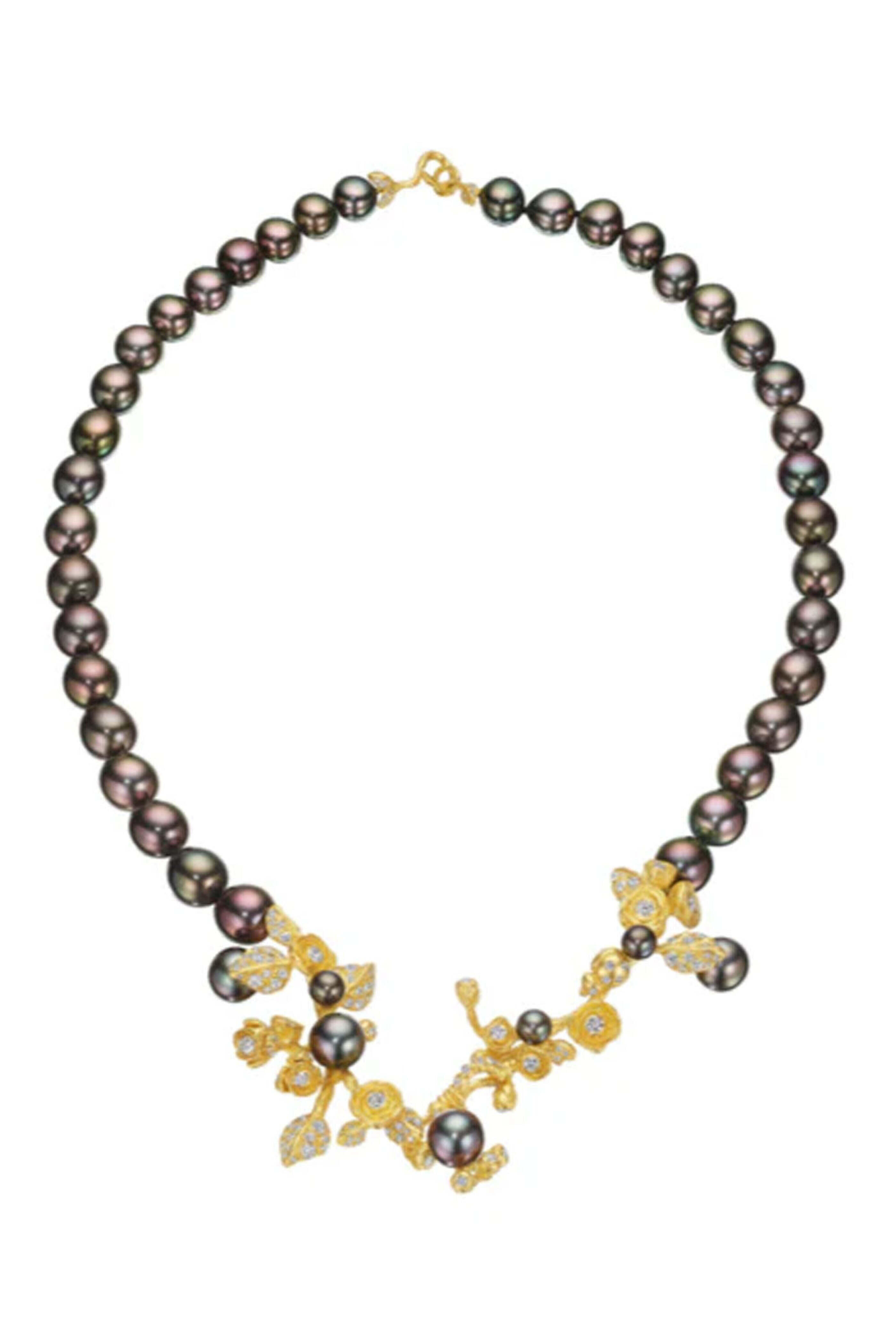 Susan Gordon Tahitian Pearl Garden Necklace. 22k gold. Diamond 5.35 total carat weight. Tahitian pearl. Flower design. Diamond leaves detailing. Two hundred diamonds. Beaded. 24 L. Hook-and-eye clasps. One of a kind. Handmade.