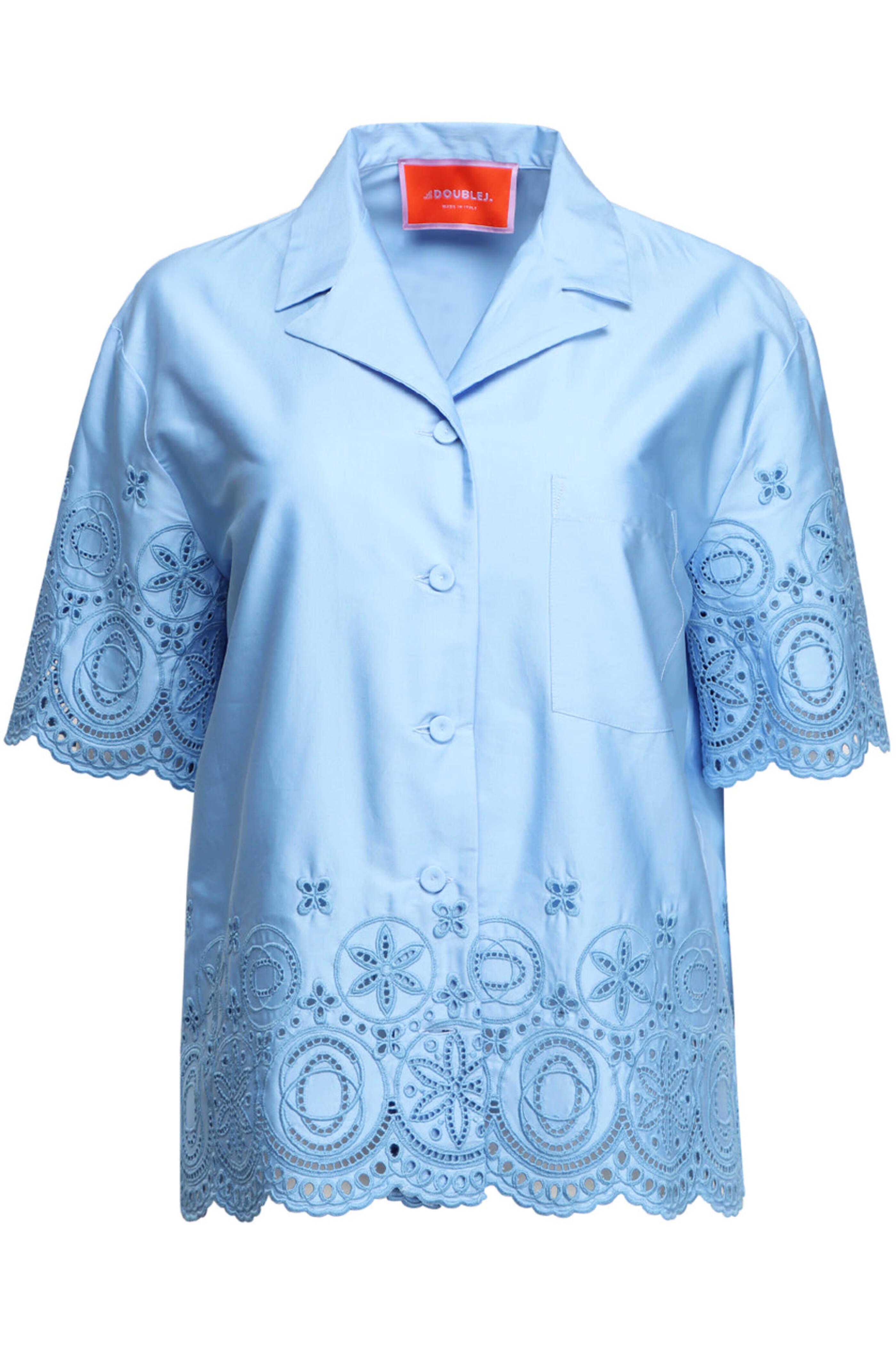 La DoubleJ Eclipse Sangallo Eyelet Boxy Shirt. Notch collar. Short sleeves. Button down fornt closure; self-cover buttons. Single chest patch pocket. Boxy fit. Eyelet embroidered detail. Made in Italy. 100% cotton.