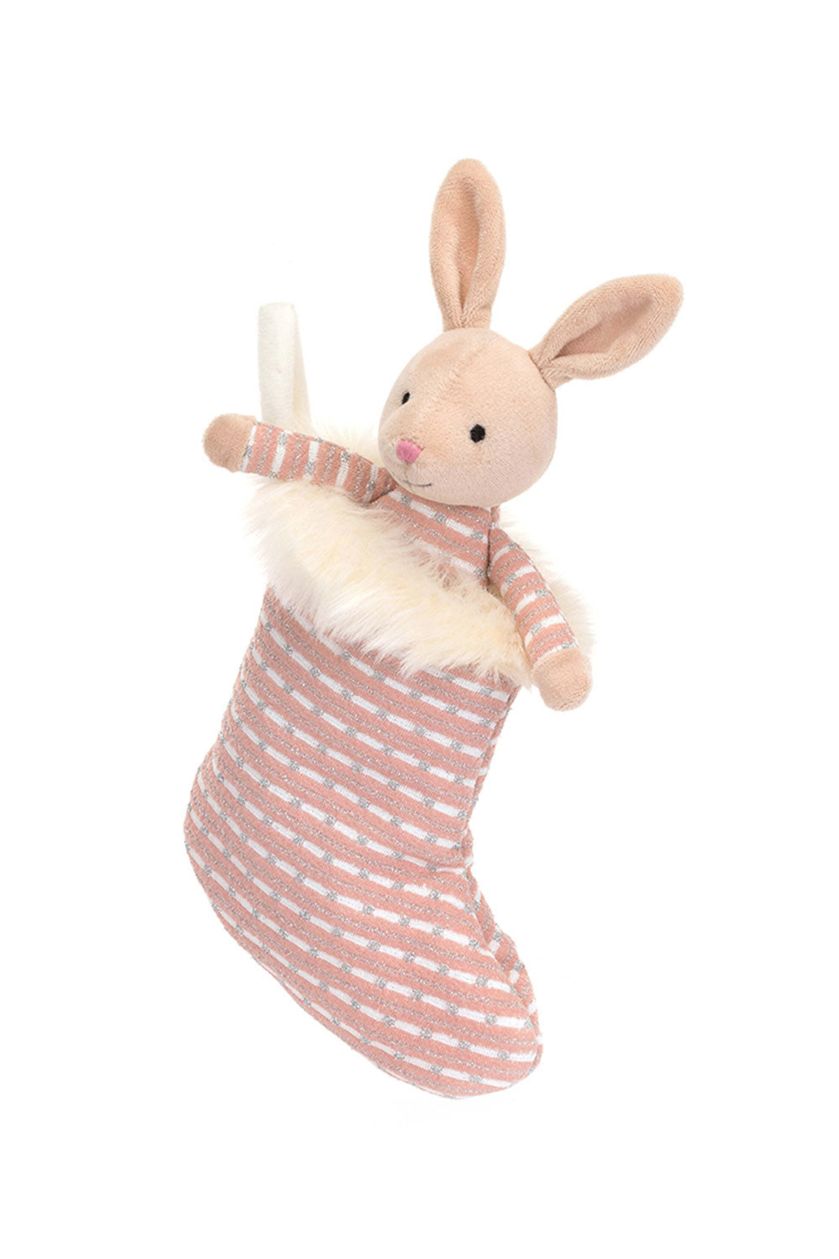 - This peachy bunny has sparkly pink jimjams that match their squishy fuzzy-trimmed stocking