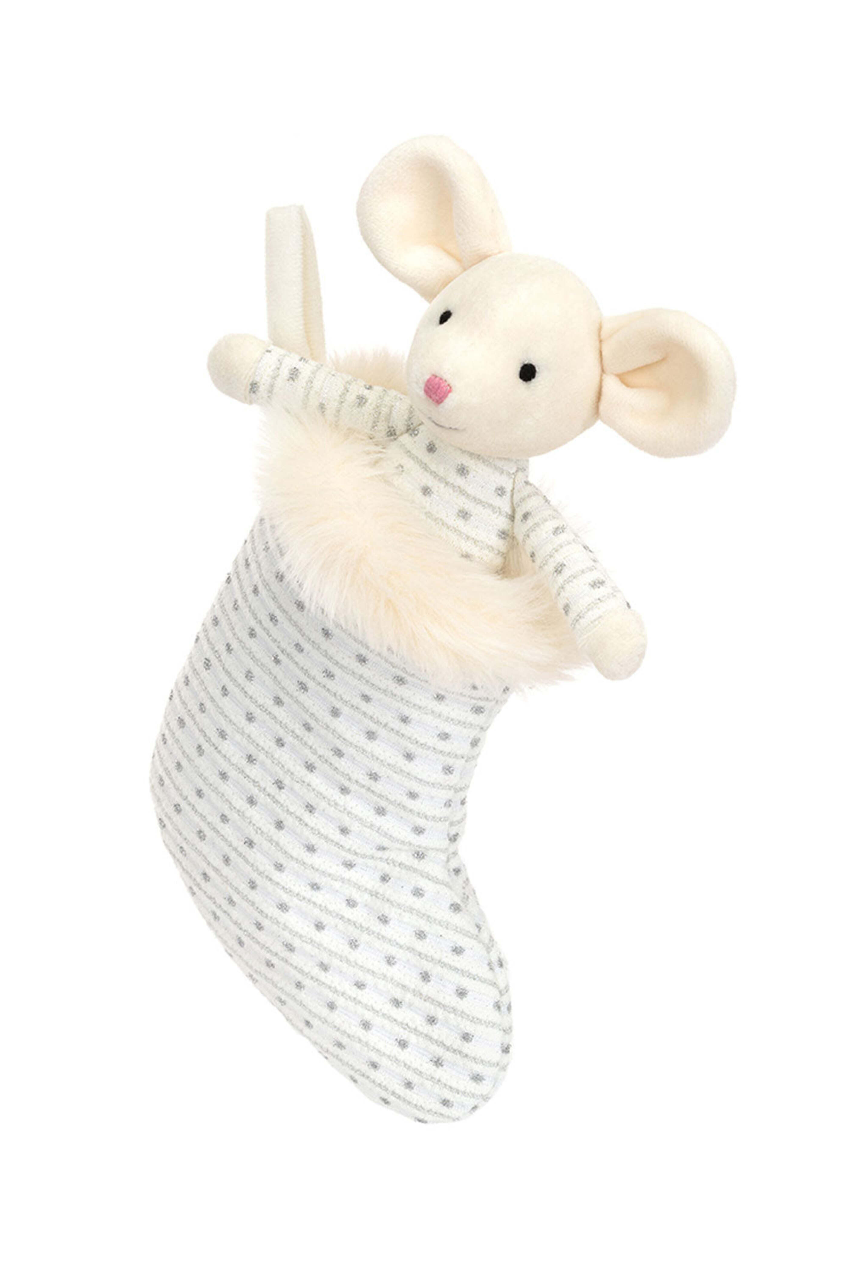 Jellycat Shimmer Stocking Mouse. This wriggly sweetie has round creamy ears and PJs that match their fancy stocking. Polyester with plastic pellet fill. Not recommended for children under 12 months due to fiber shedding. Hand was only. One size only. 4 W x 8 L.