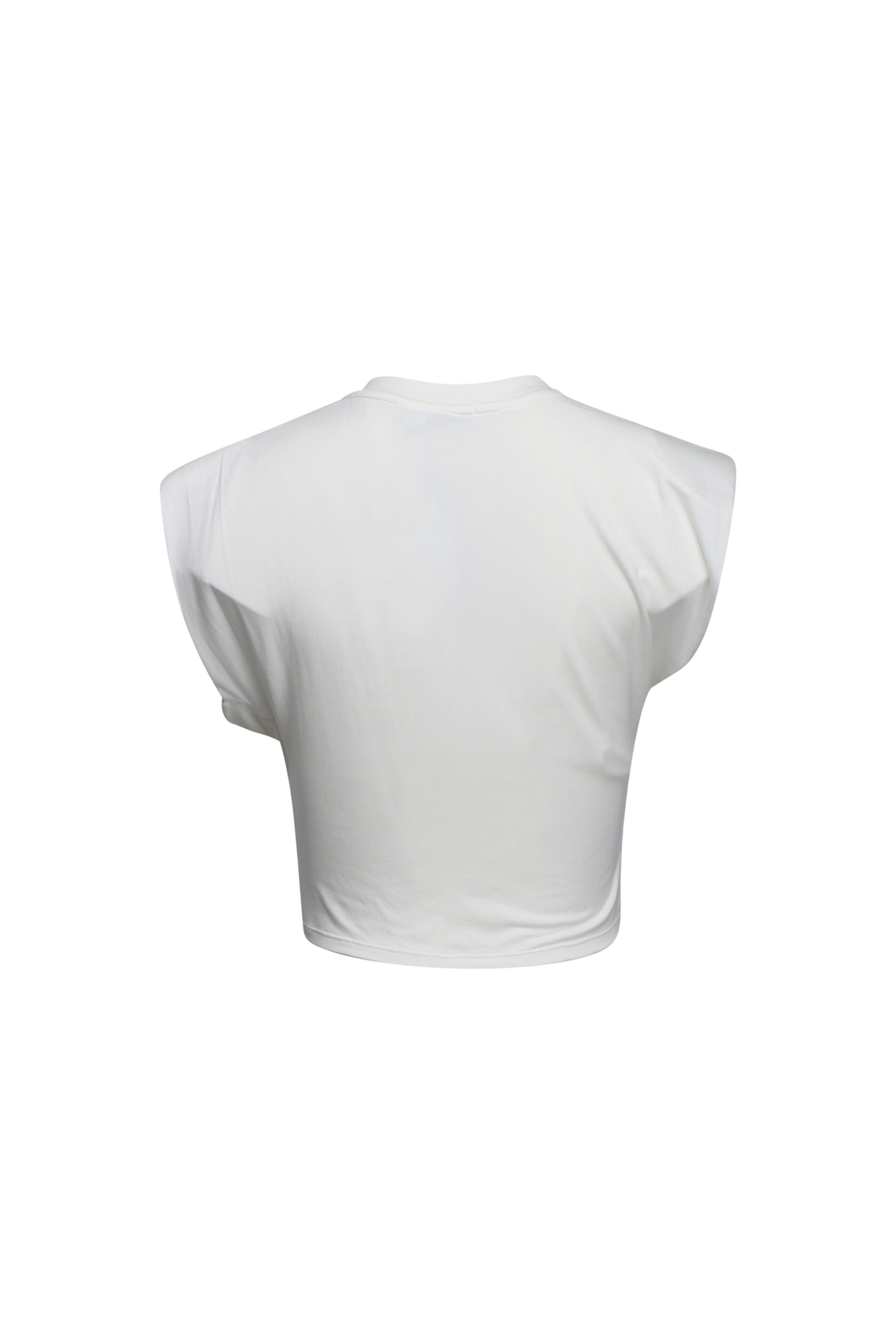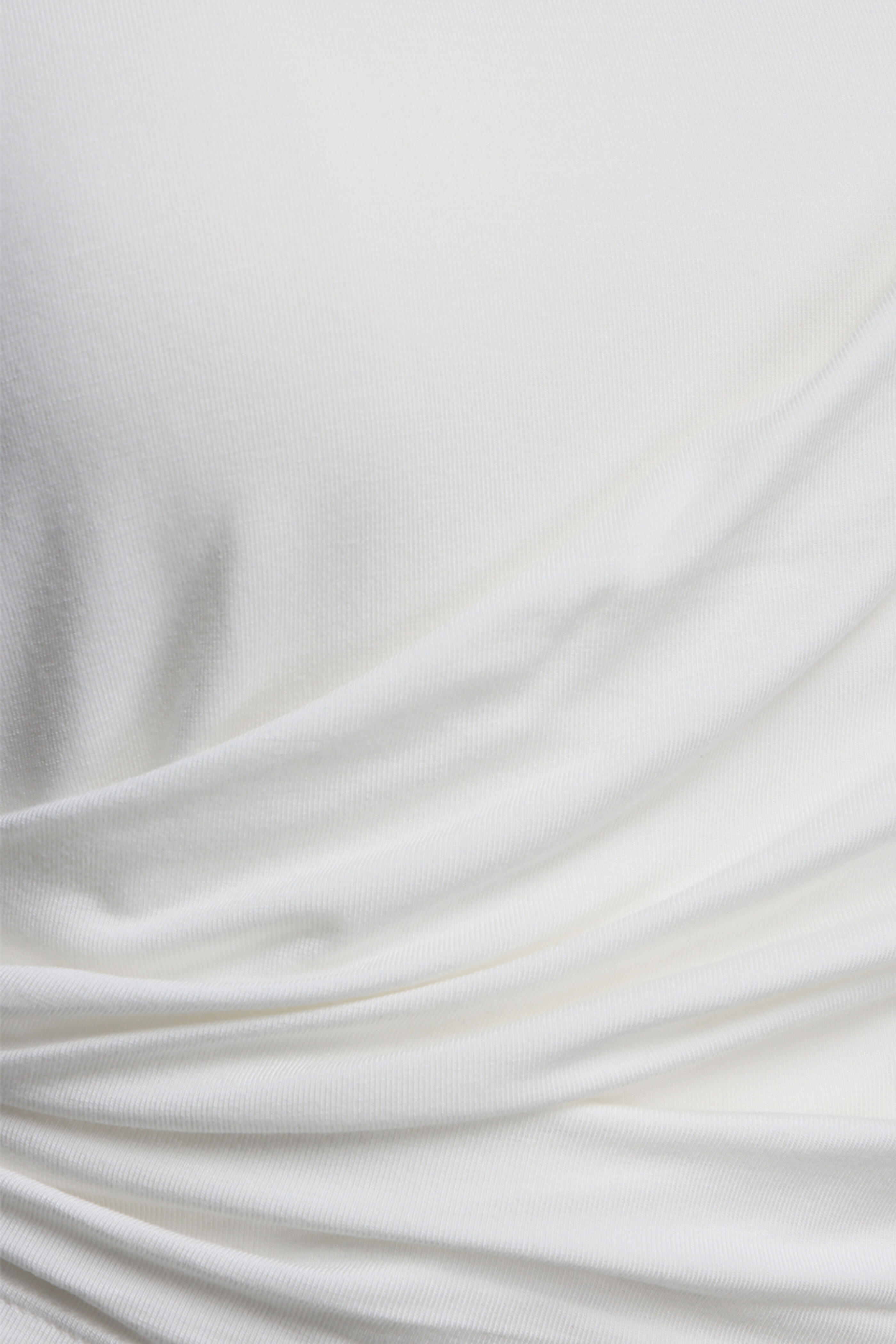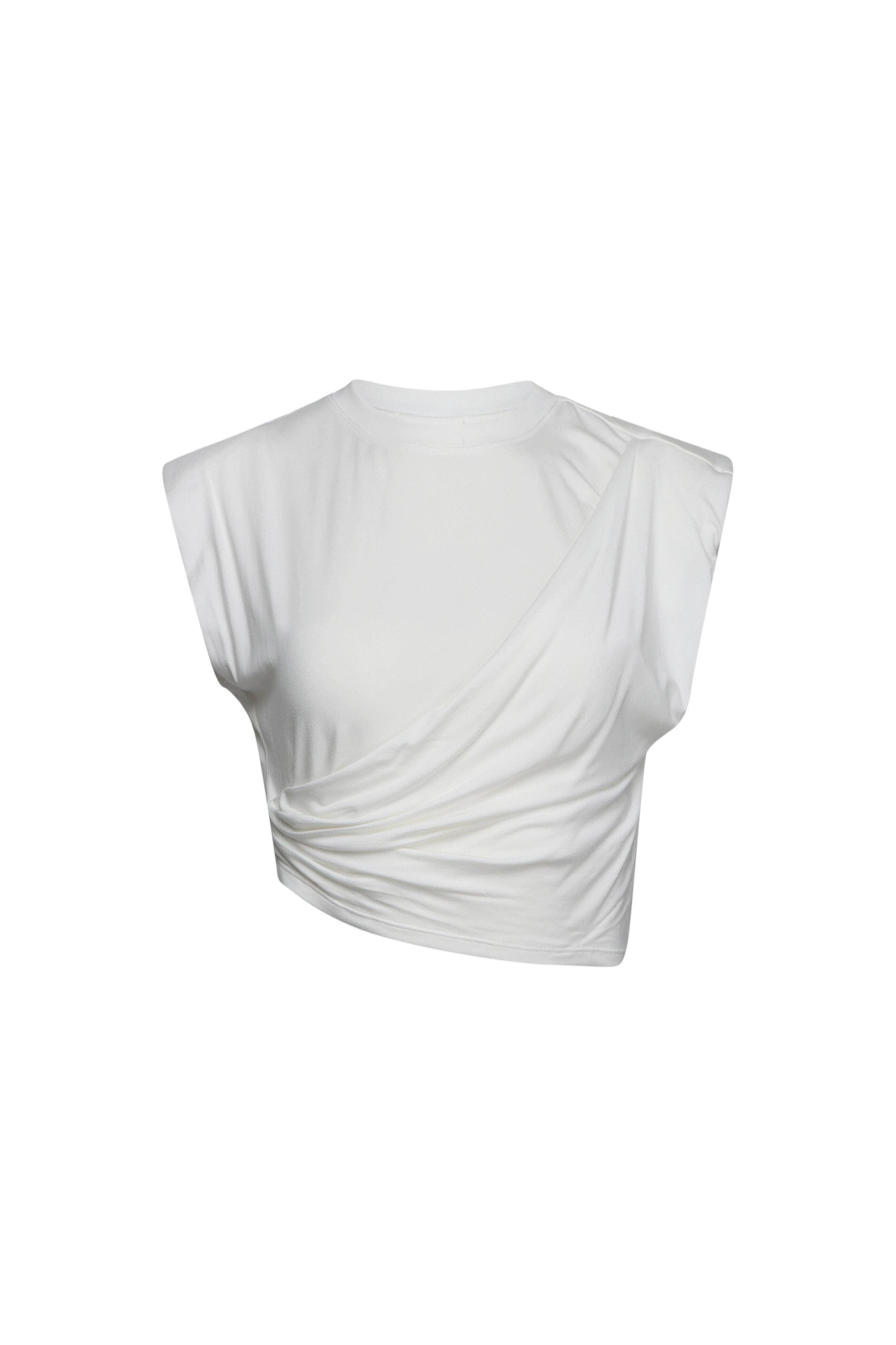 Crewneck. Structured shoulders. Sleeveless. Asymmetrical drape detail. Cropped length. 95% Tencel, 5% elastane.