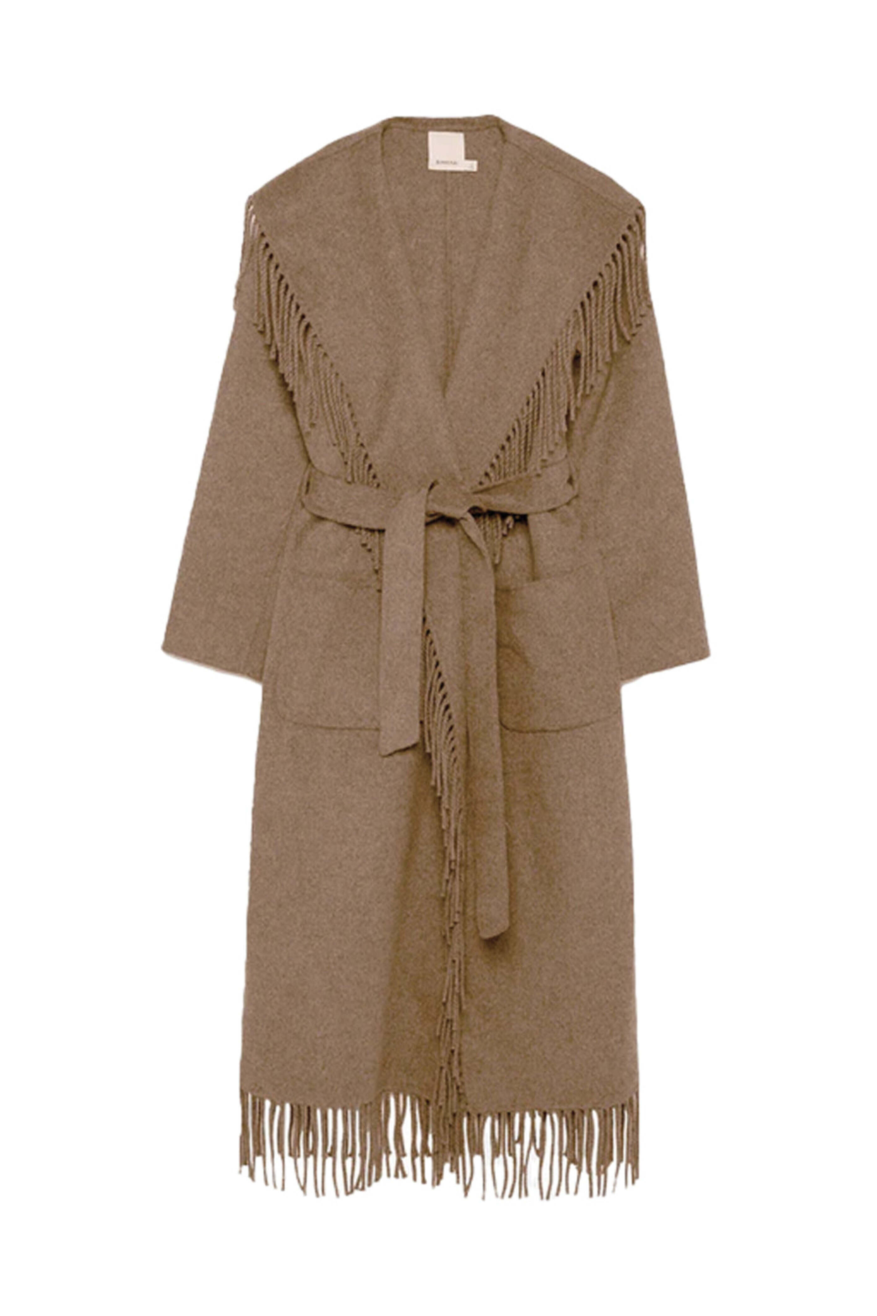 SIMKHAI Camel Carrie Fringe Coat. Shawl collar; fringe detail. Drop shoulders. Long sleeves. Removable self-tie belt; self-fabrication. Front slip pockets. Long length; fringe hem. 50% wool, 50% polyester.