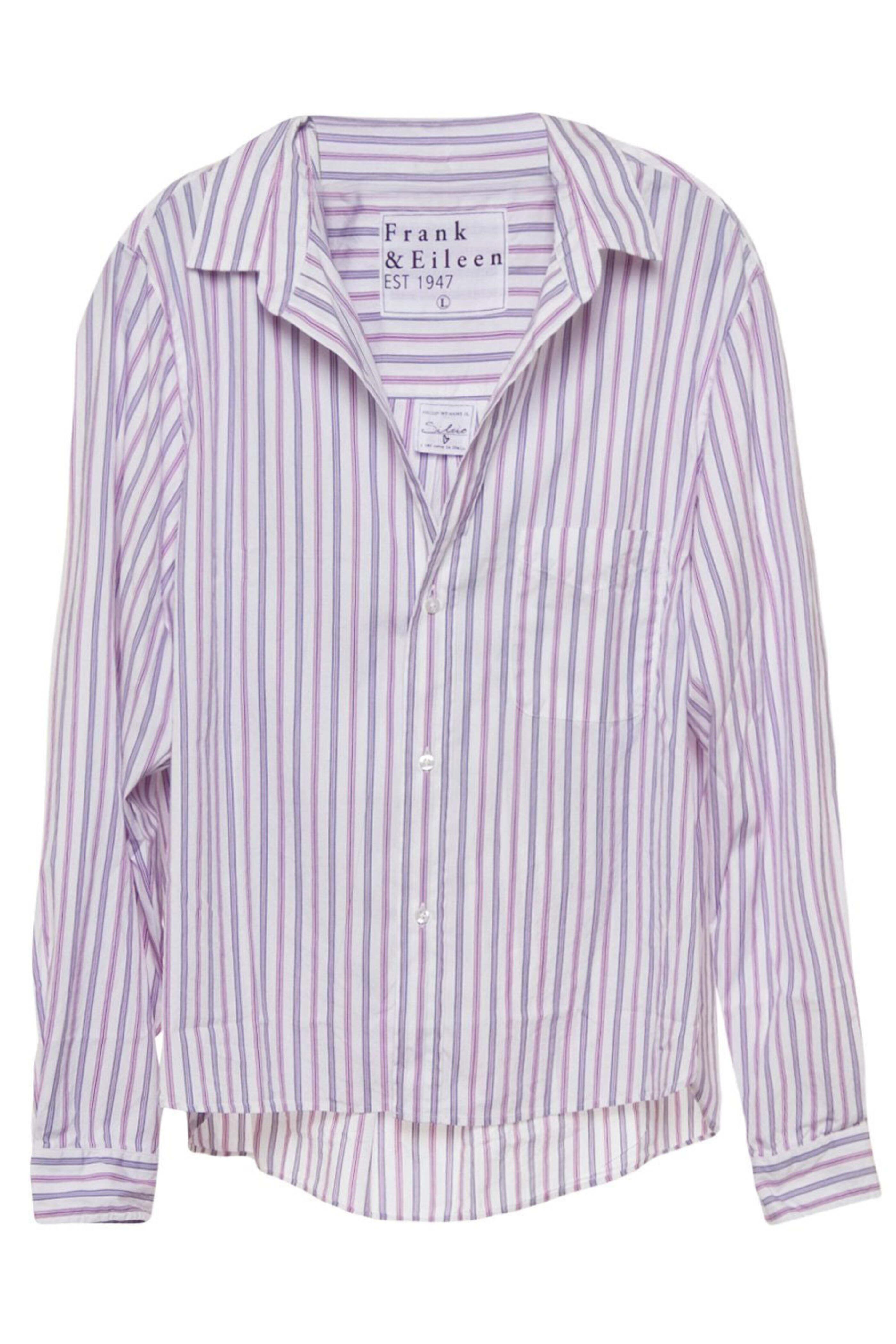 Frank & Eileen Purple Stripe Silvio Button Up Shirt. Collared. V neck. Long sleeves; button cuffs. Button down front closure. Single chest pocket. Relaxed fit. Unlined. 100% italian cotton.