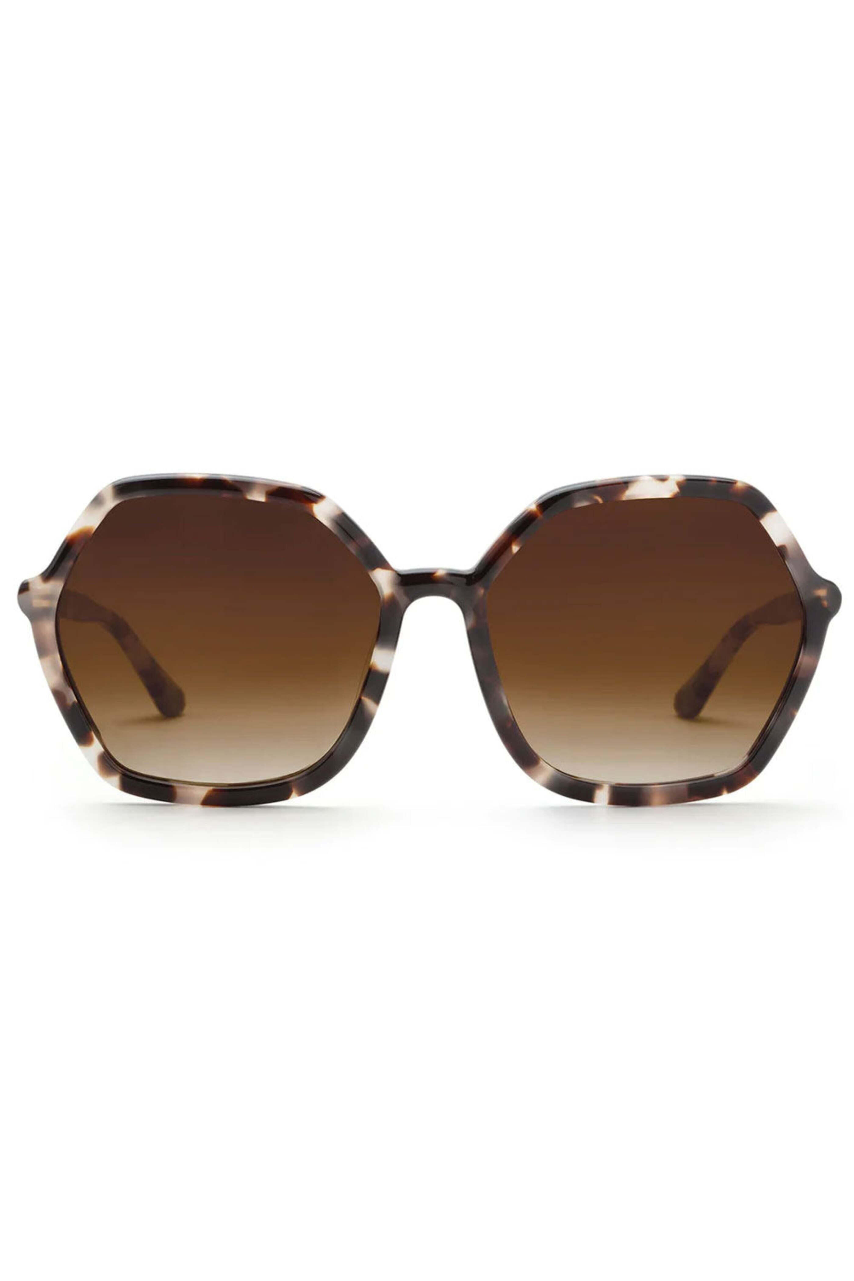 Krewe Jackie Sunglasses in Malt. Amber gradient lens. Handcrafted acetate frames. Size 61-19-145. 100% UVA/UVB protection.