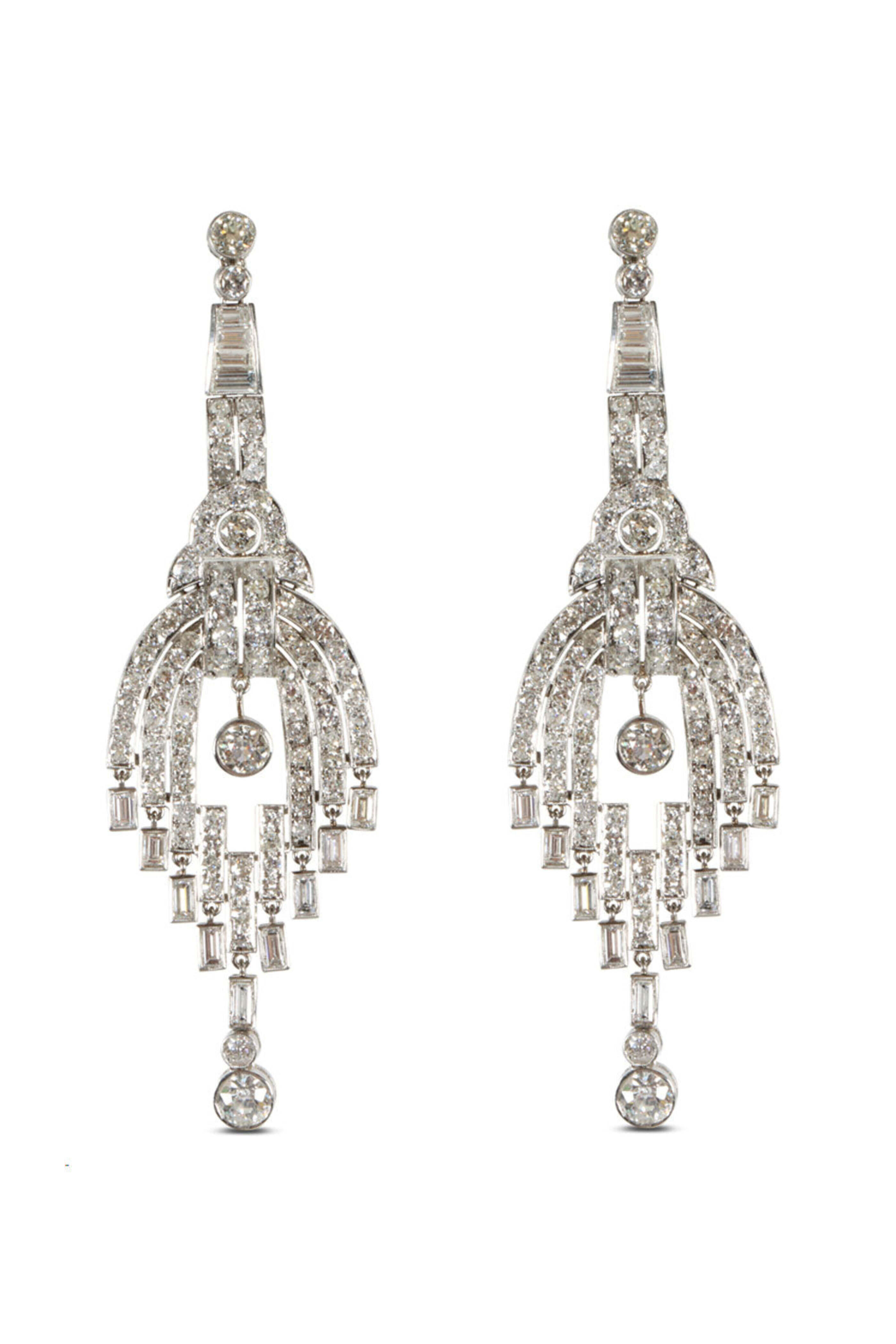 Estate Jewelry Diamond Chandelier Earrings. Platinum. Diamond 20.00 total carat weight. Baguette cut. Round, brilliant cut. Chandelier design. Art deco inspired design. Drop style. Push back post.