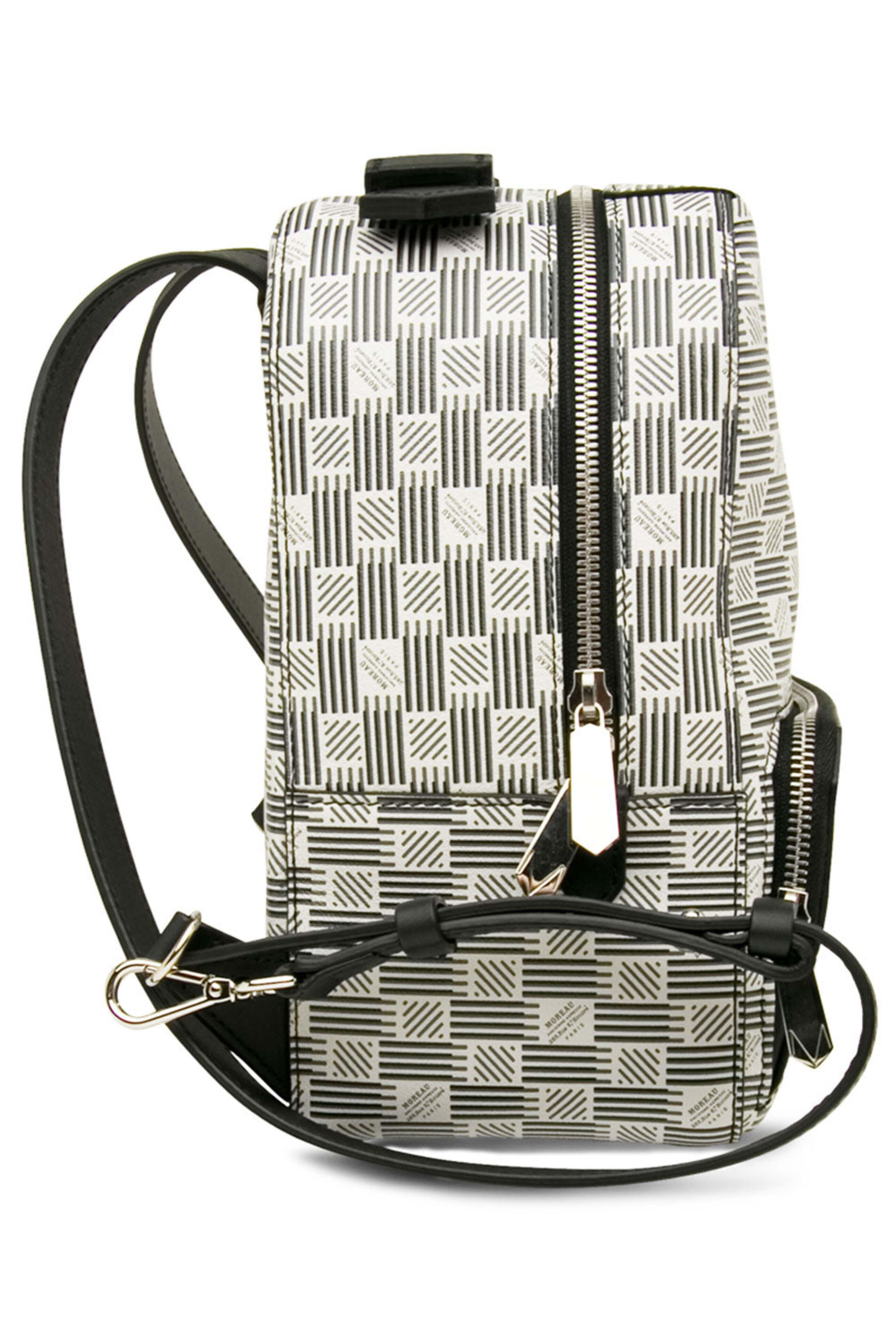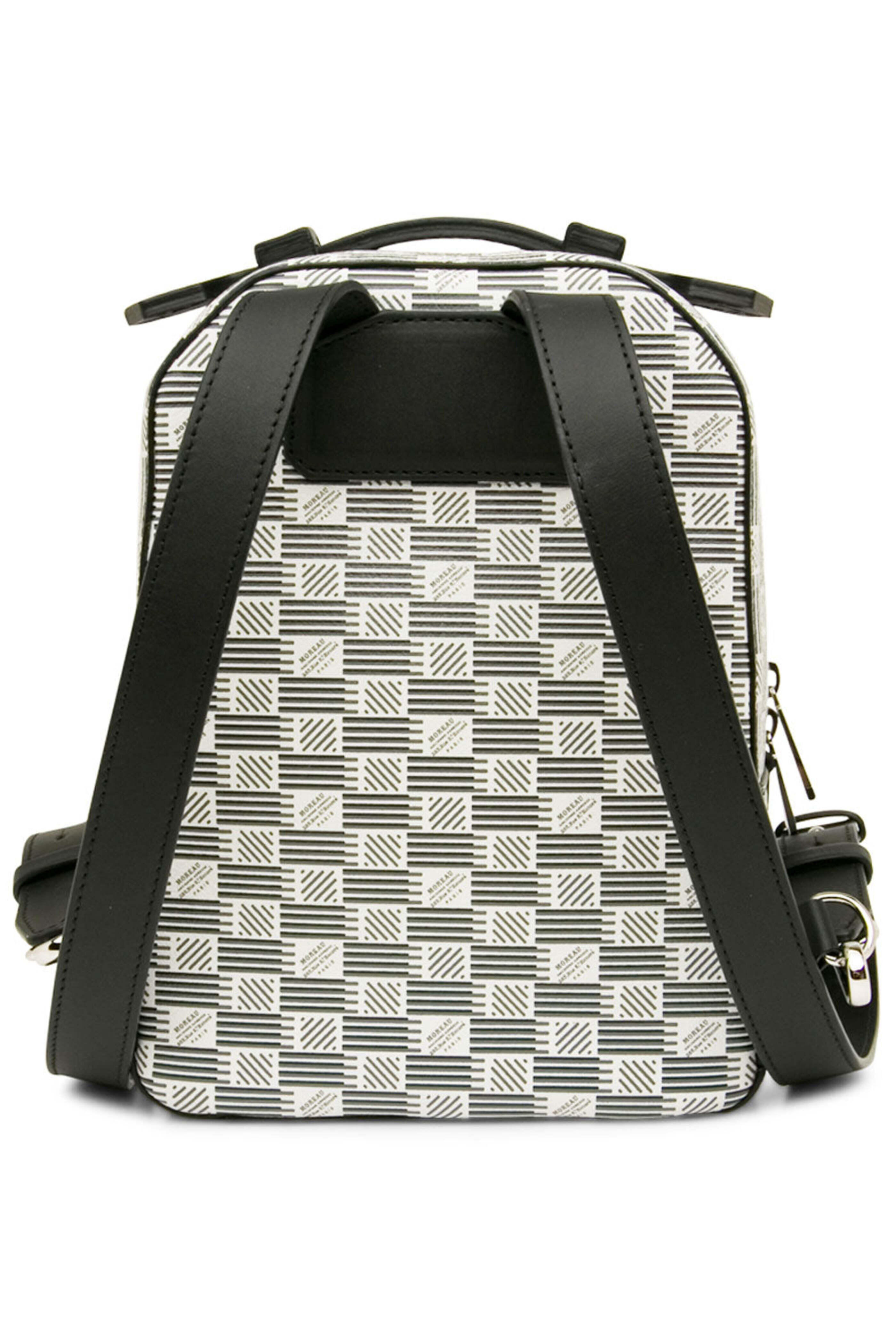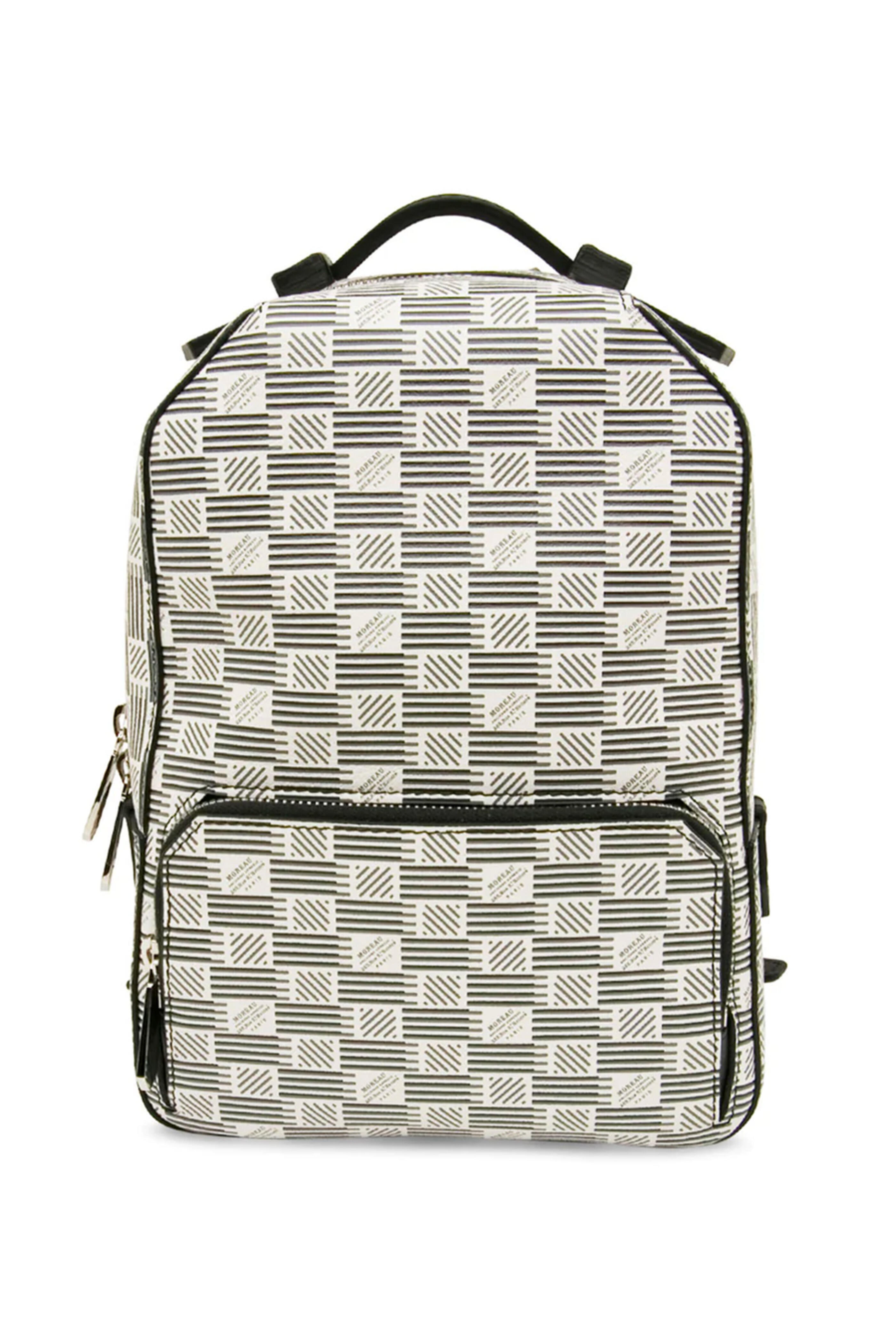 Moreau Mini Leon Backpack in Blanc. Adjustable detachable shoulder straps. Top handle. Main zip compartment with interior slip wall pocket. Exterior zip pocket. Silver tone hardware. Signature monogram leather outer. Leather lining. 7.5 W X 10 H X 5.5 D. Made in Italy.