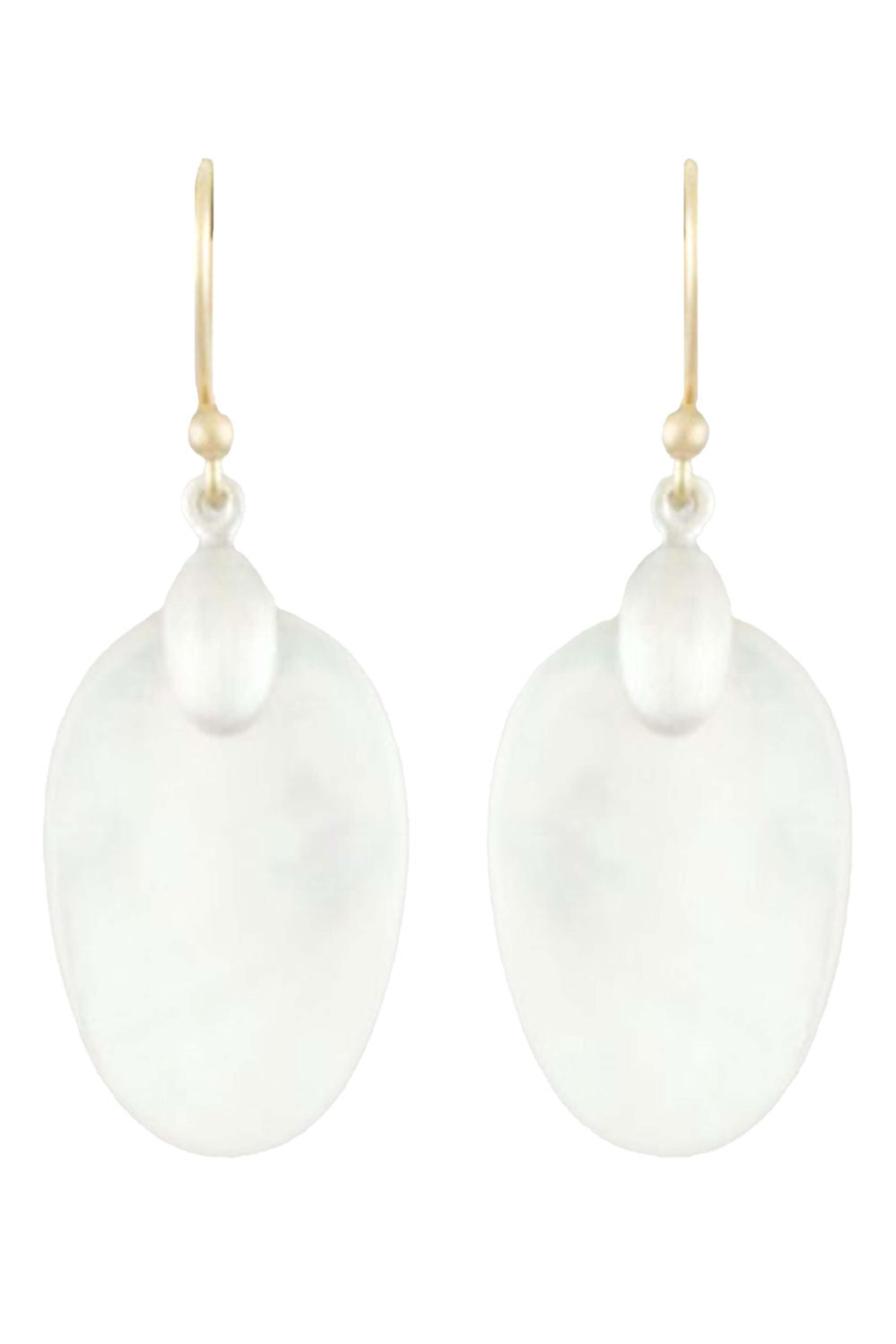 Ted Muehling Silver Top Mother of Pearl Small Chip Earrings. Silver. Mother of Pearl. 14k yellow gold wires. Drop style. 7/8" L x 1/2" W. Wire back.