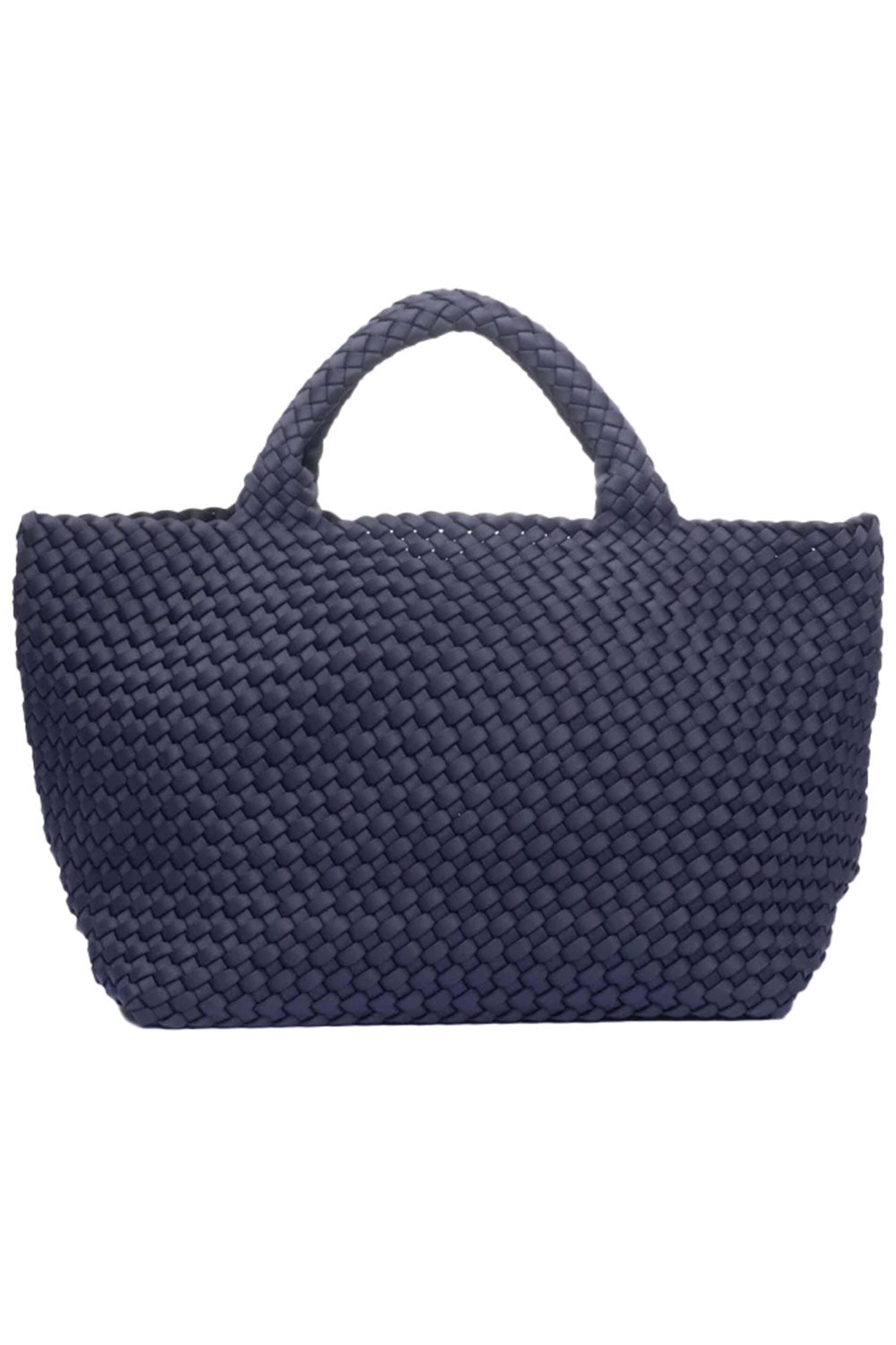 Naghedi St. Barths Medium Tote in Ink. Open top. Two top handles. Lightweight and spacious. Matching removable zip pouch. 17 W X 7 D X 9.5 H. 5 handle drop. Handwoven neoprene fabrication.