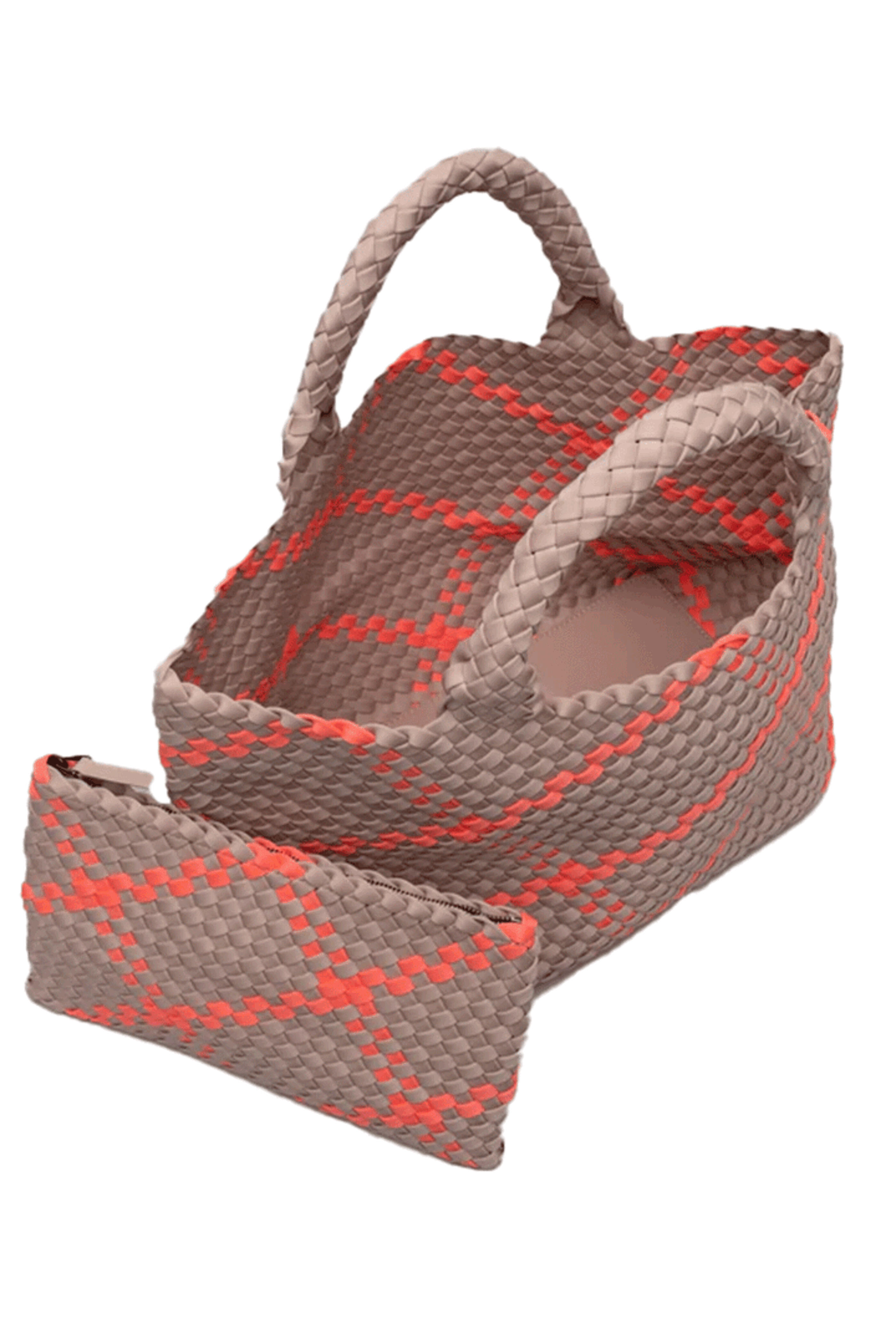 Naghedi St. Barths Medium Tote in Plaid Punch. Open top. Shoulder handles. Matching interior zip pouch. Handwoven neoprene lining and outer. 17 x 9.5 x 7. 5 handle drop.