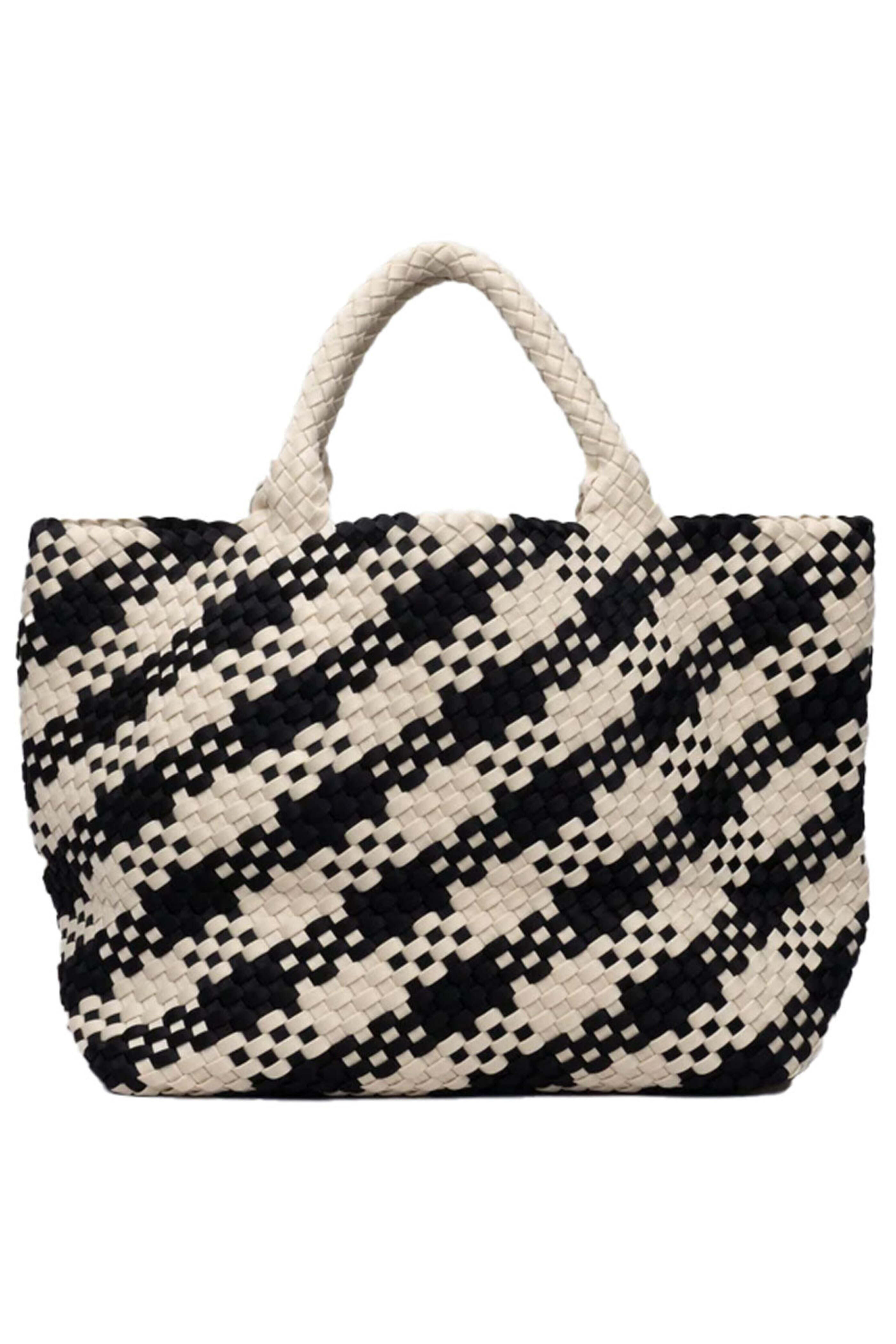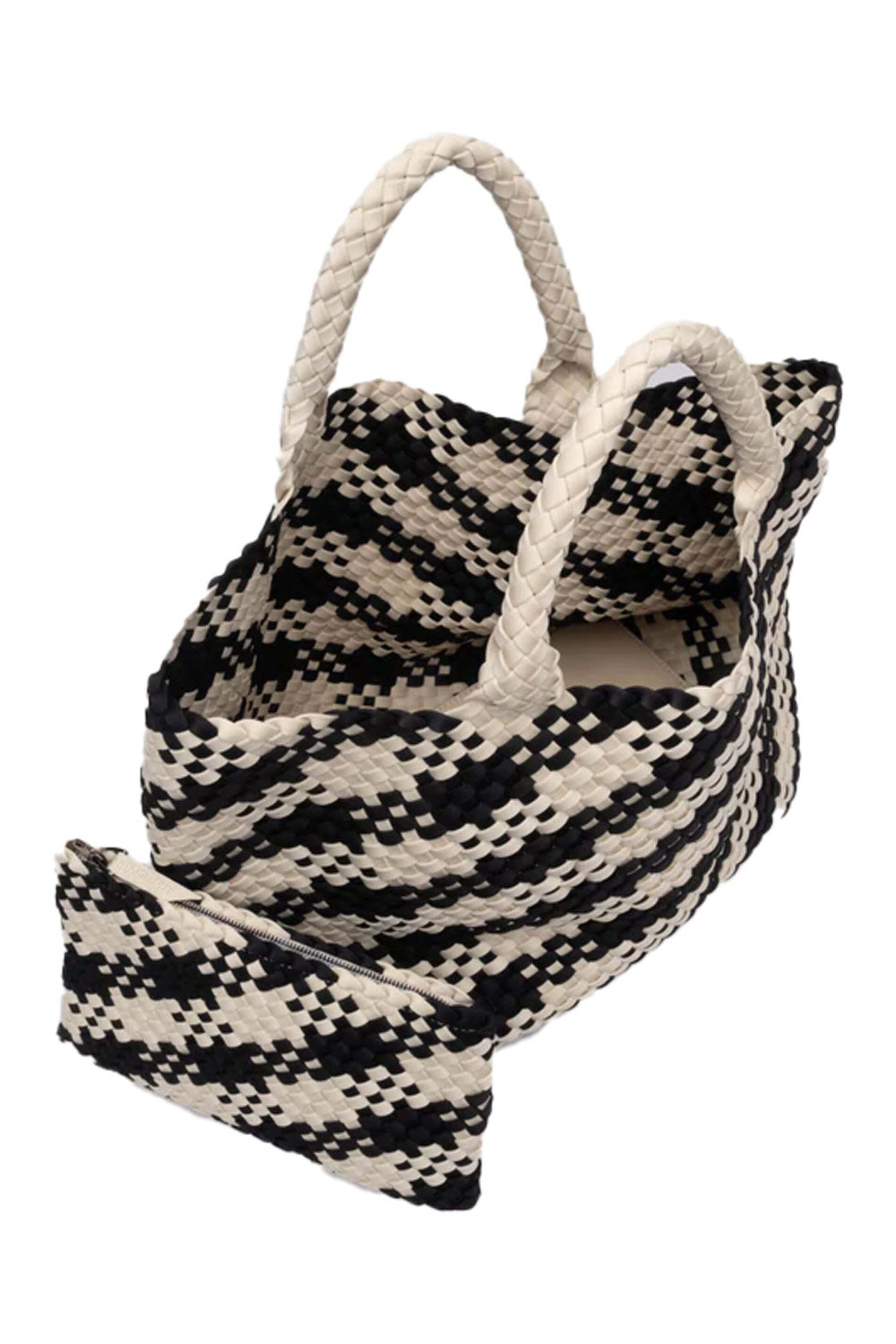 Naghedi Large St. Barths Tote in Corsica Plaid. Open top. Double top handles. Lightweight and spacious. Matching removable zip pouch. Handwoven neoprene fabrication. 22 W X 12.5 H X 8 D. 5 handle drop.