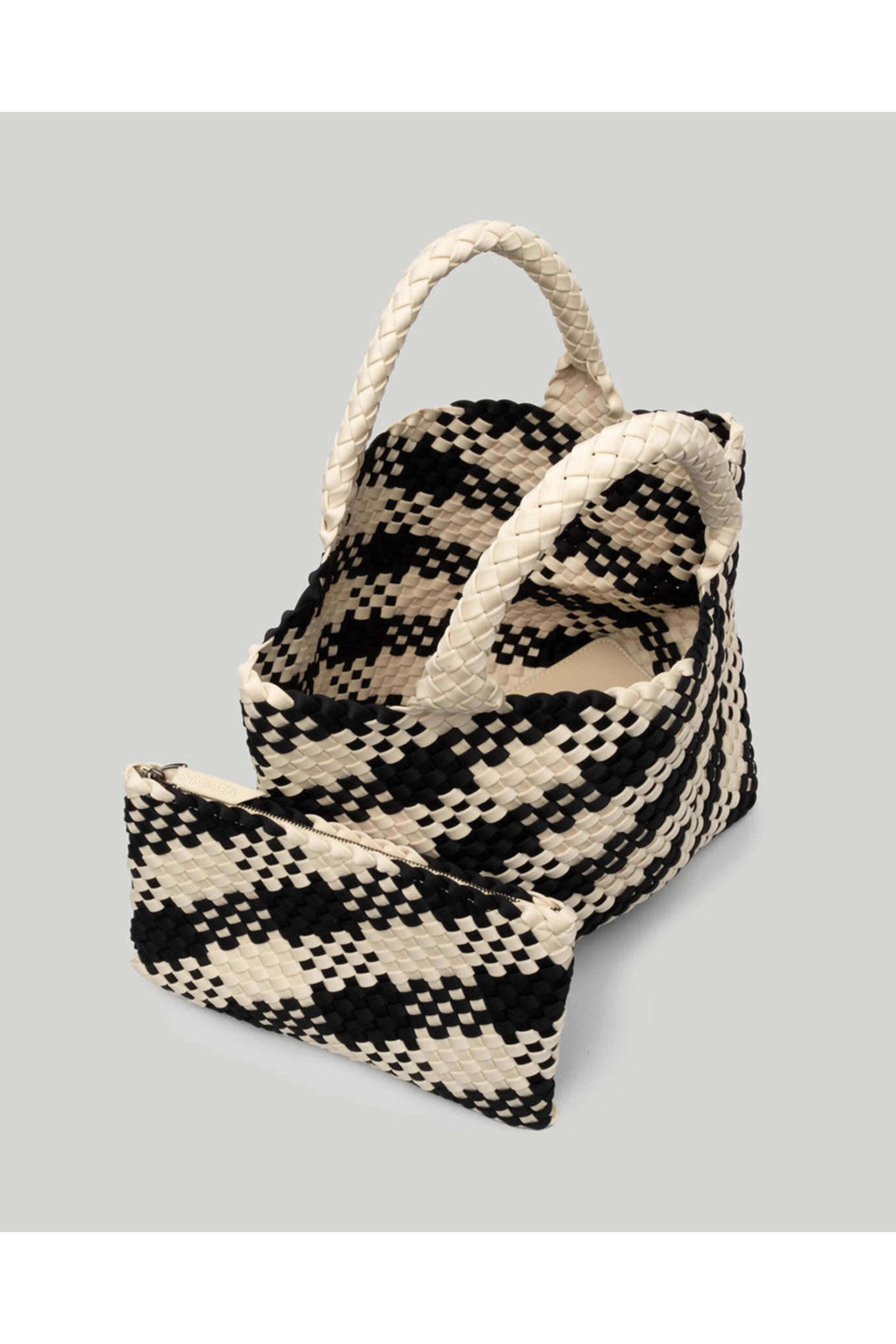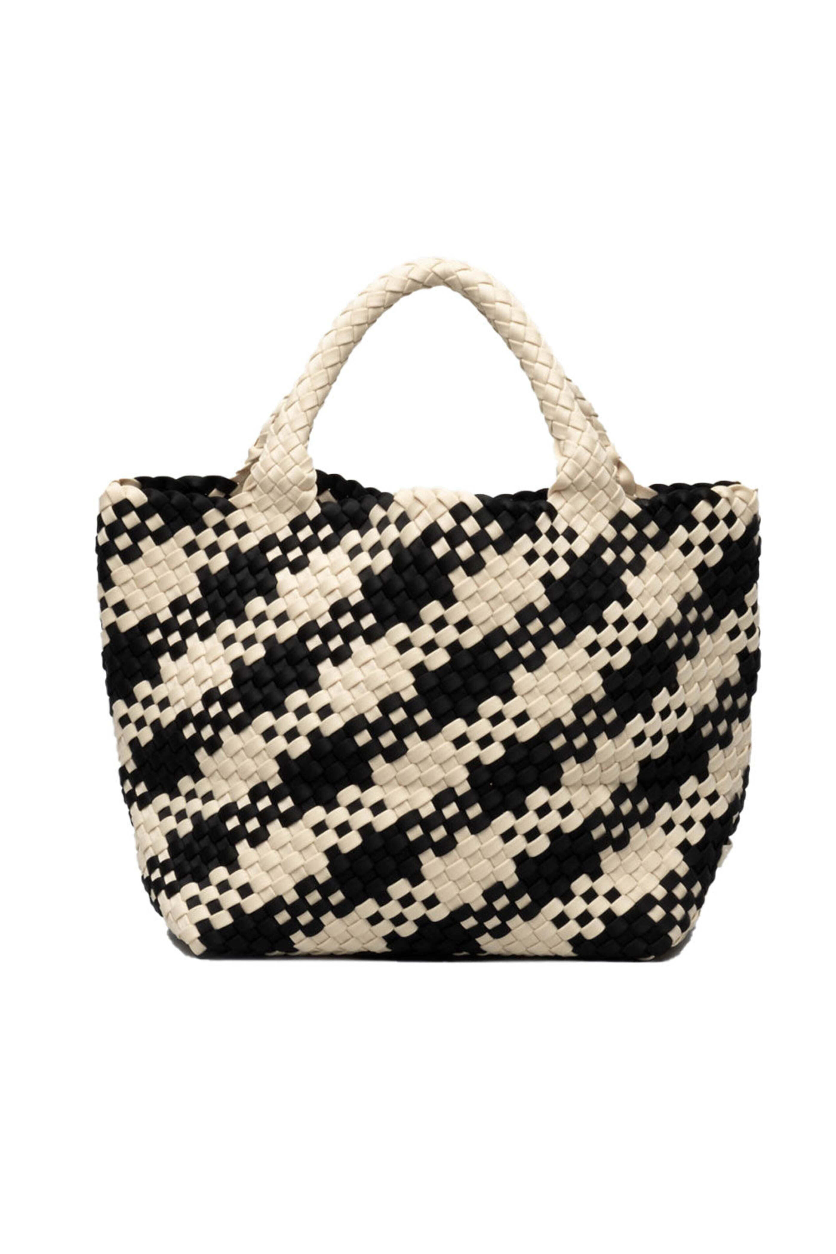 Nagedi St. Barths Medium Plaid Tote in Corisca. Open top. Shoulder handles. Matching interior zip pouch. Handwoven neoprene lining and outer. 17 x 9.5 x 7. 5 handle drop.