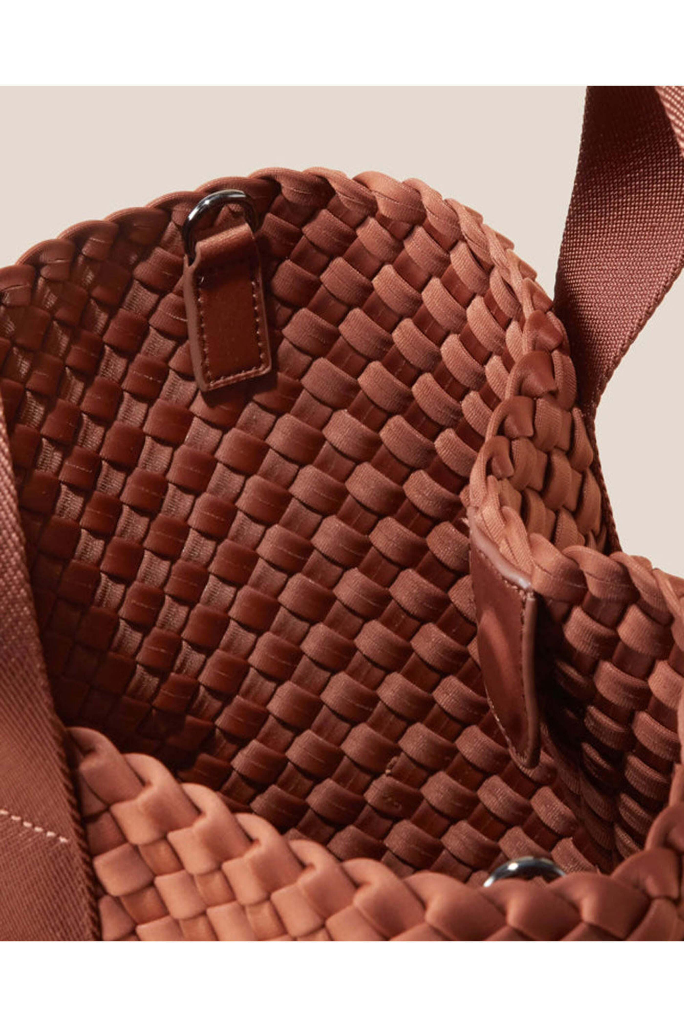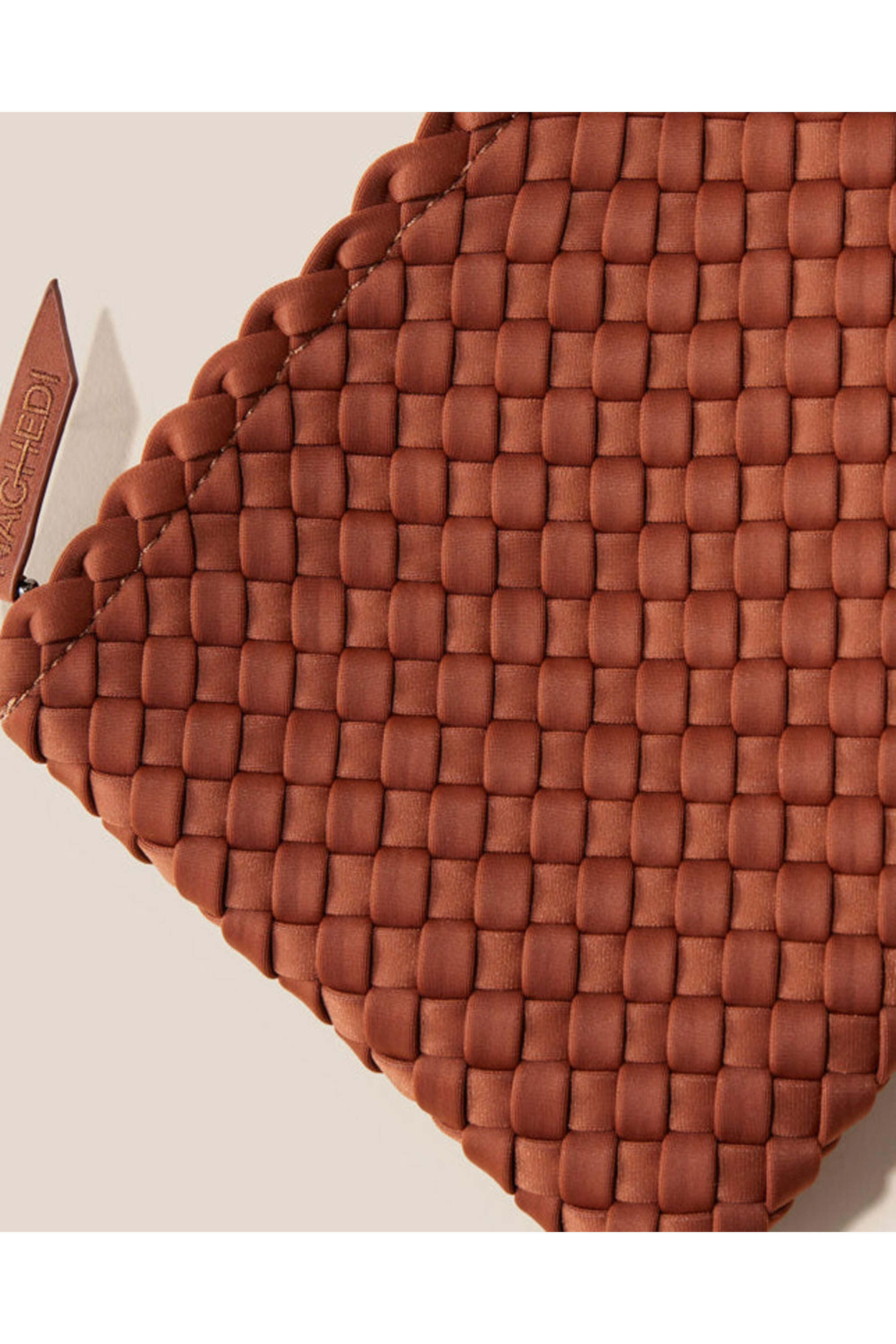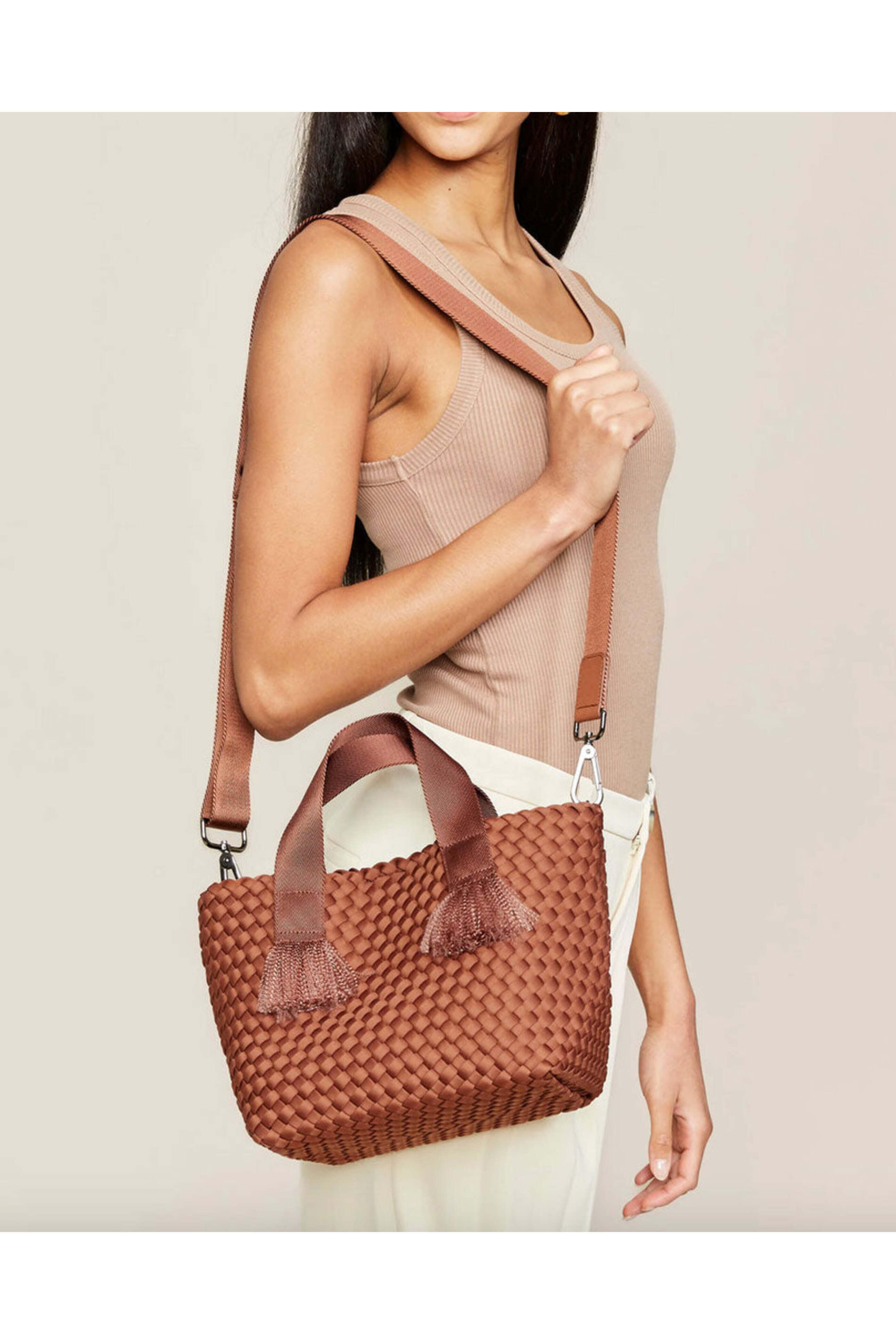 Naghedi Small Tulum Tote in Adobe. Open top. Double clutch handle. Detachable crossbody strap. Interior zip pouch included. Unlined. Polyester neoprene. 14 X 7 X 6. Handle drop: 3.