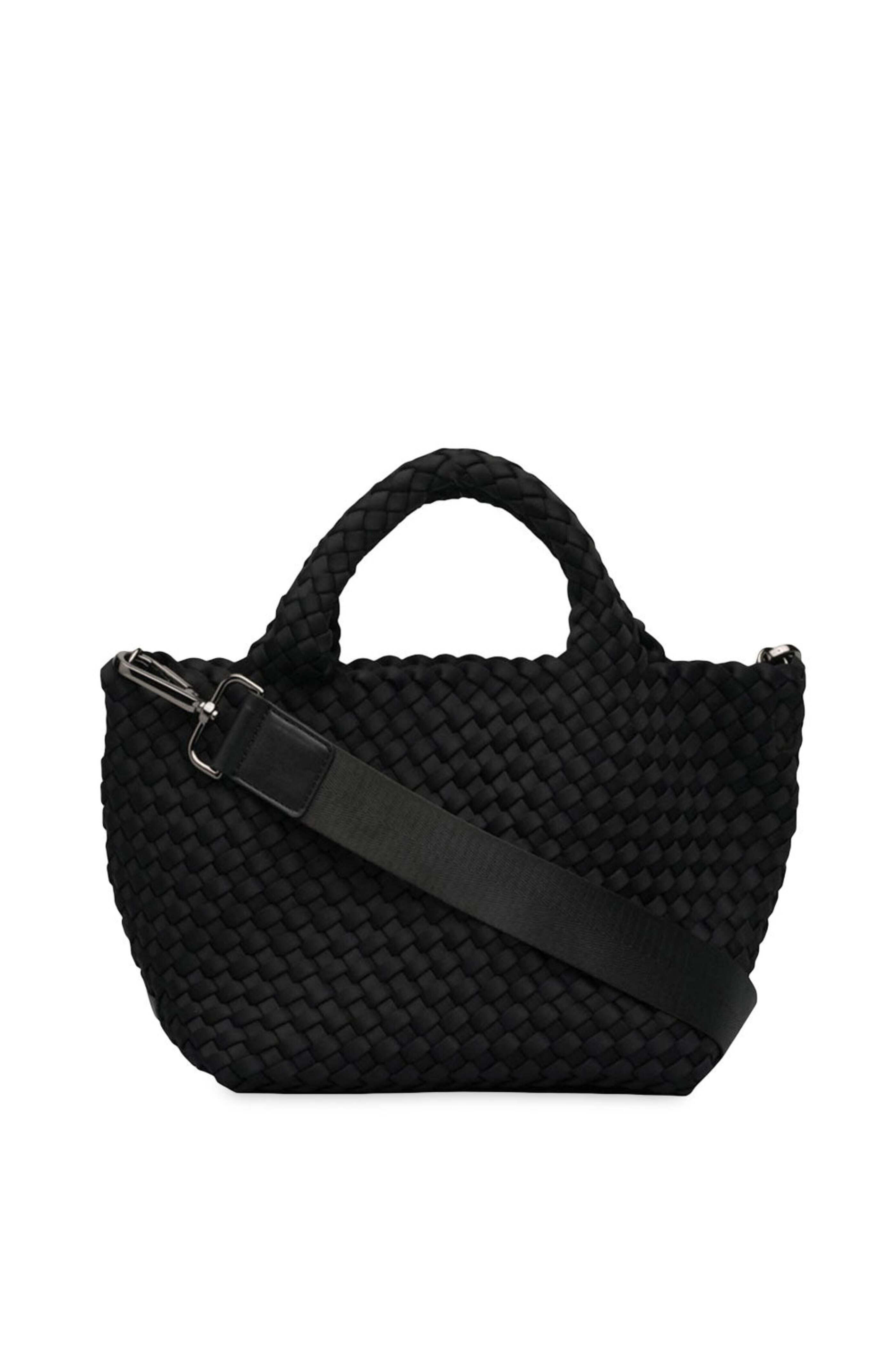 Naghedi St. Barths Mini Tote in Onyx. Open top. Double clutch handle. Detachable crossbody strap. Interior zip pouch included. Unlined. Polyester neoprene. 14 X 7 X 6. Handle drop: 3.