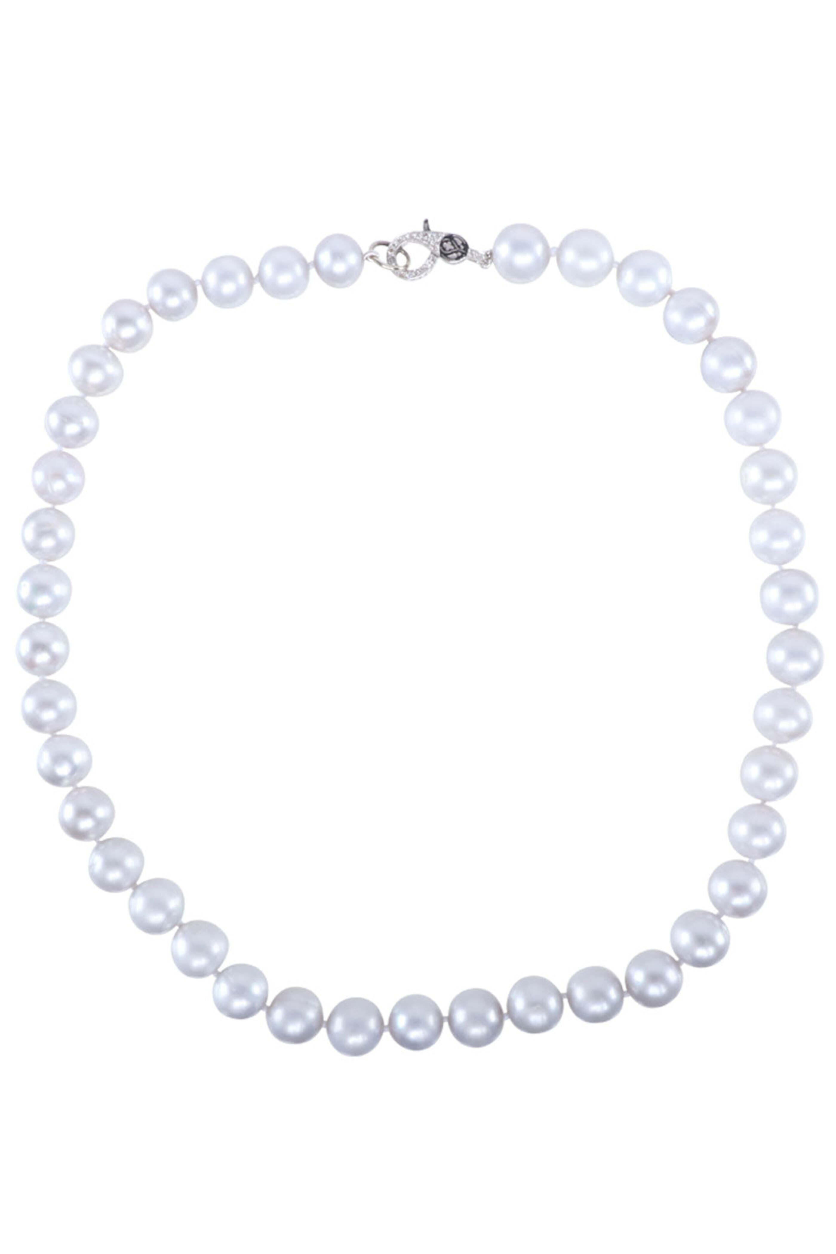 14k white gold. Gray diamond 0.38 total carat weight. Pearl size: 0.39. Pave diamond lobster claw clasps. 17 L.