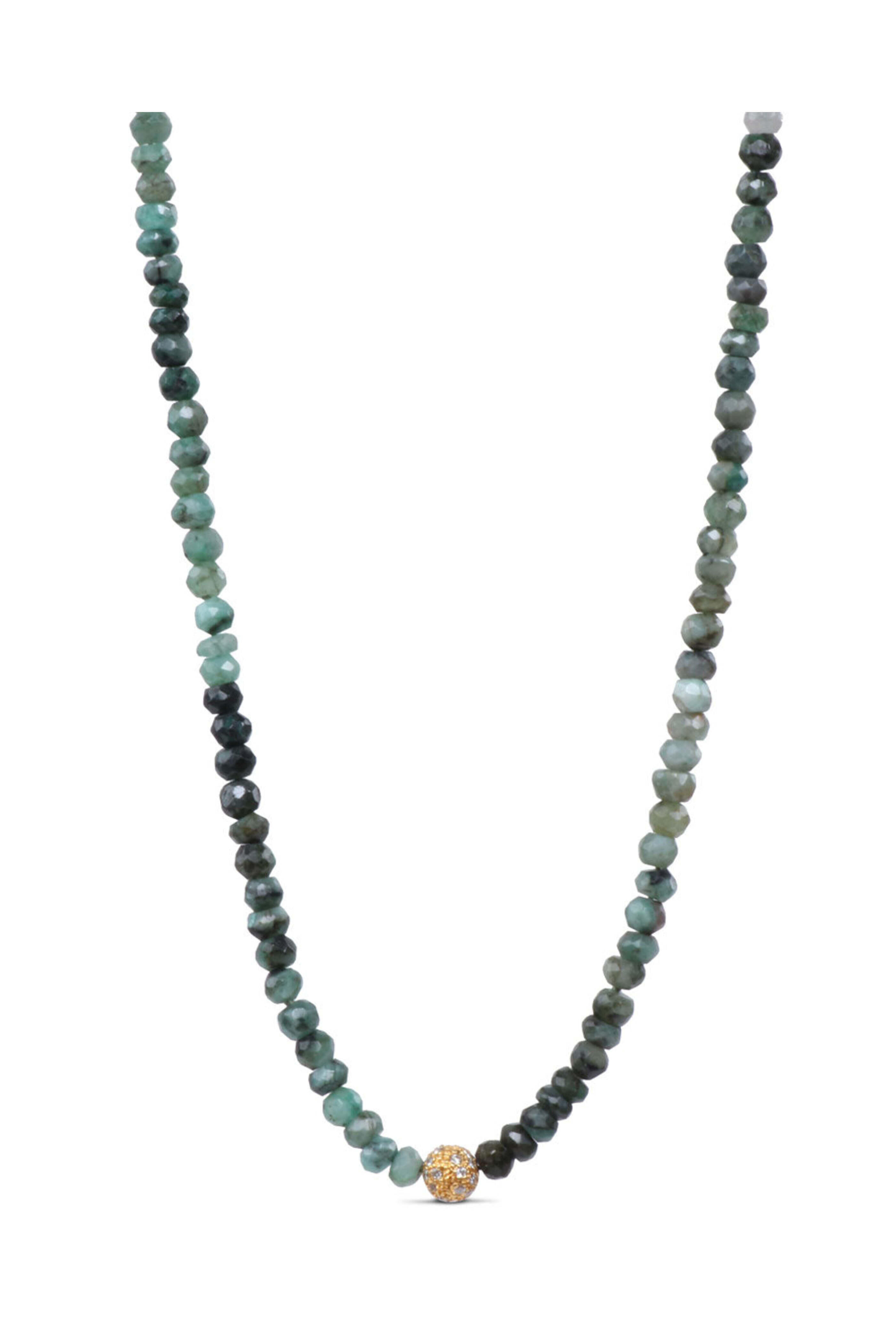 Loree Rodkin Emerald Beaded Necklace. 14k gold. Emerald 17.76 total carat weight. Diamond 0.95 total carat weight. Pavé diamond. Beaded. Single gold diamond bead. Diamond lobster claw clasps.