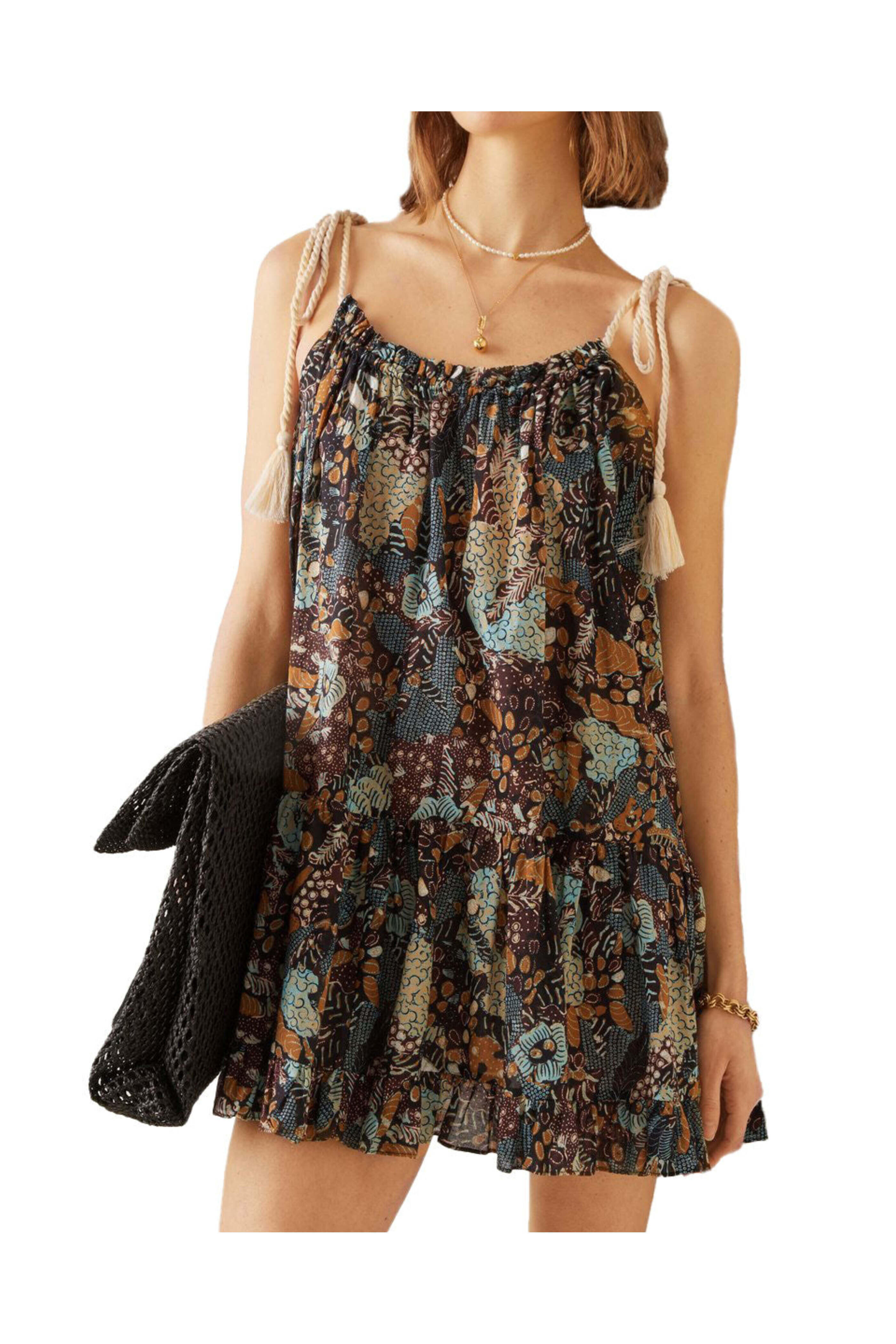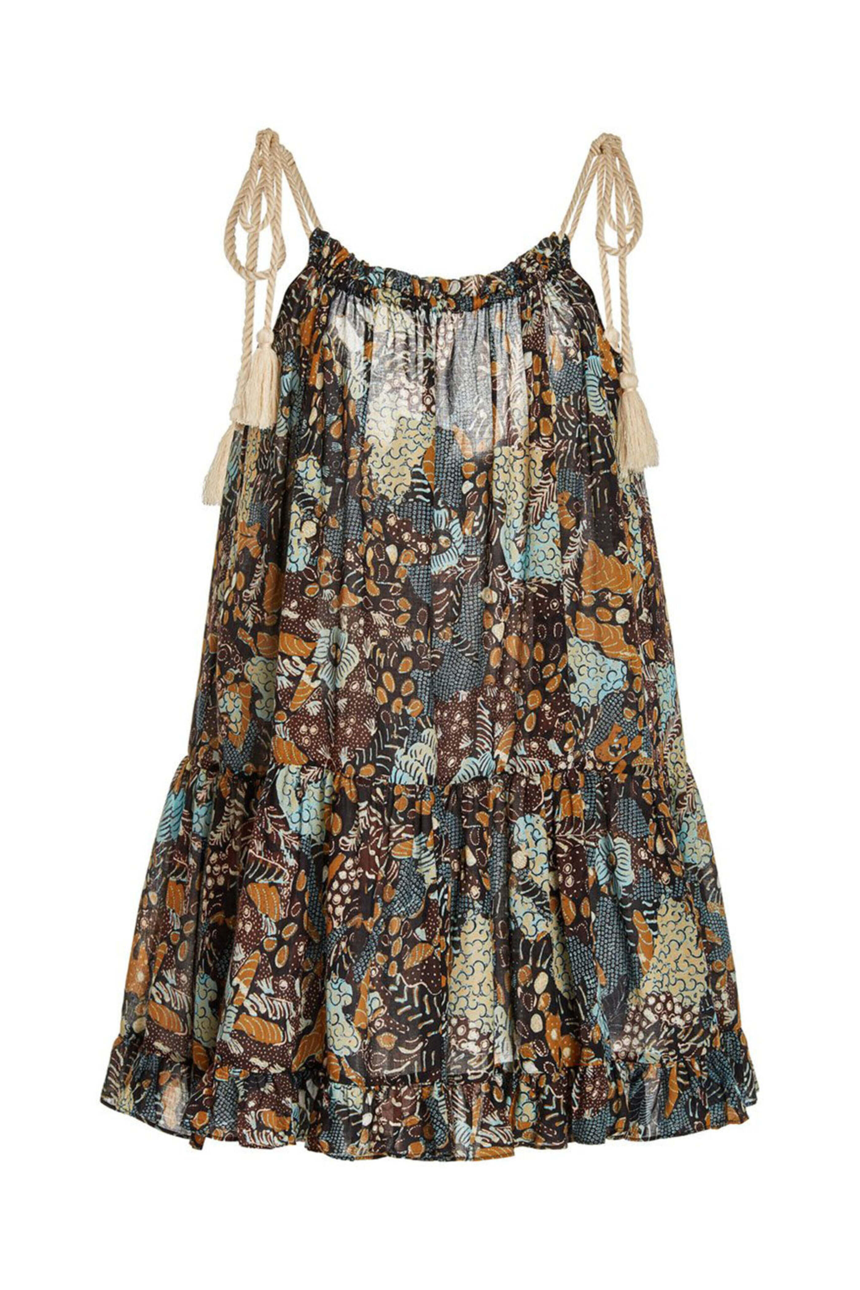 Ulla Johnson Trula Coverup in Batik. Gathered neckline. Adjustable rope ties at shoulder. Ruffled hem. Trapeze style. Relaxed fit. Unlined. Imported. 55% cotton, 45% viscose.