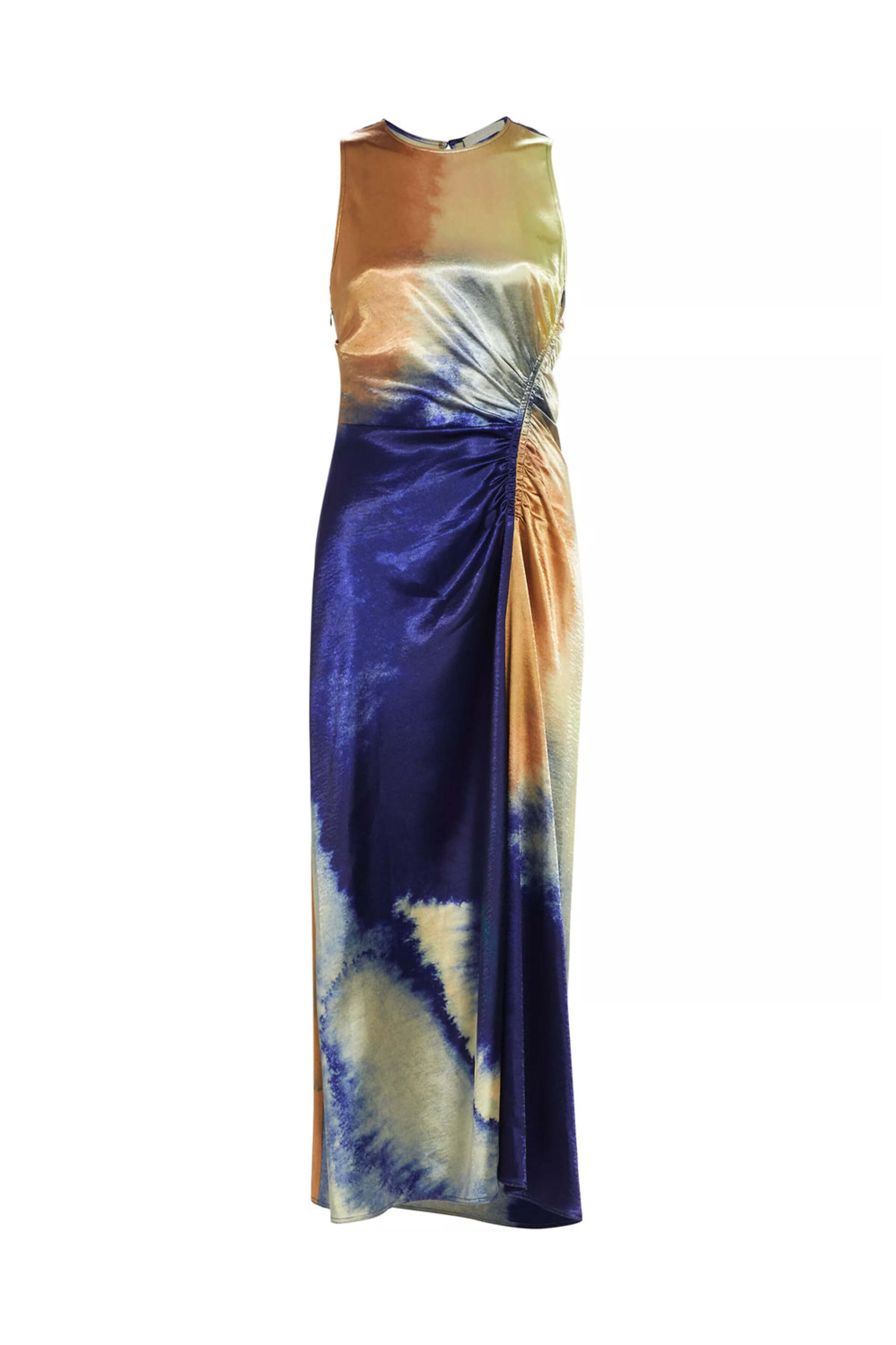 Ulla Johnson Mirage Cordelia Dress. Round neck. Back button closure; keyhole detail. Sleeveless. Ruched detail at front. Slim silhouette. Side hem slit. Midi length. 100% polyester.