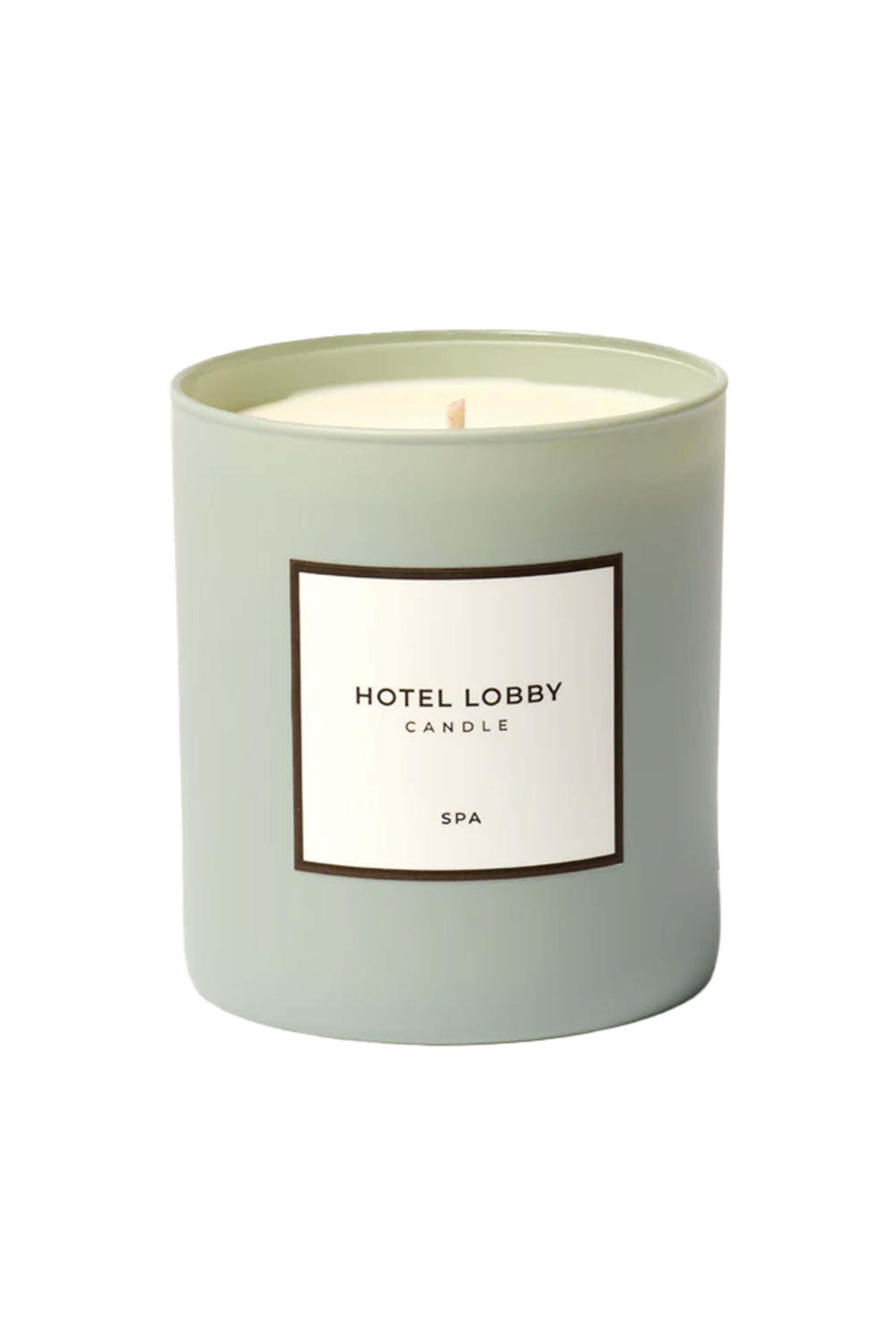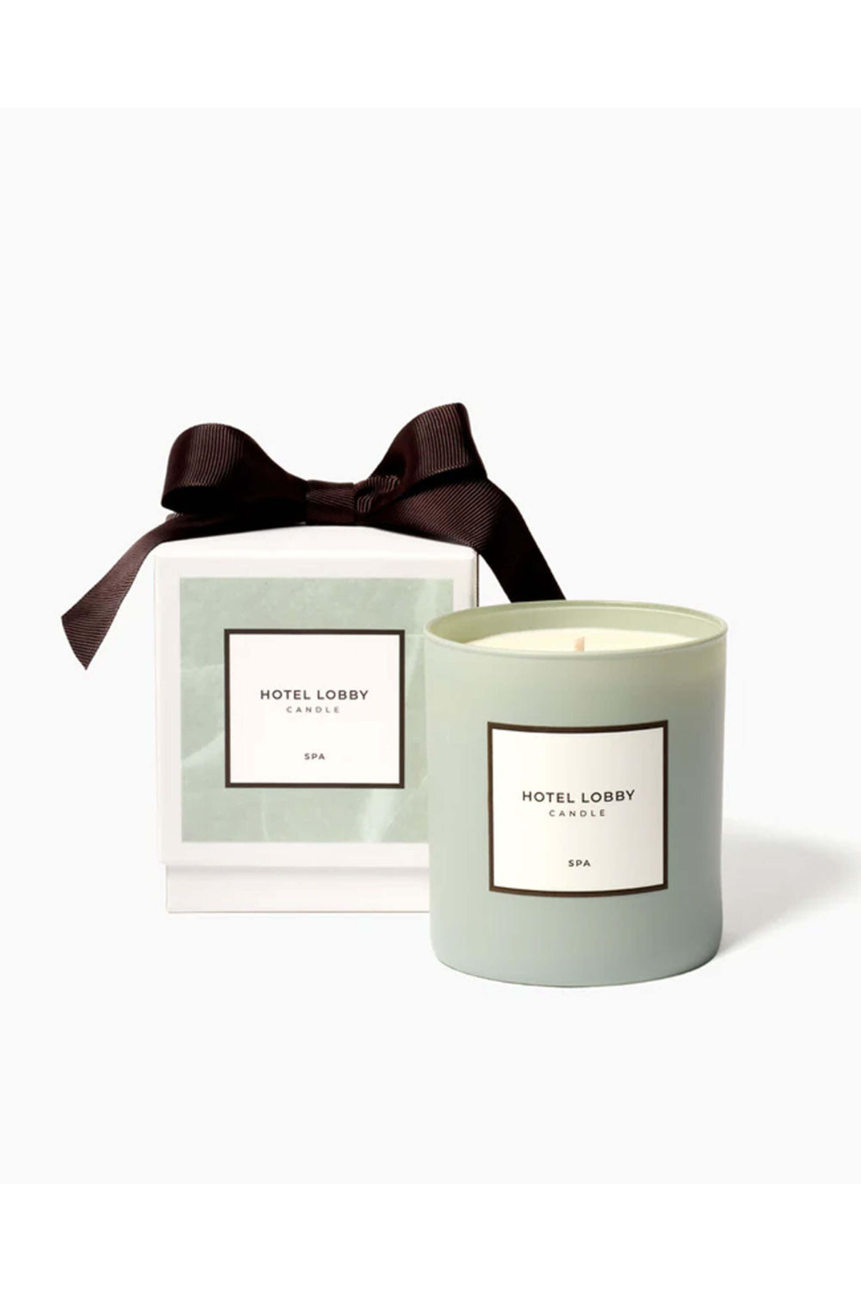 Hotel Lobby Spa Candle. Notes of eucalyptus, water mint, sage, jasmine, and amber. Burn time: 65 hours. Natural soy wax, braided cotton wick. 9.75oz.