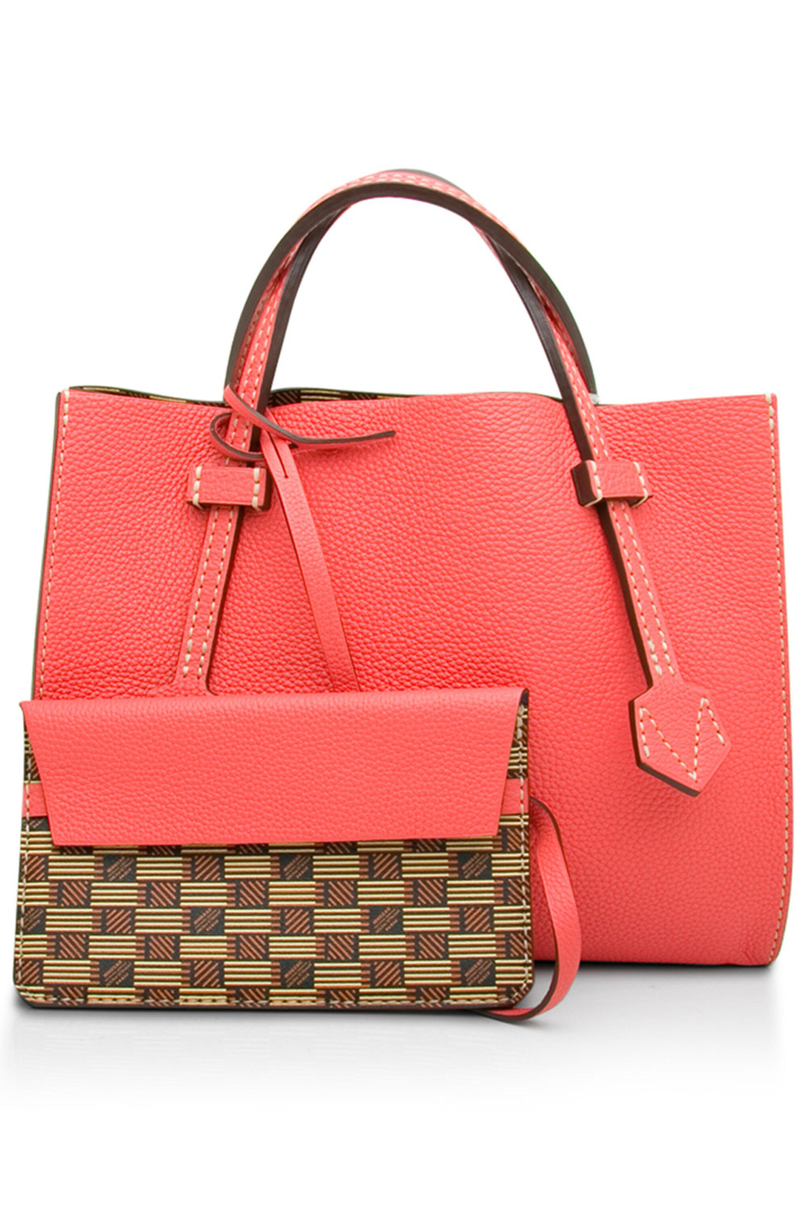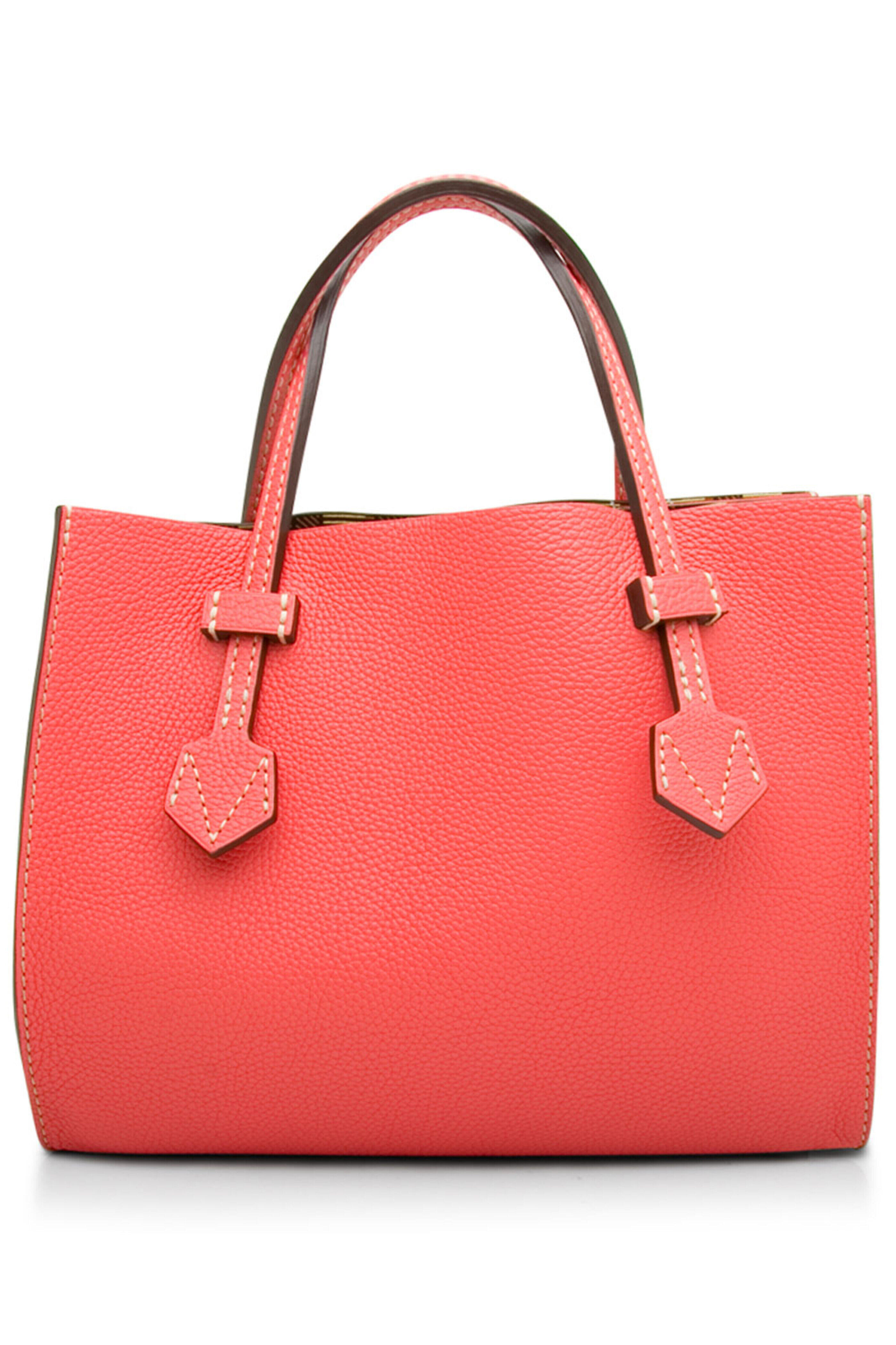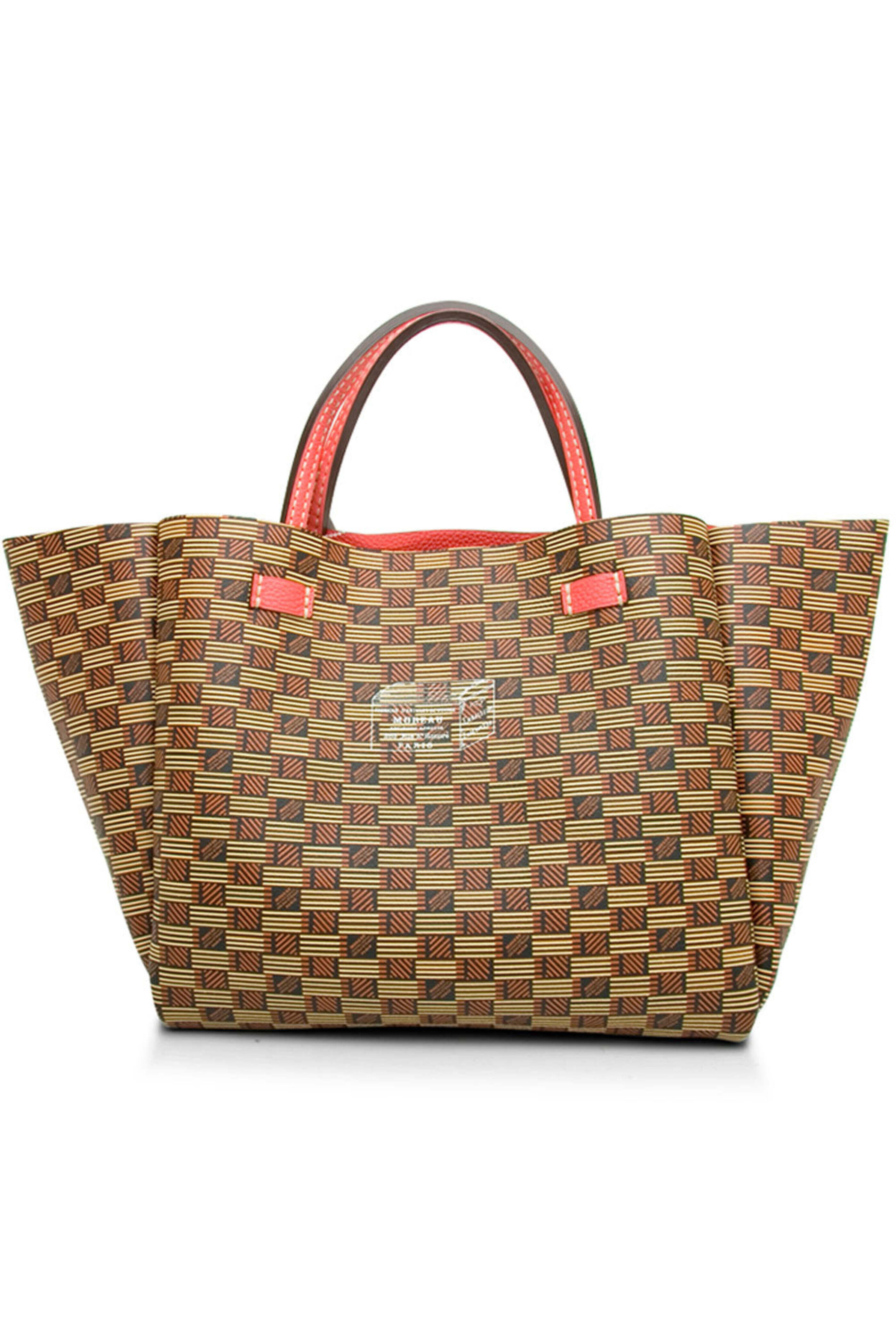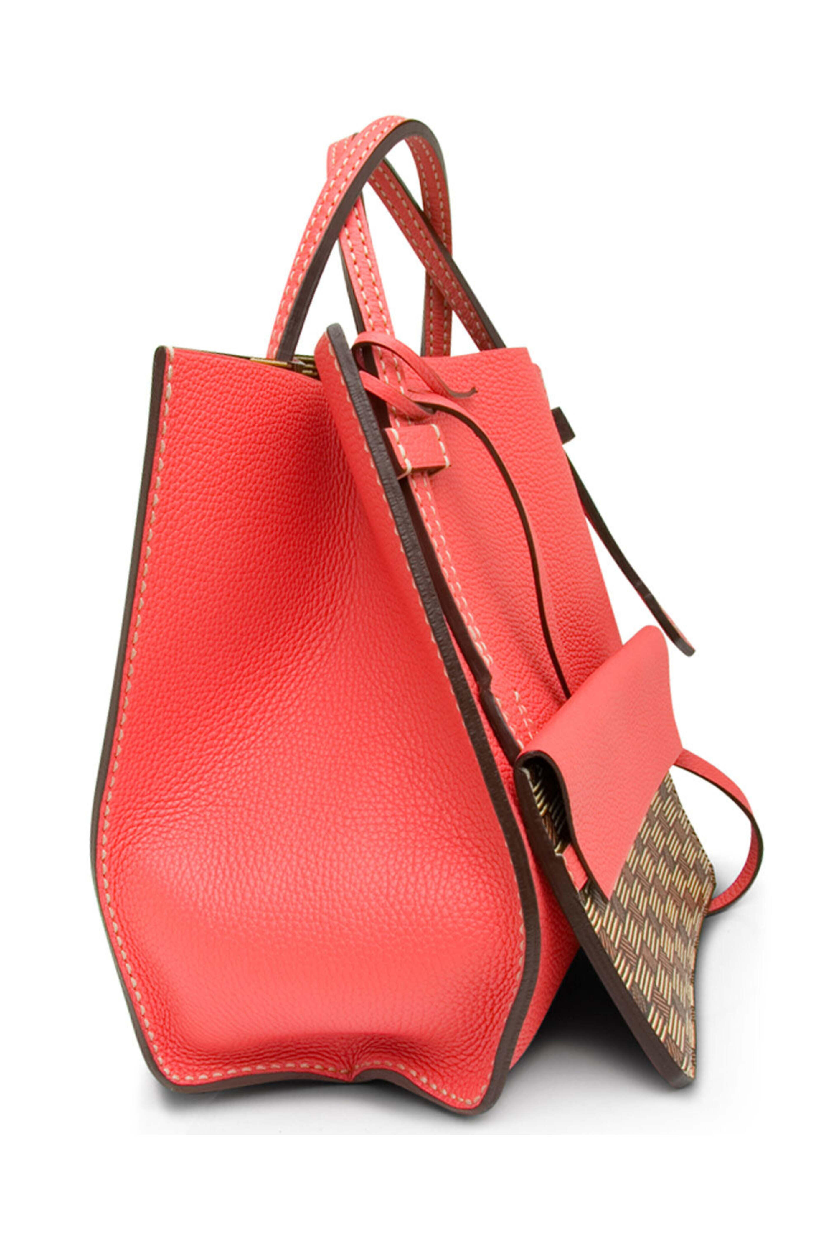 Moreau Bregancon Reversible Tote in Hibiscus. Open top. Double top handles. Removable interior pouch with flap closure. Contrast stitch detail. Reversible style. Signature printed leather and solid grain leather. 13.5 W X 11 L X 8 D. 5.5 X 8.5 pouch. 7 handle drop max. Made in France.