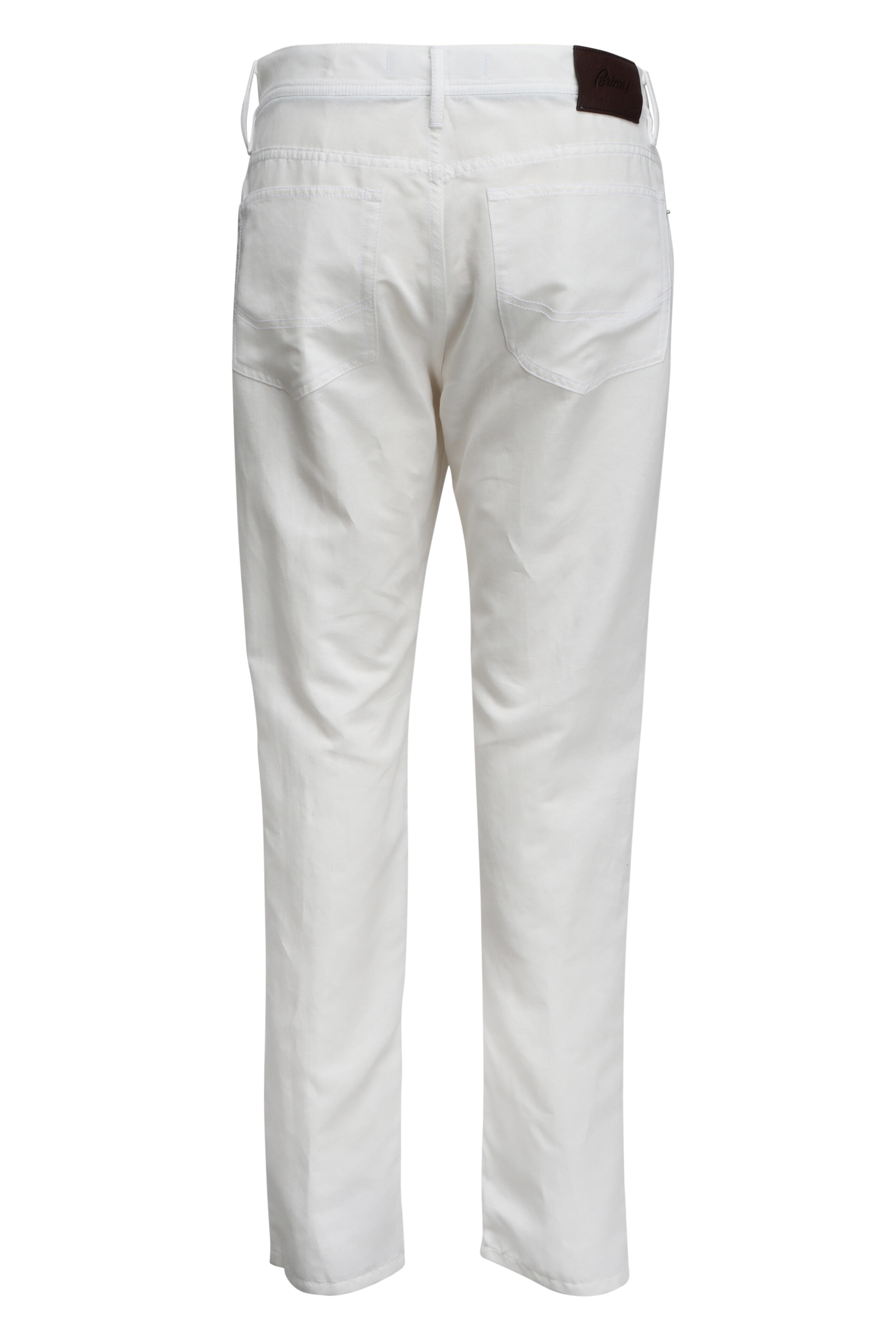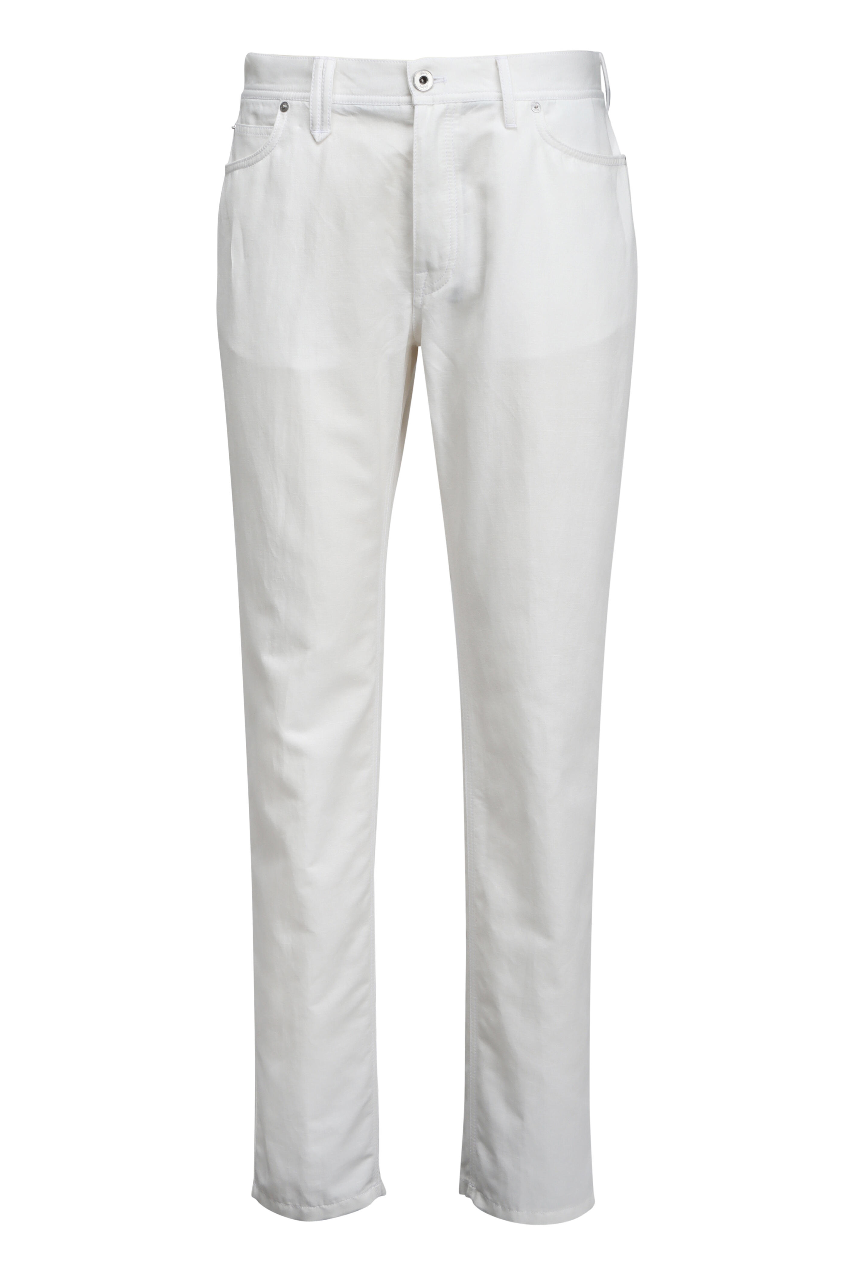 Zip fly; button closure. Banded waist; belt loops. Five pocket styling. Made in Italy. 53% linen, 47% cotton. Dry clean.