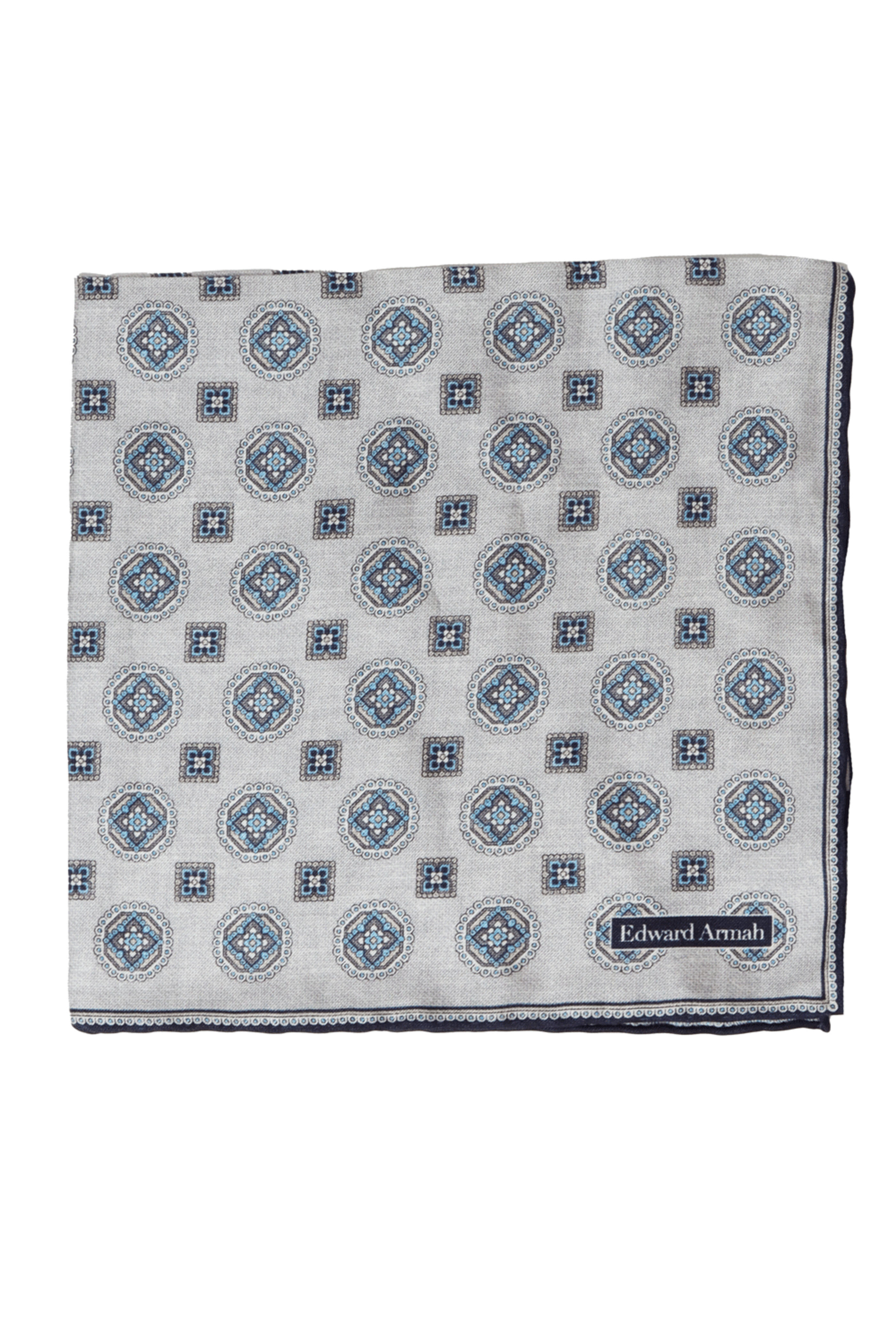 Edward Armah Navy Jacquard Pocket Square. 12 W x 12 L. Made in Italy. Dry clean only. 100% Silk.