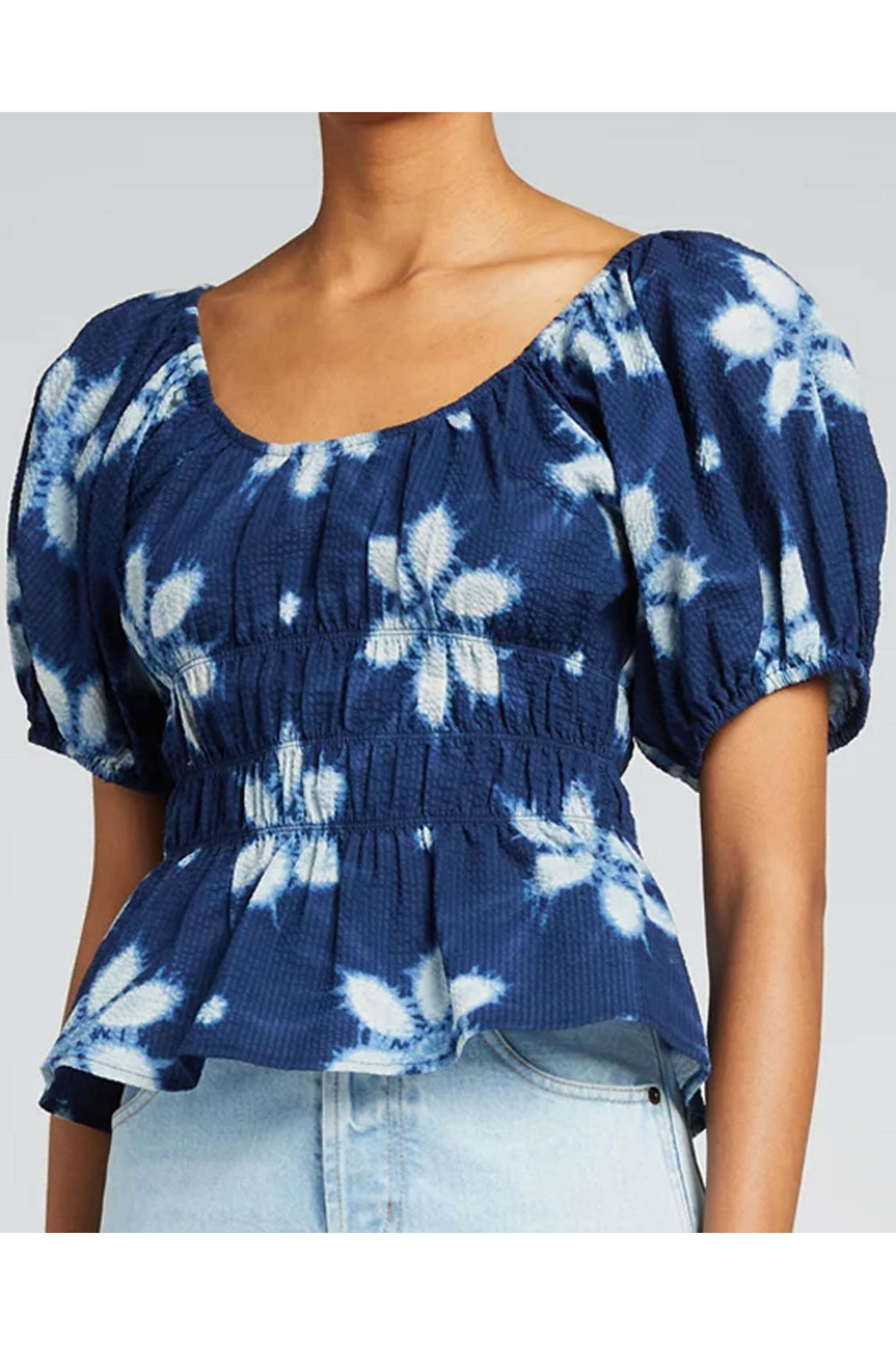 Sea Navy Isla Puff Print Sleeve Top. Wide Scoop neckline. Short sleeves; puff. Relaxed fit. 100% cotton.