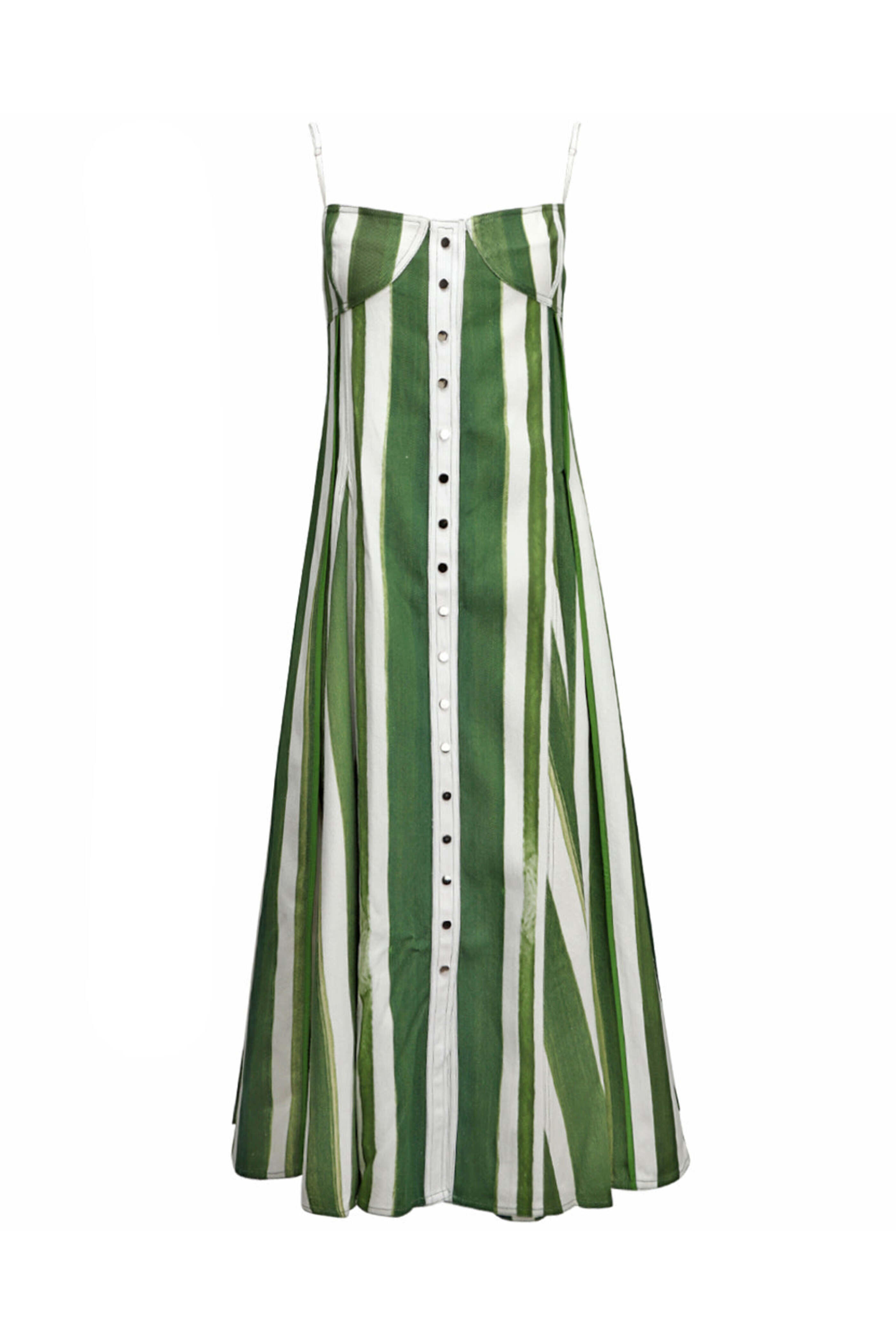 Lovebirds Palm Stripe Jules Dress. Sweetheart neck. Square back. Sleeveless; thin shoulder straps. Button down front closure. Aline silhouette. Midi length. Denim fabrication. 100% cotton.