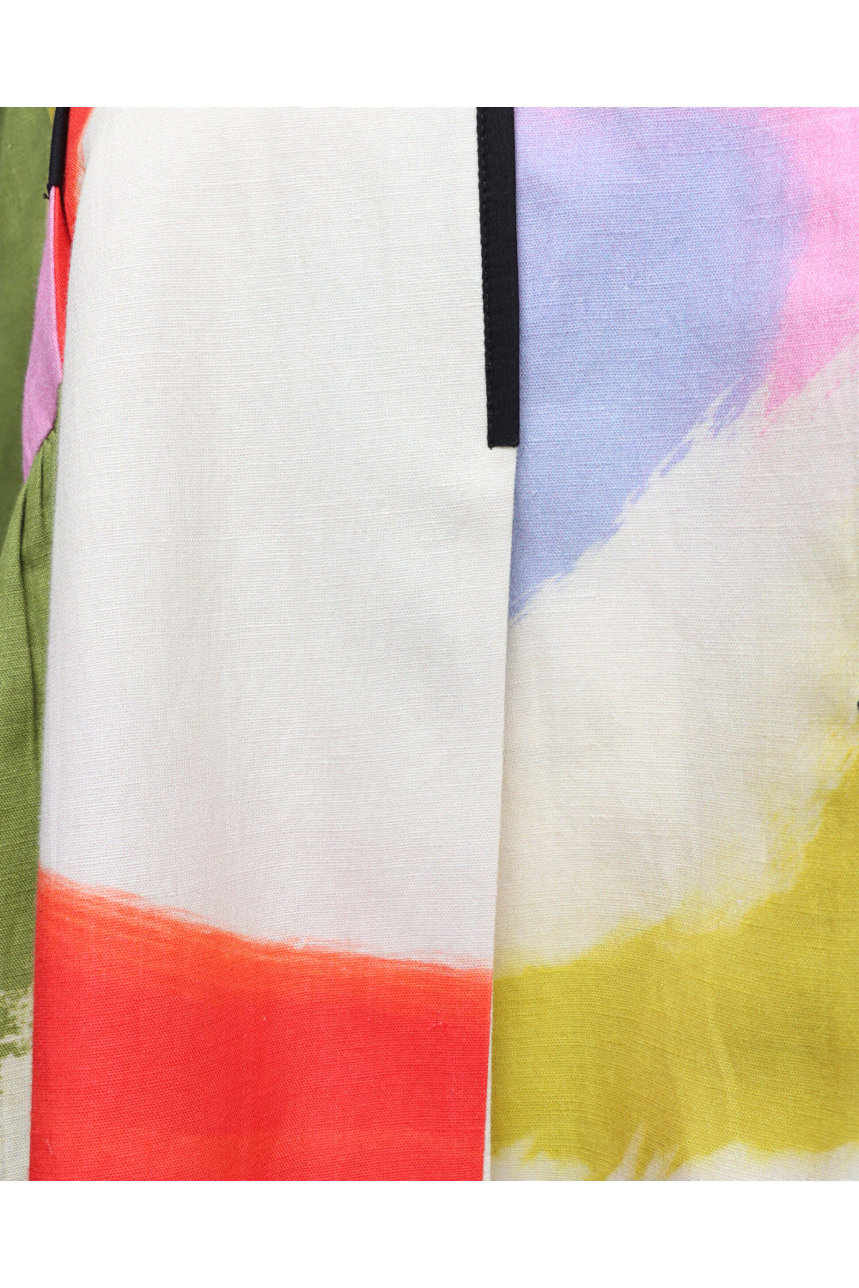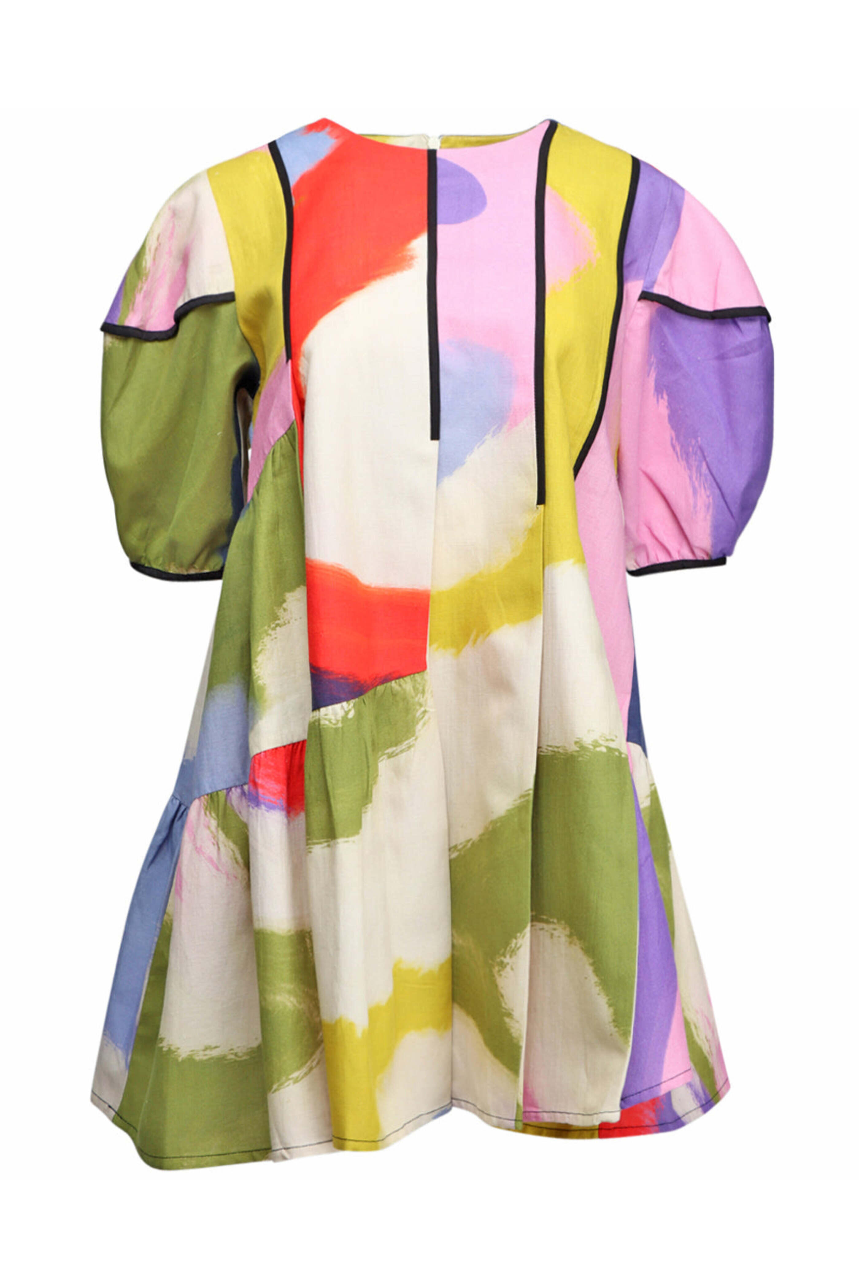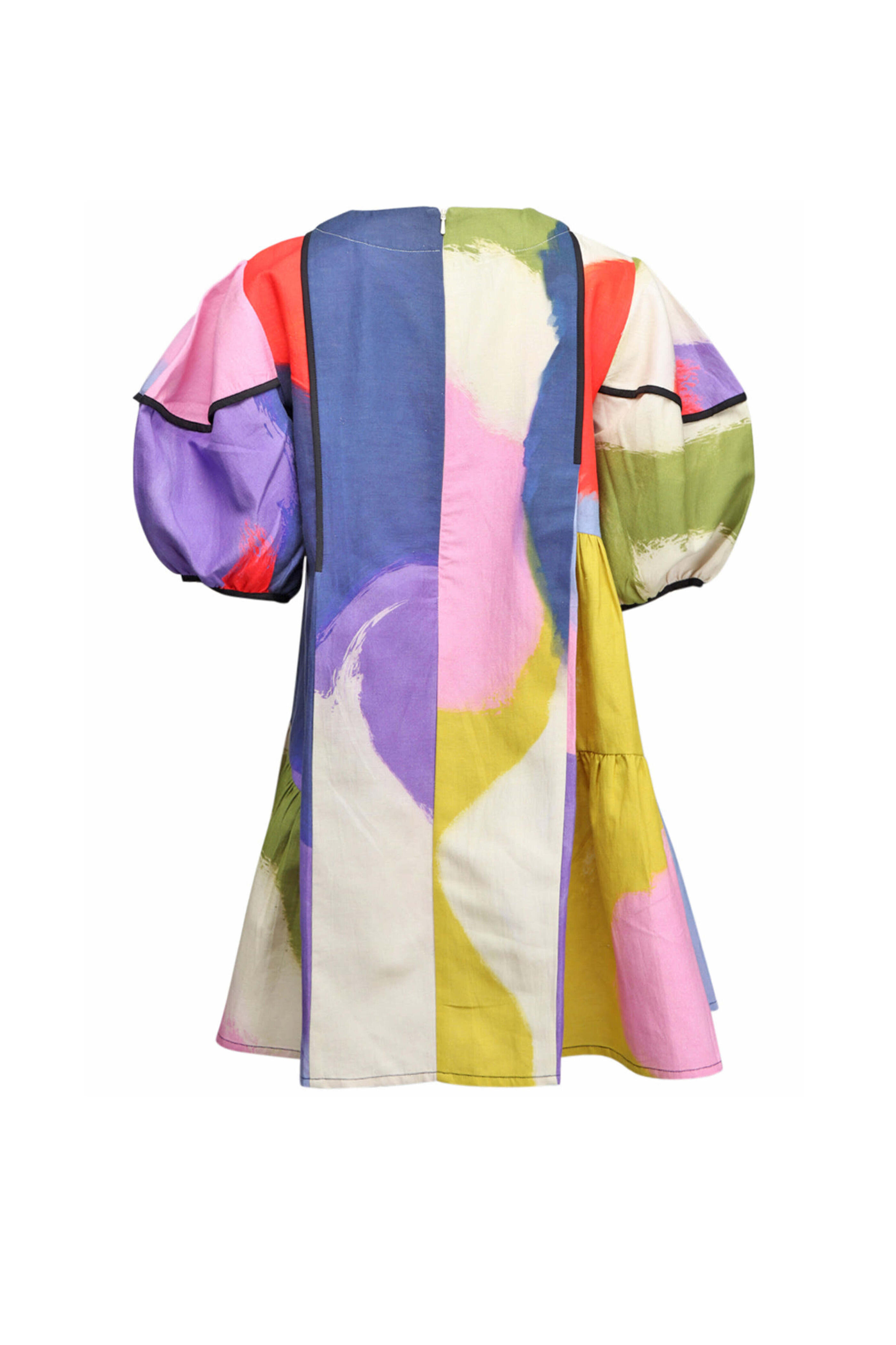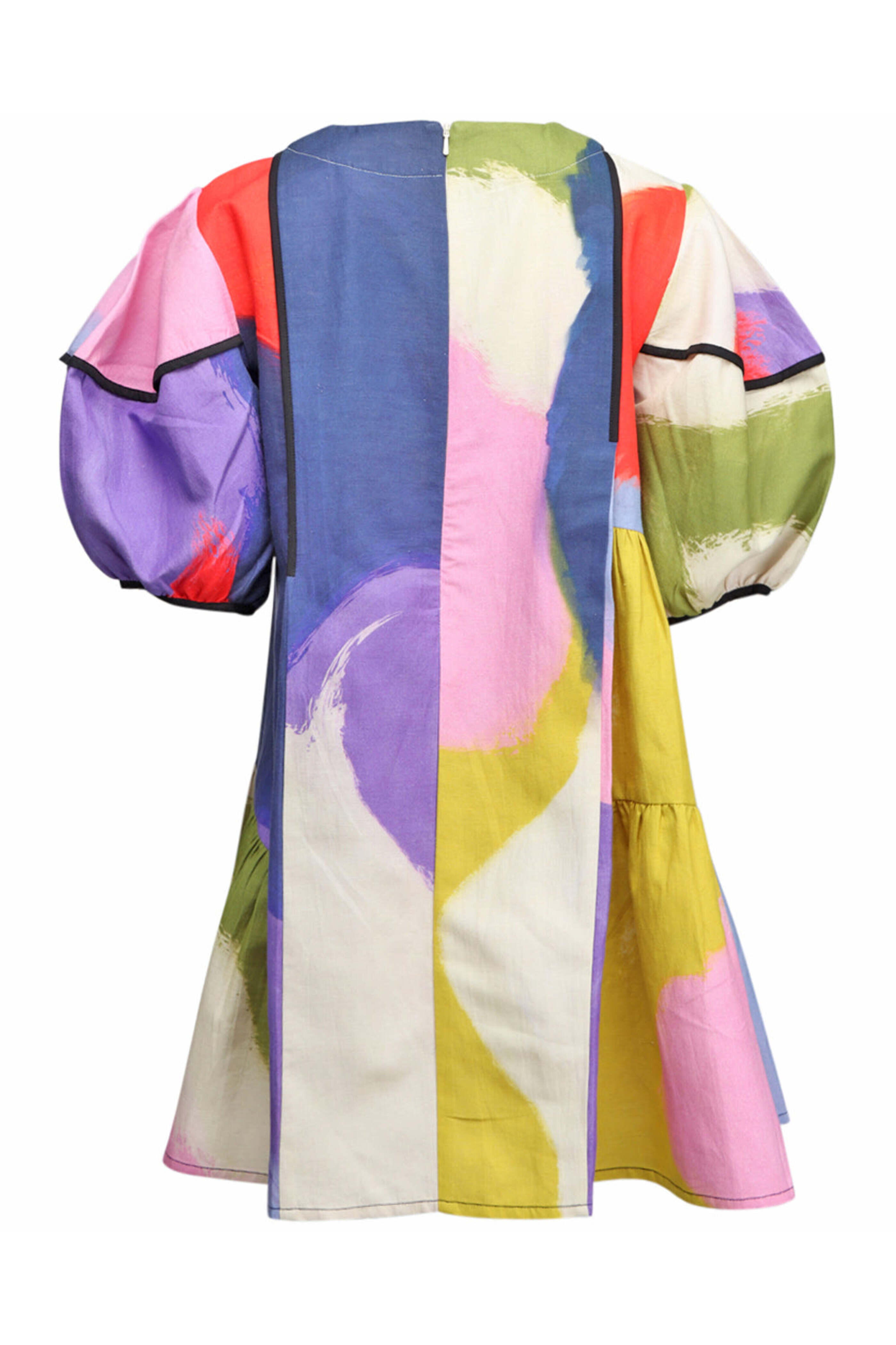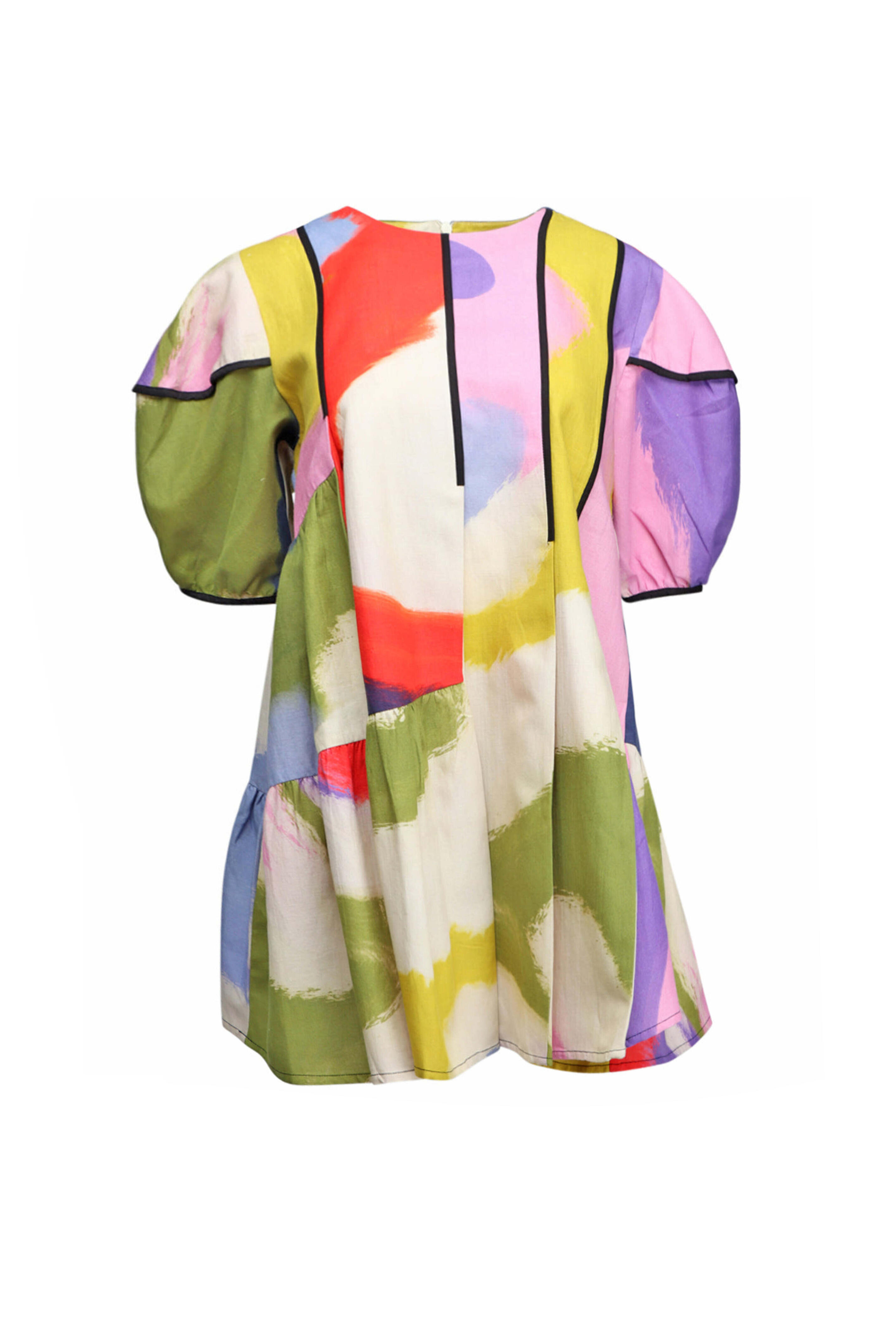 Lovebirds Luminous Cynthia Dress. Round neck. Elbow length puff sleeves. Concealed back zip closure. Relaxed fit. Tiered silhouette. Mini length. 60% linen, 40% cotton.