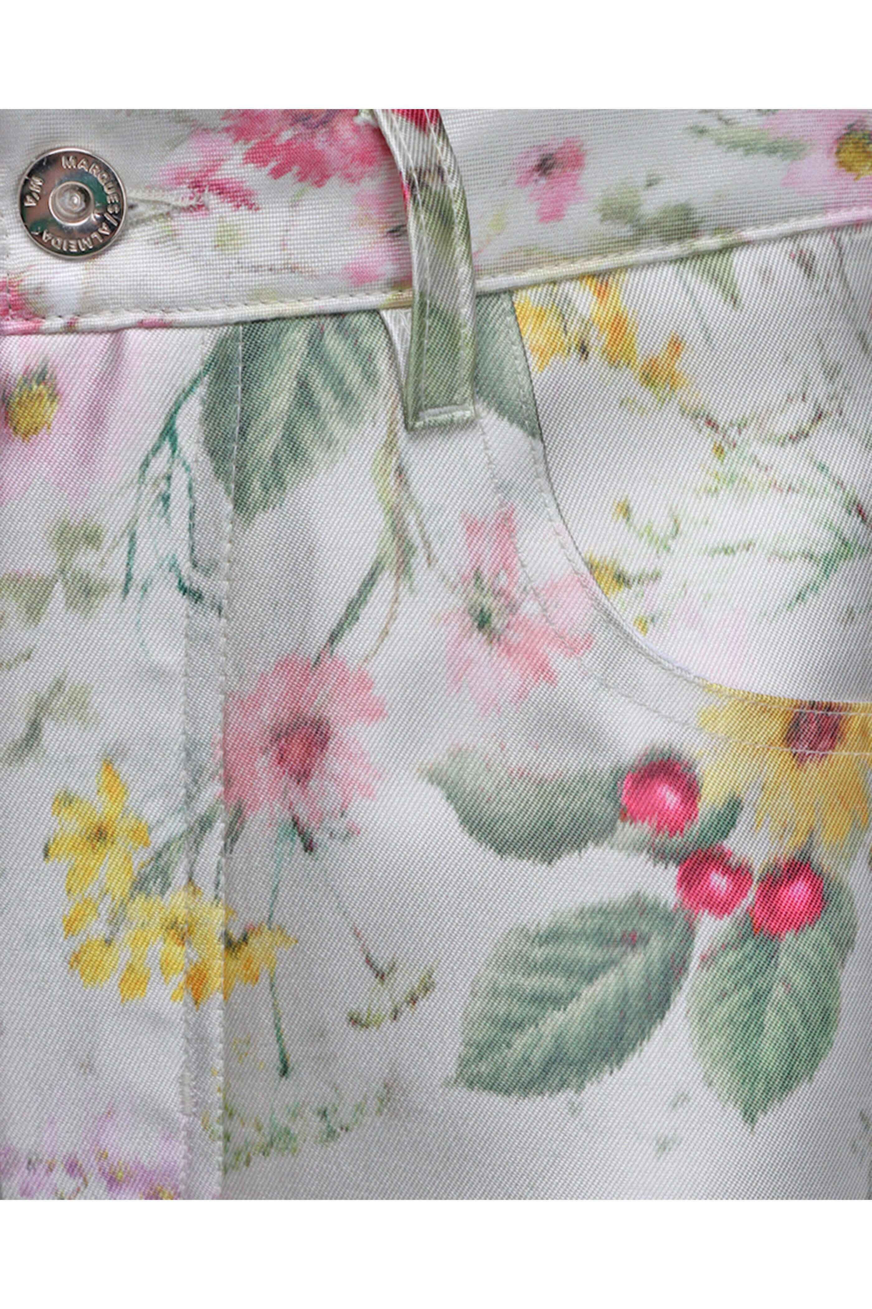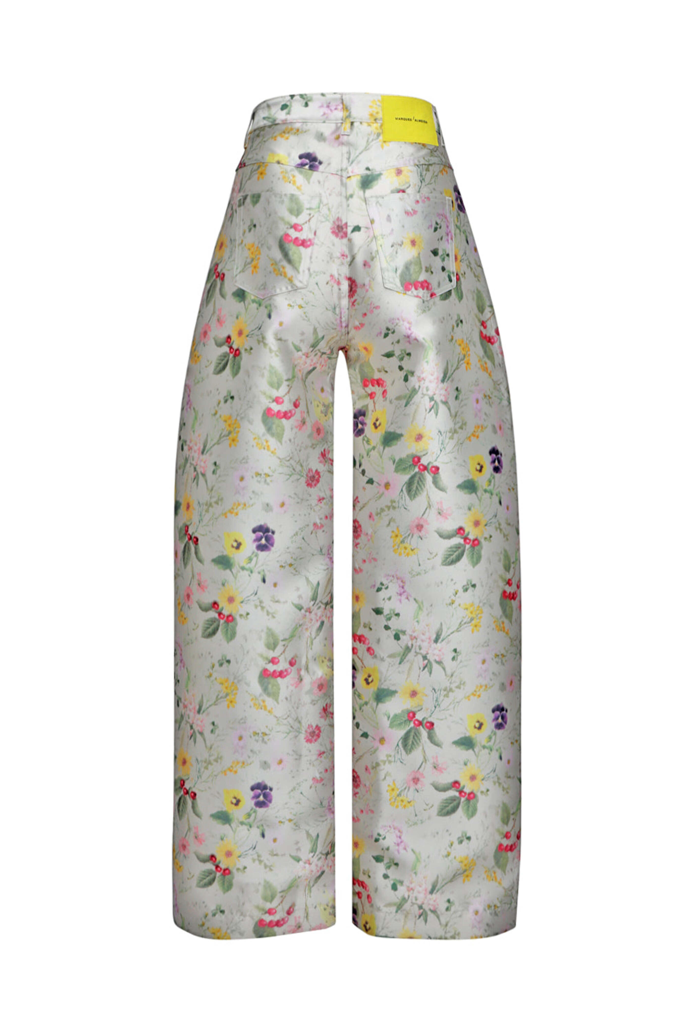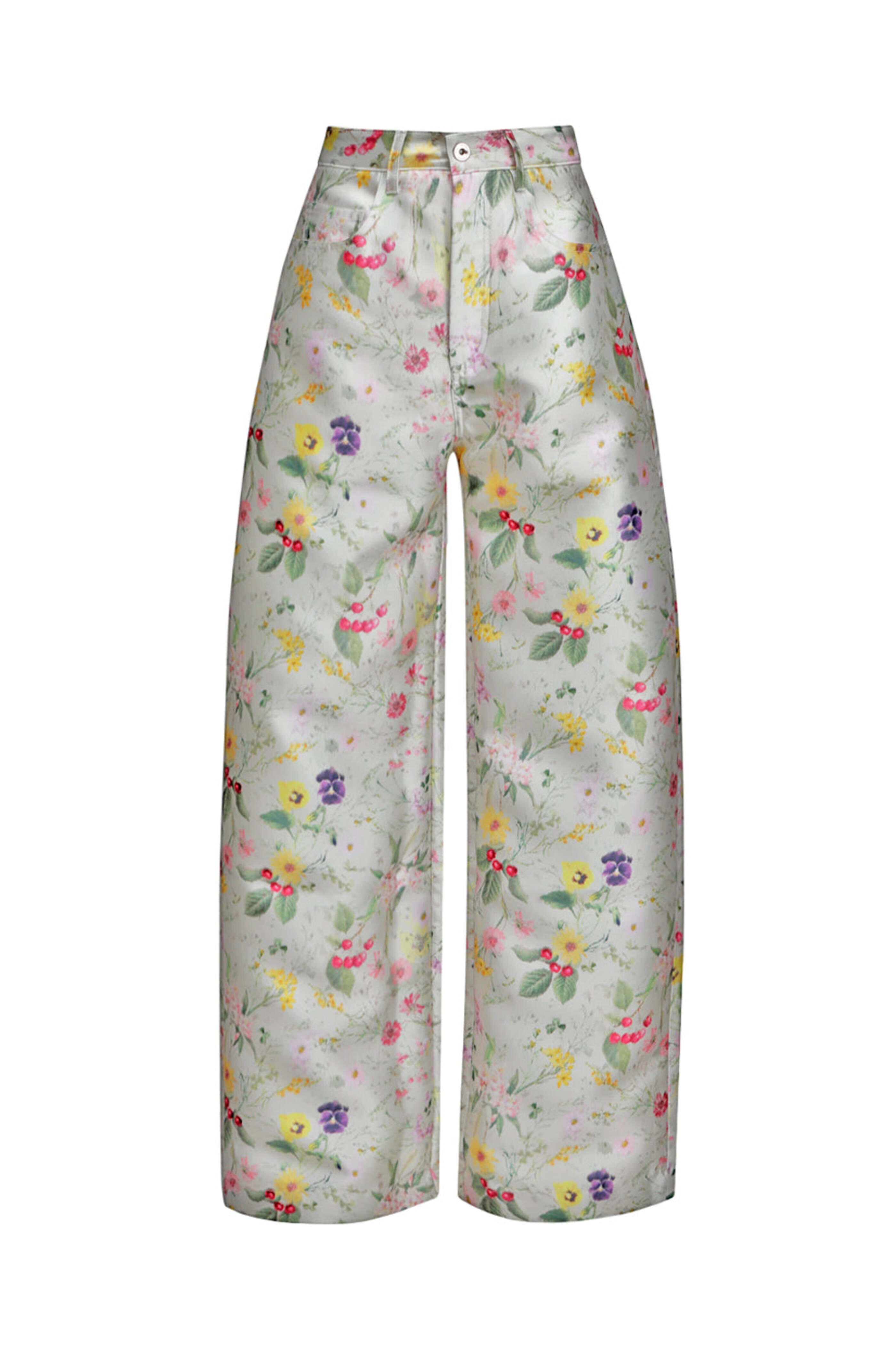 Marques Almeida White Floral Boyfriend Pant. High rise. Button closure. Zip fly. Belt loops. Five pocket style. Wide barrel legs. Full length. 100% polyester.