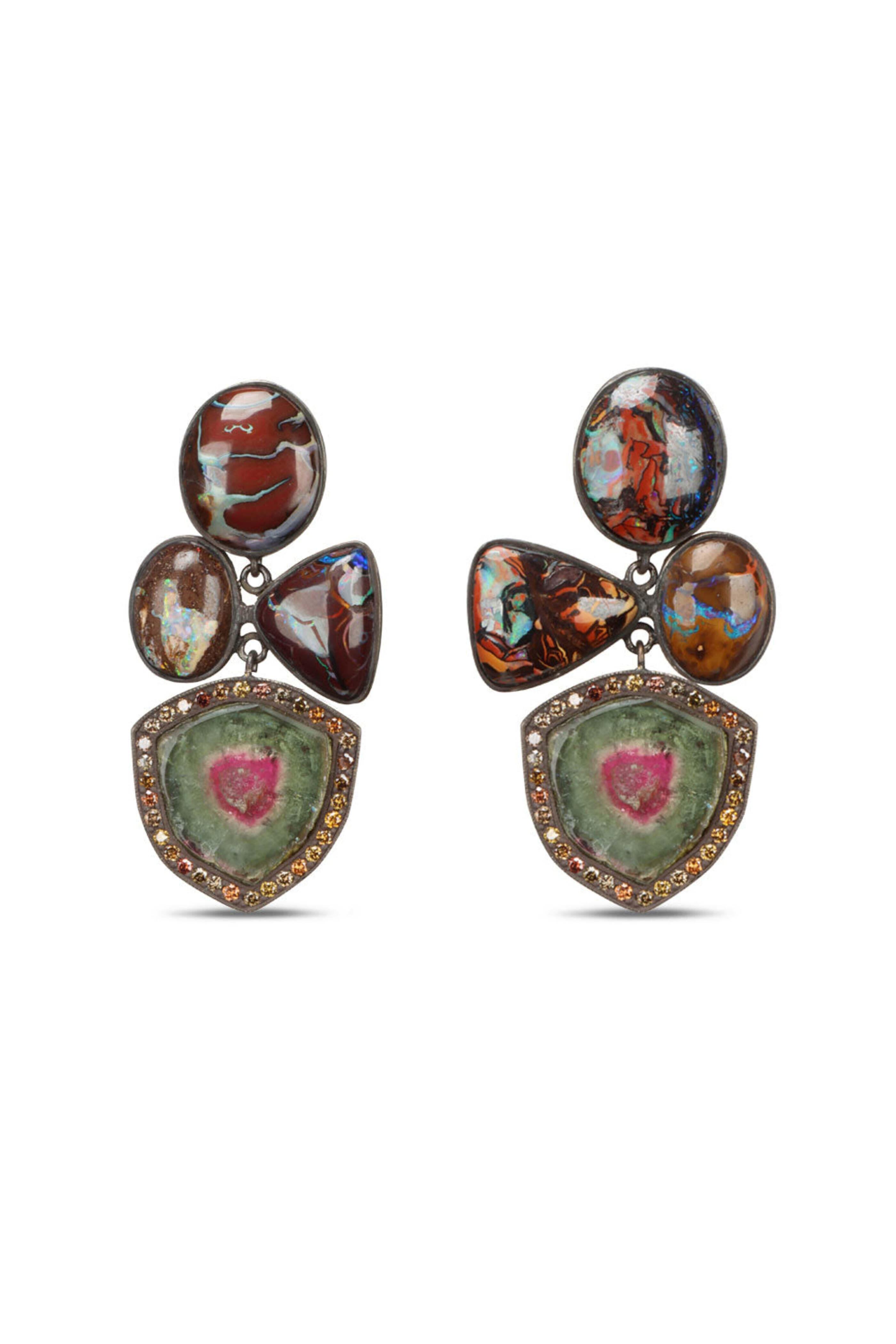 18k gold. Diamond 1.42 total carat weight. Orange diamond. Watermelon tourmaline. Opal. Twig detailing. Cluster top. Diamond halo. Drop style. Push back post.