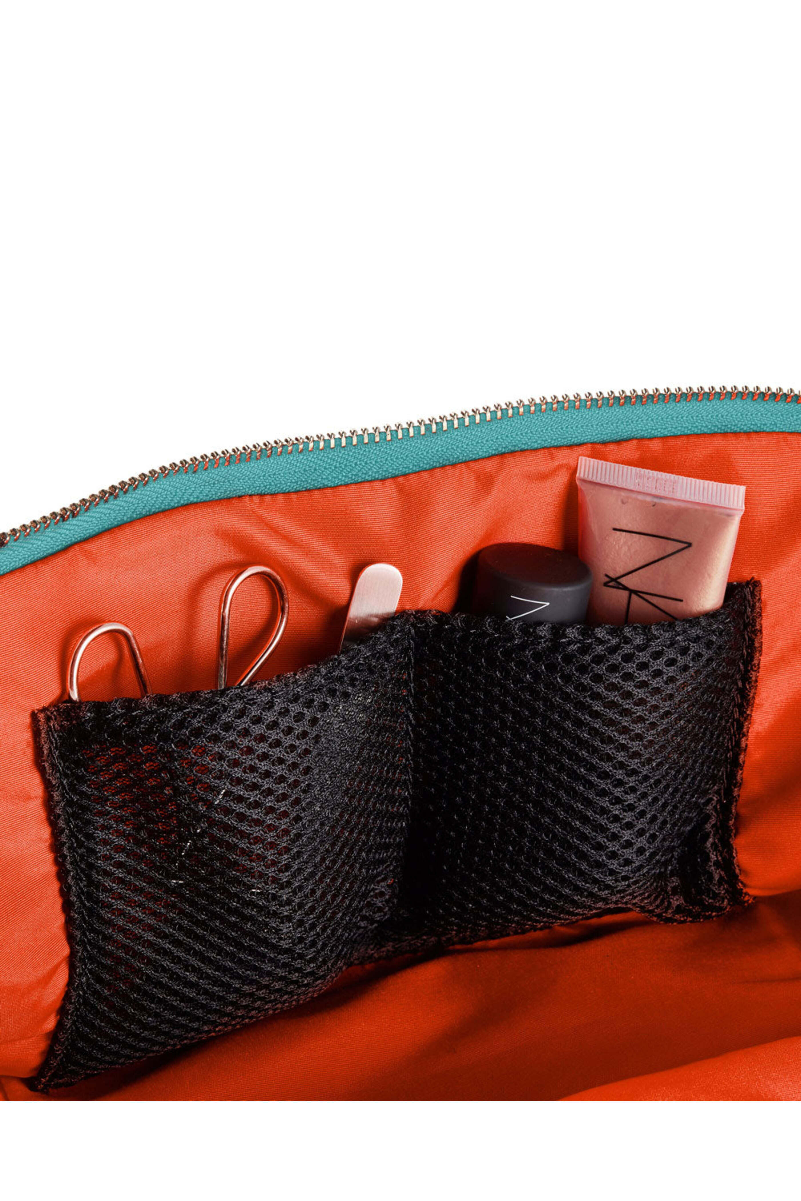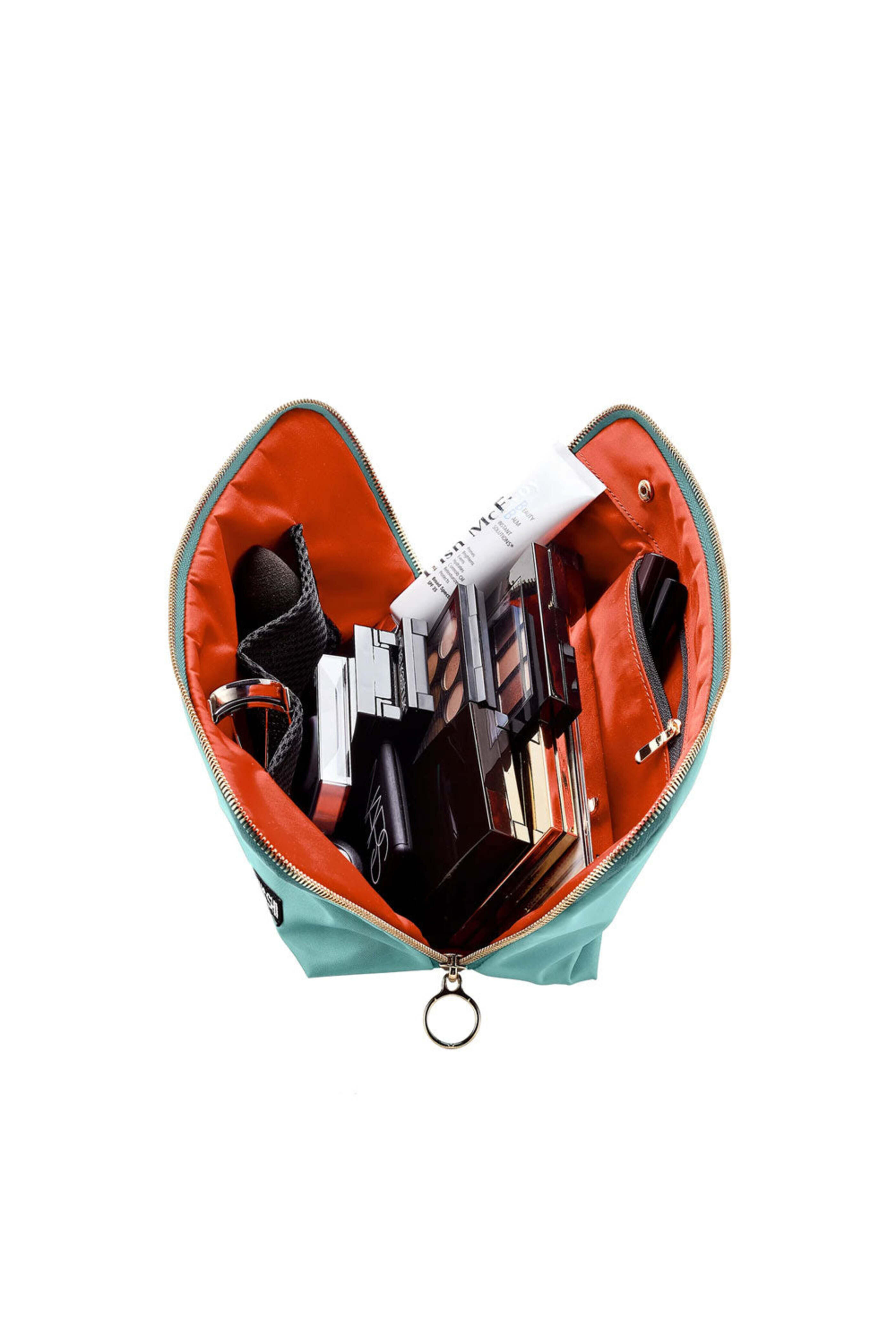Exterior zipper on 3 sides. Interior zip and double mesh pockets. Gold plated hardware. Kusshi signature logo. Innovative flat bottom design allows bag to stand up on its own. Nylon interior. 11.5W x 6H x 5D. Holds 15-20 products. Machine washable with luxury Micro satin exterior.