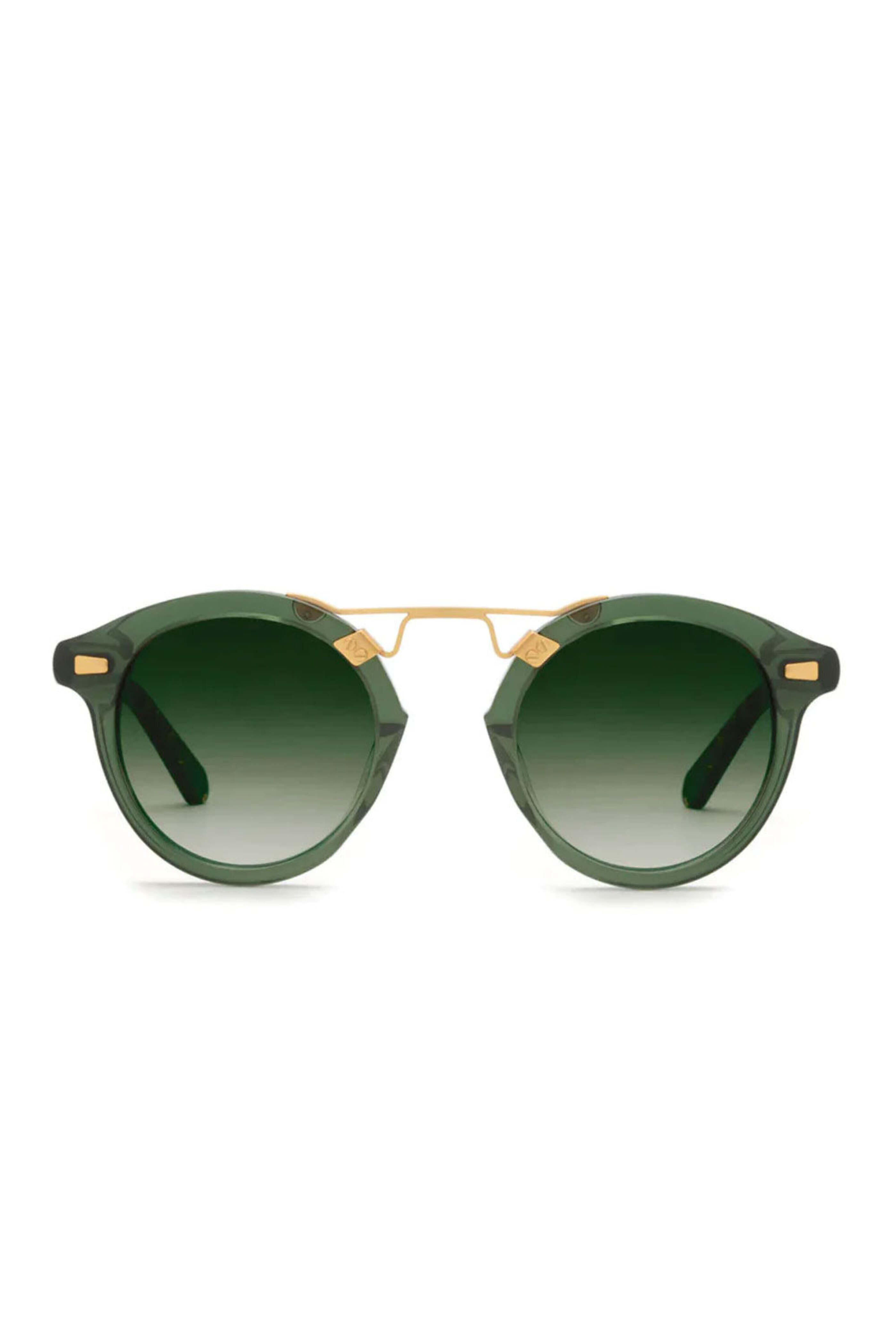 KREWE STL II Sunglasses in Bottle Green. Dark green gradient lens. 24K gold plated hardware. Handcrafted, luxury acetate sunglasses. Prescription ready. Premium hard case. Microfiber cleaning cloth. Size 48-25-145. 100% UVA / UVB protection.